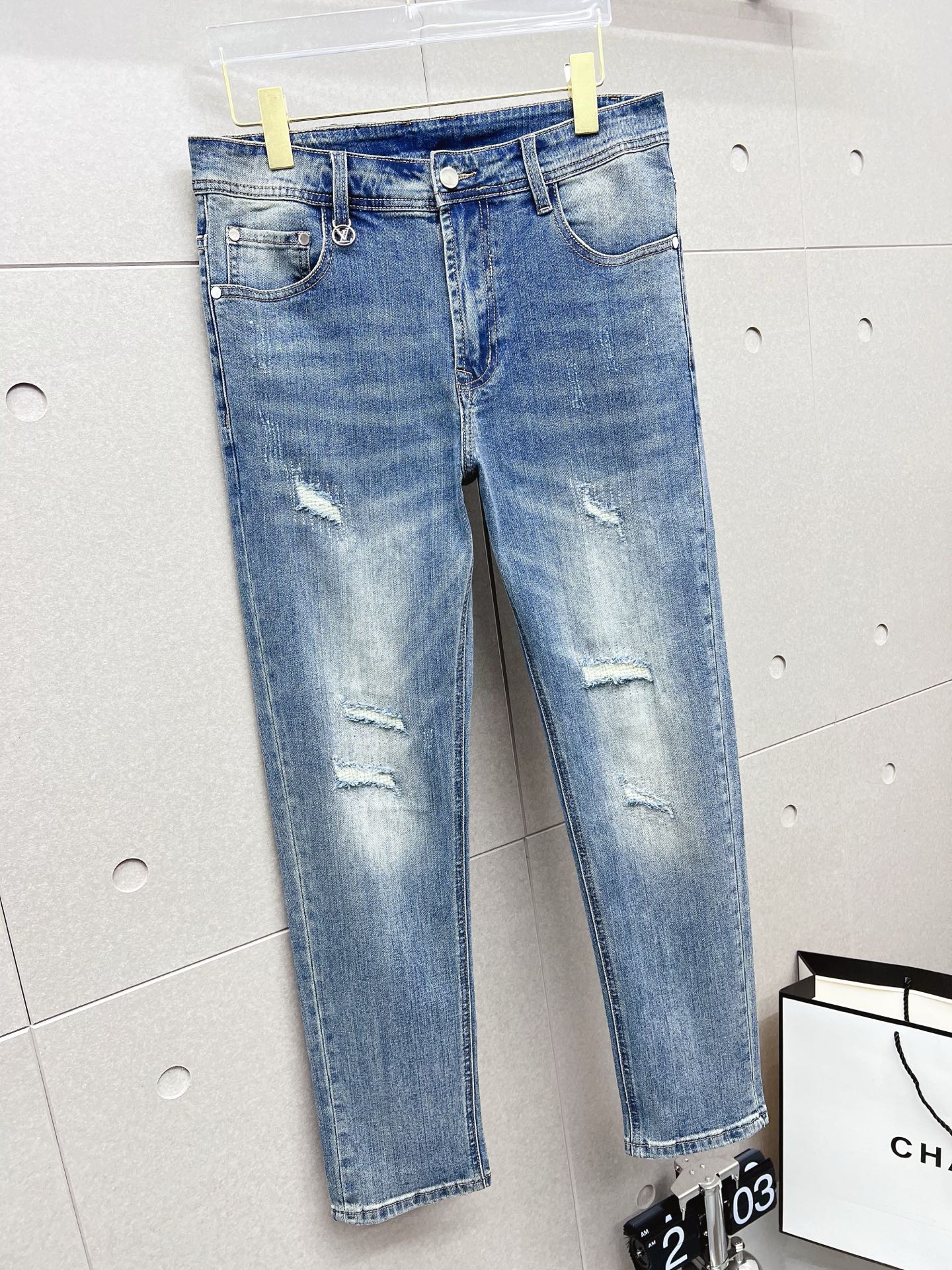 LV Thin Denim Jeans. 2025 latest style. 98% cotton, 2% spandex. Solid, slightly stretchy, comfortable. Simple design, hidden zipper, embossed pockets. Excellent fit.