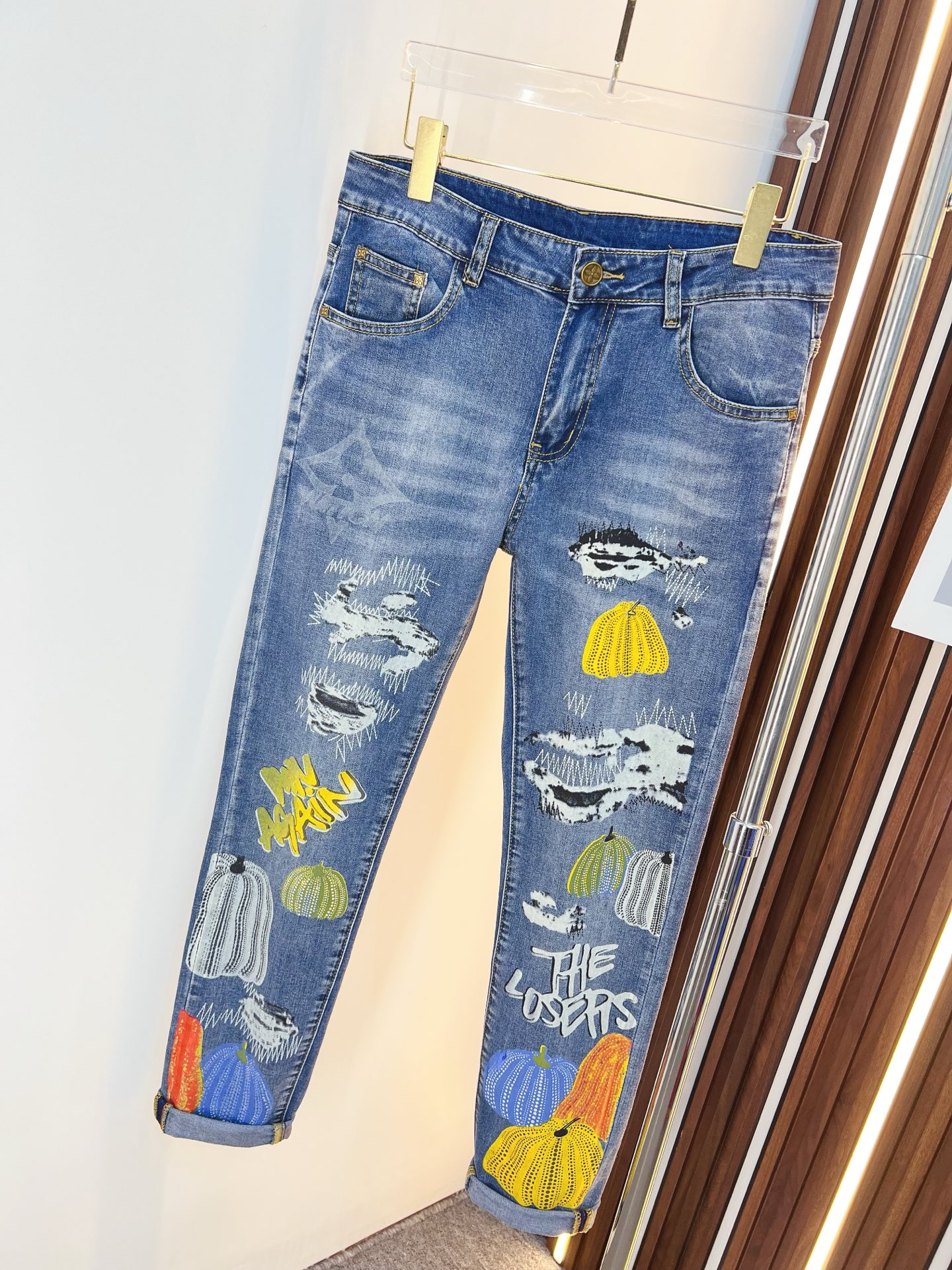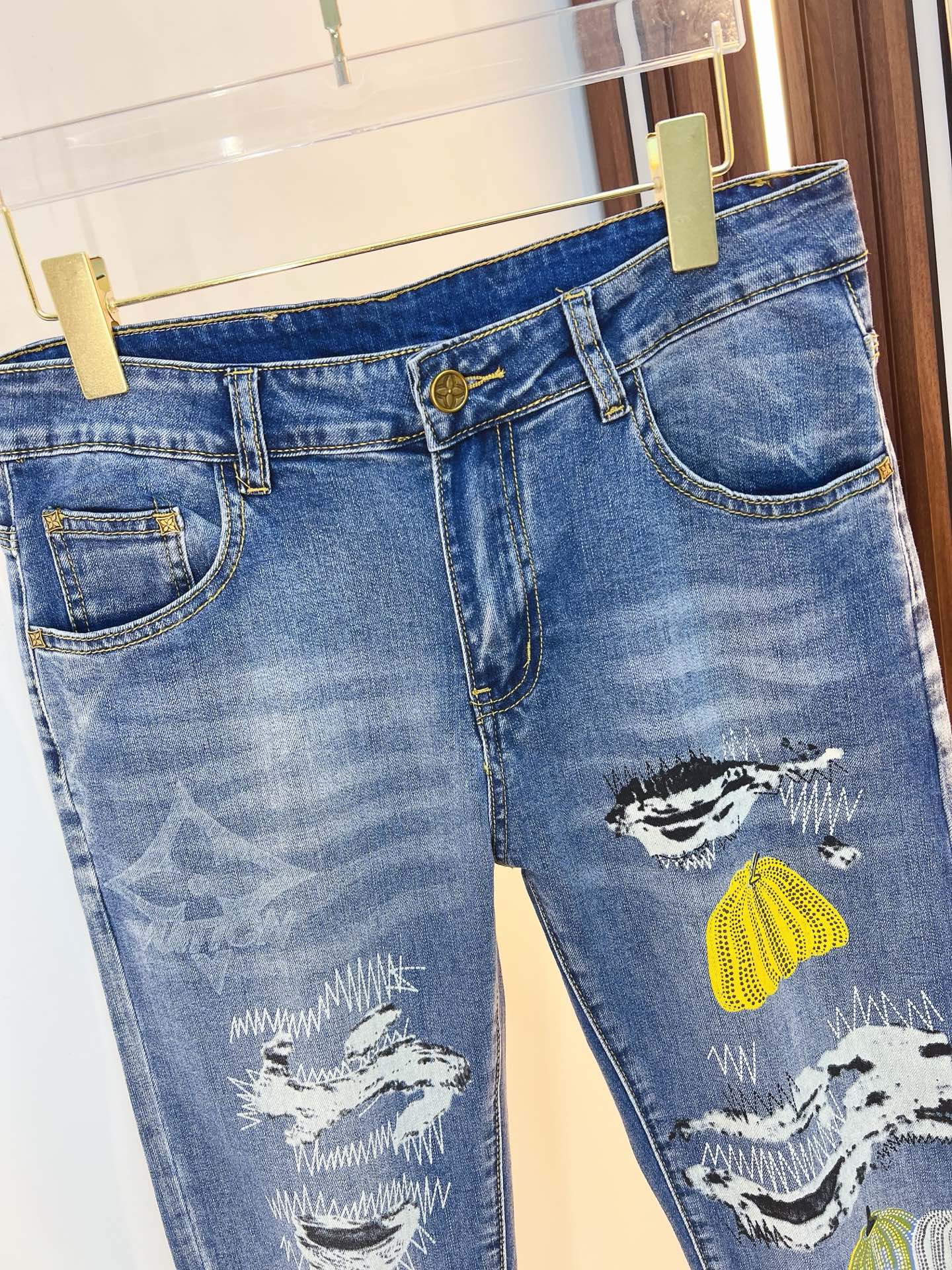 LV men's denim jeans. Premium imported fabric, 13oz Japanese denim, eco-friendly enzyme wash. Soft yet structured with a retro hue. Perfect fit, versatile styling. Sizes 29-38 (no 35,37).