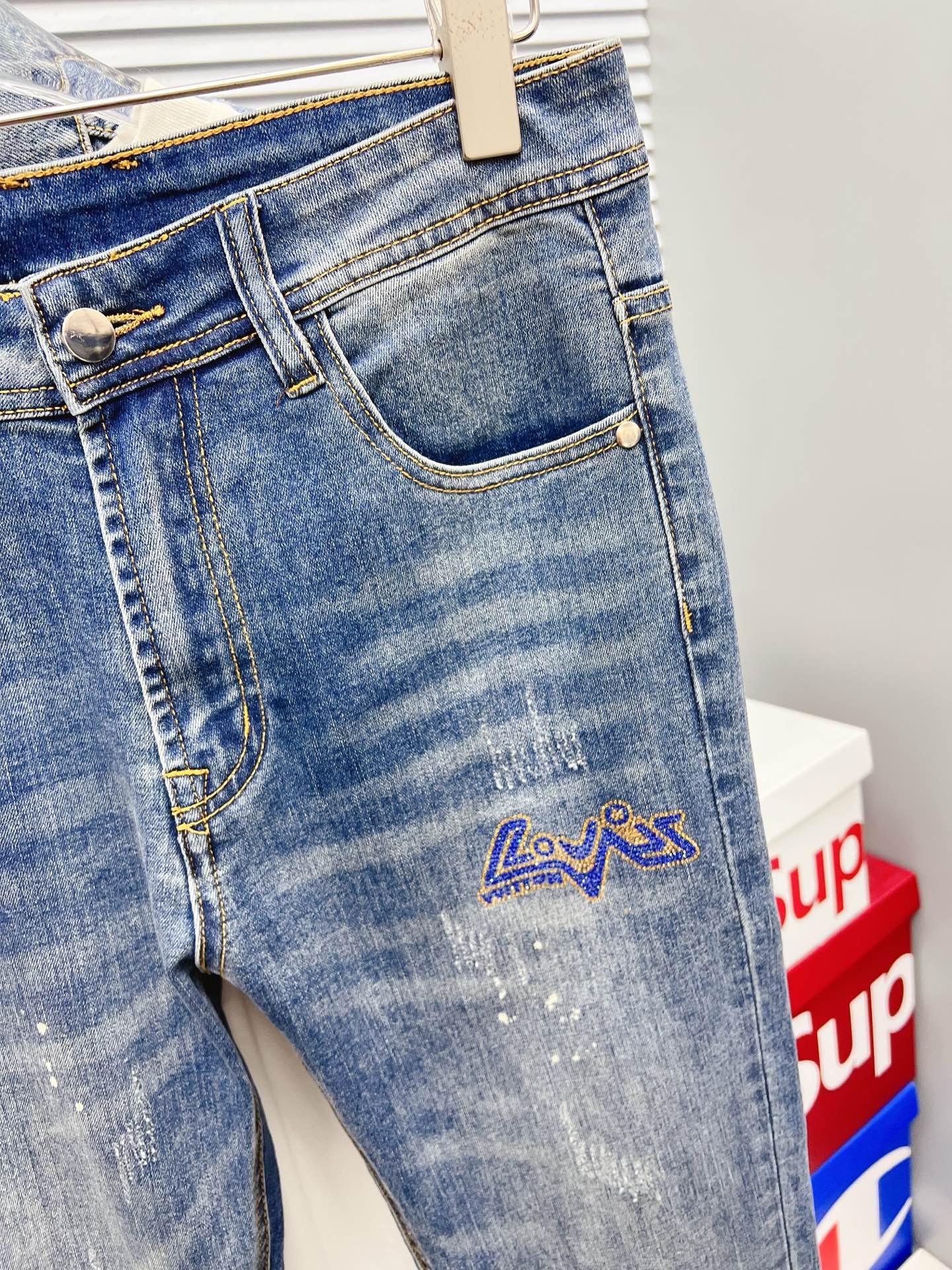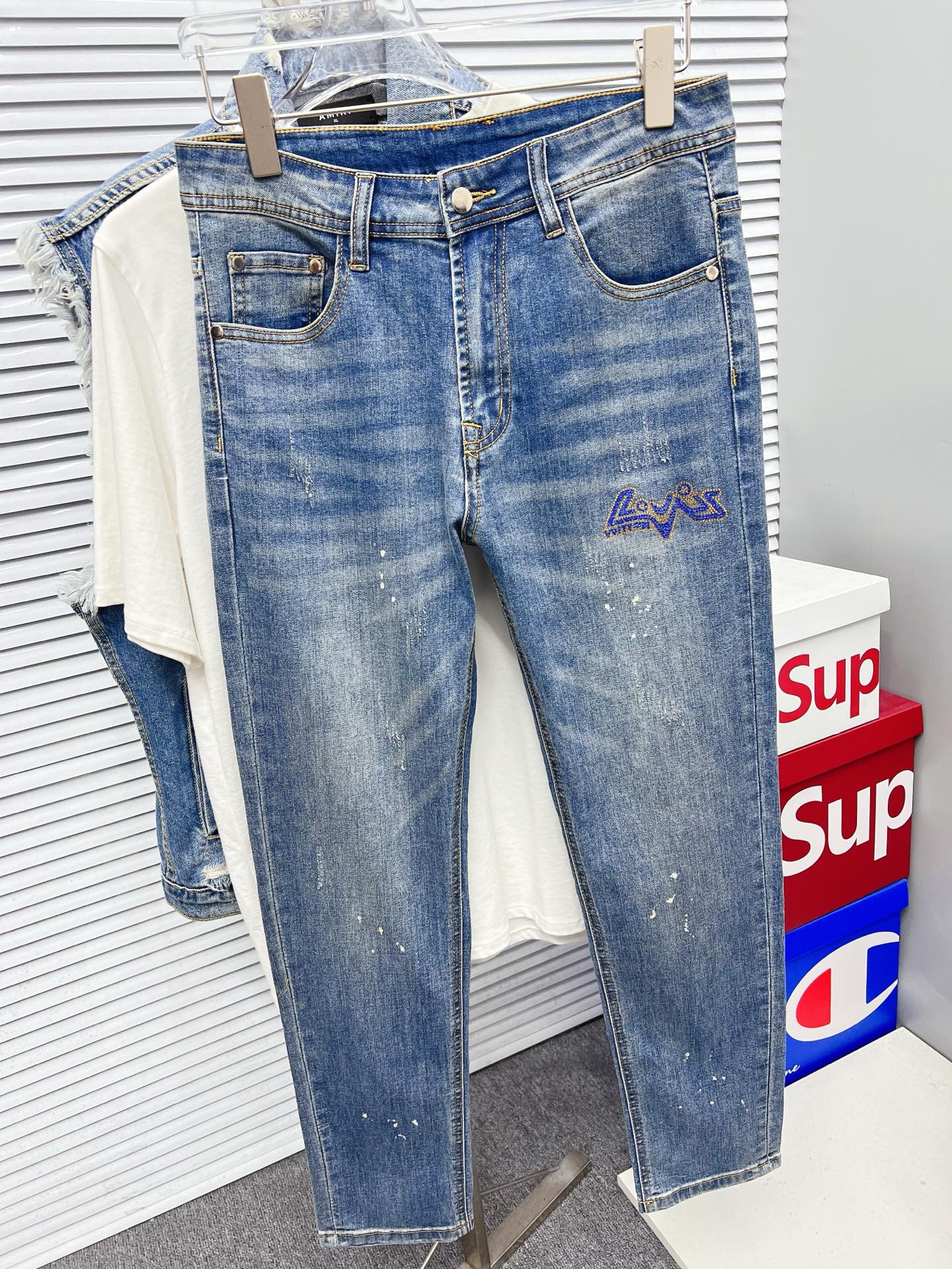 LV men's denim jeans. Premium Japanese 13oz fabric, eco enzyme wash, soft with vintage tones. Perfect fit, versatile styling. Sizes 29-40 (no 35,37).