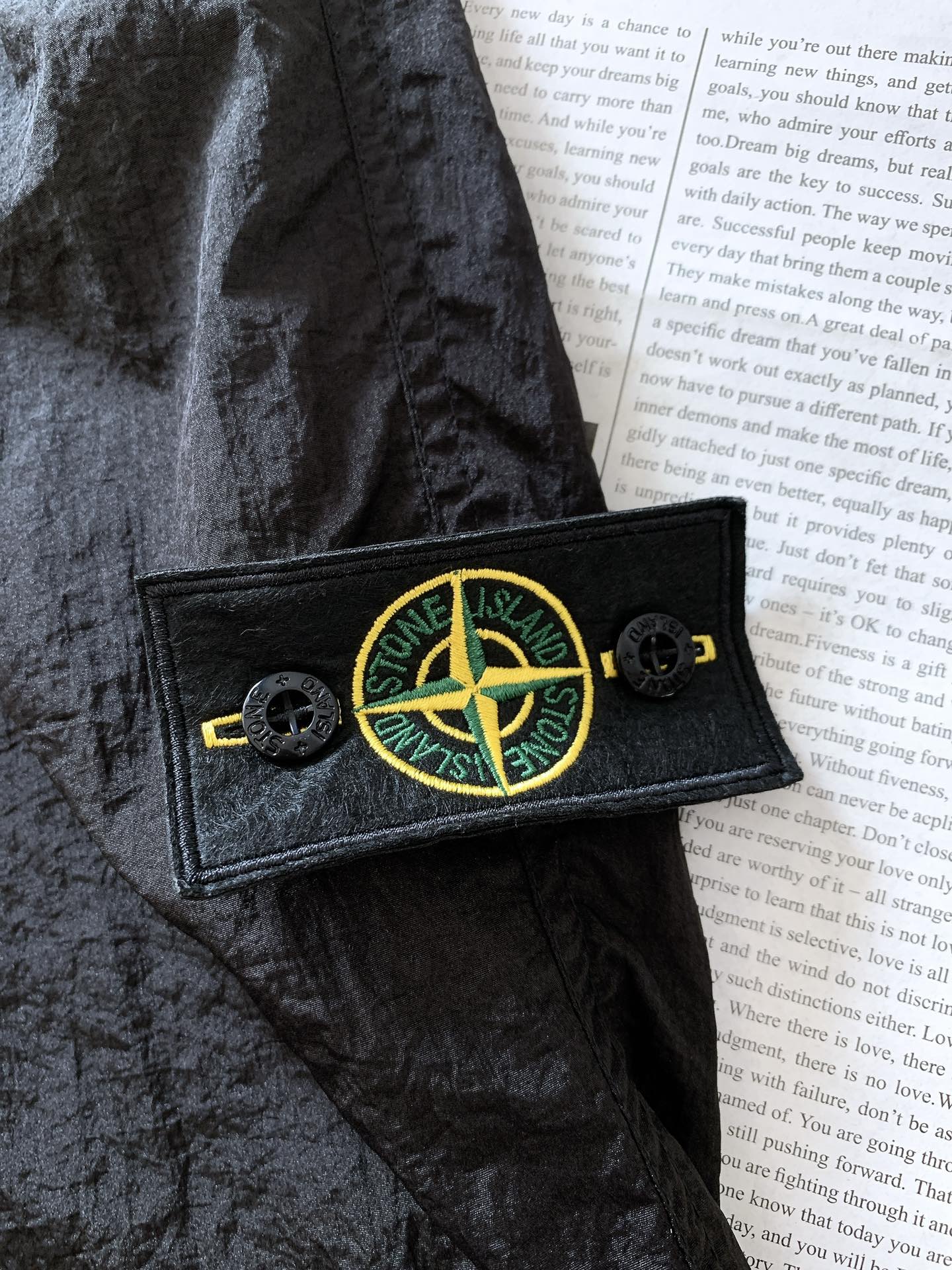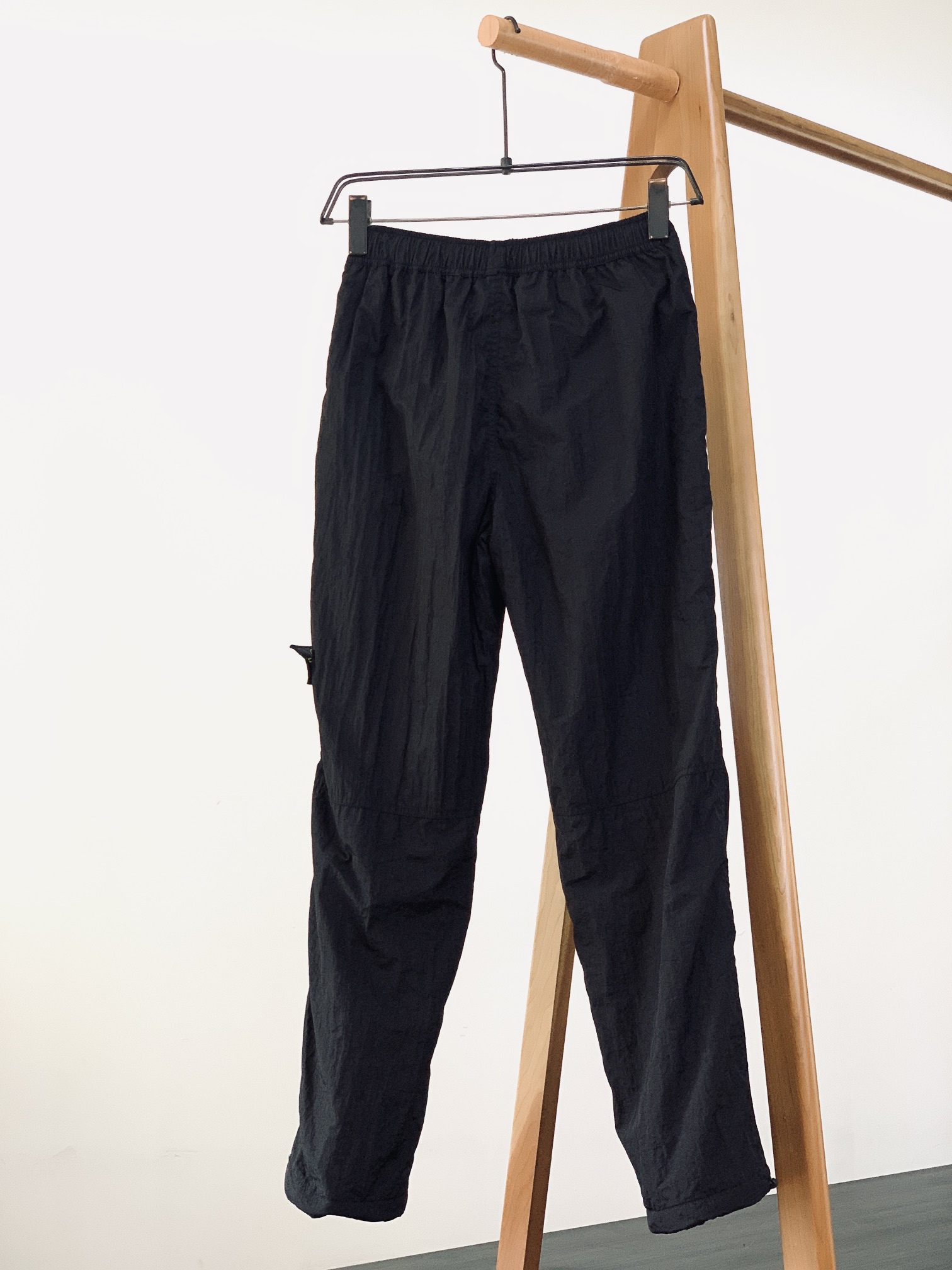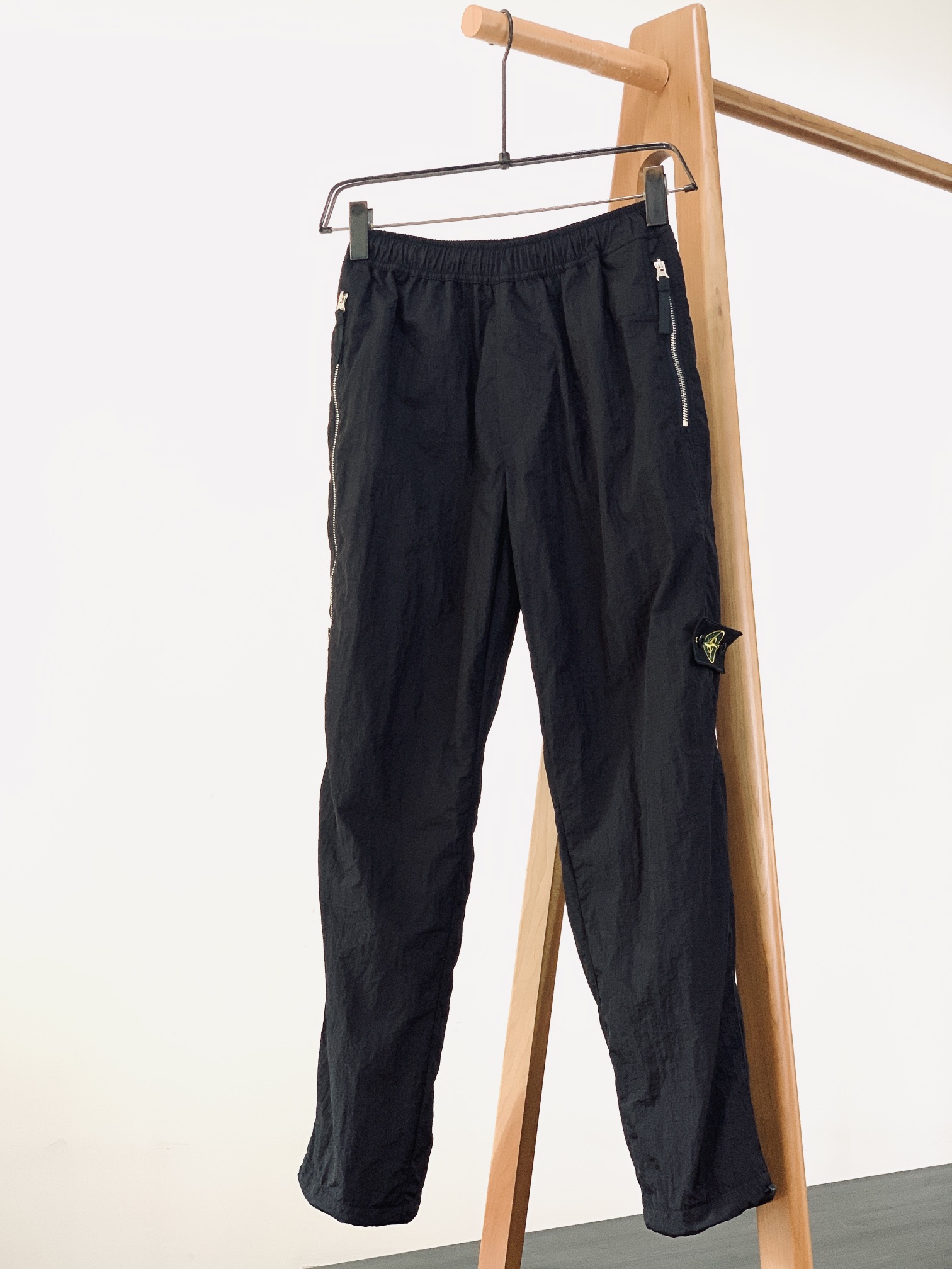 Stone Island 2025FW early autumn metal nylon pants. Unisex straight-leg design with mesh lining, side zippers, and anti-counterfeit badge. Sizes S-XL.