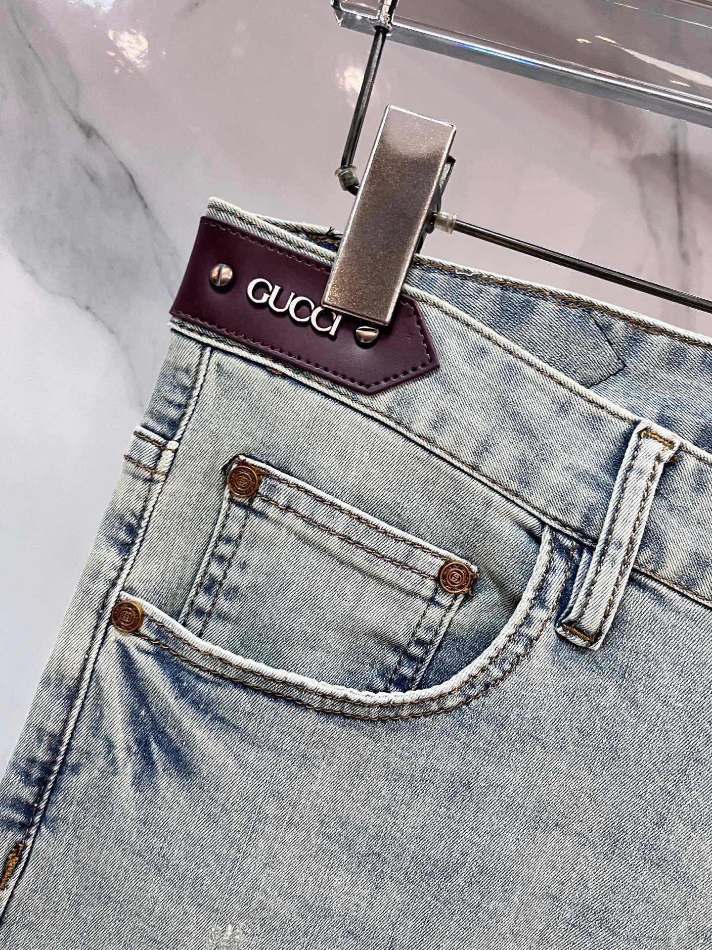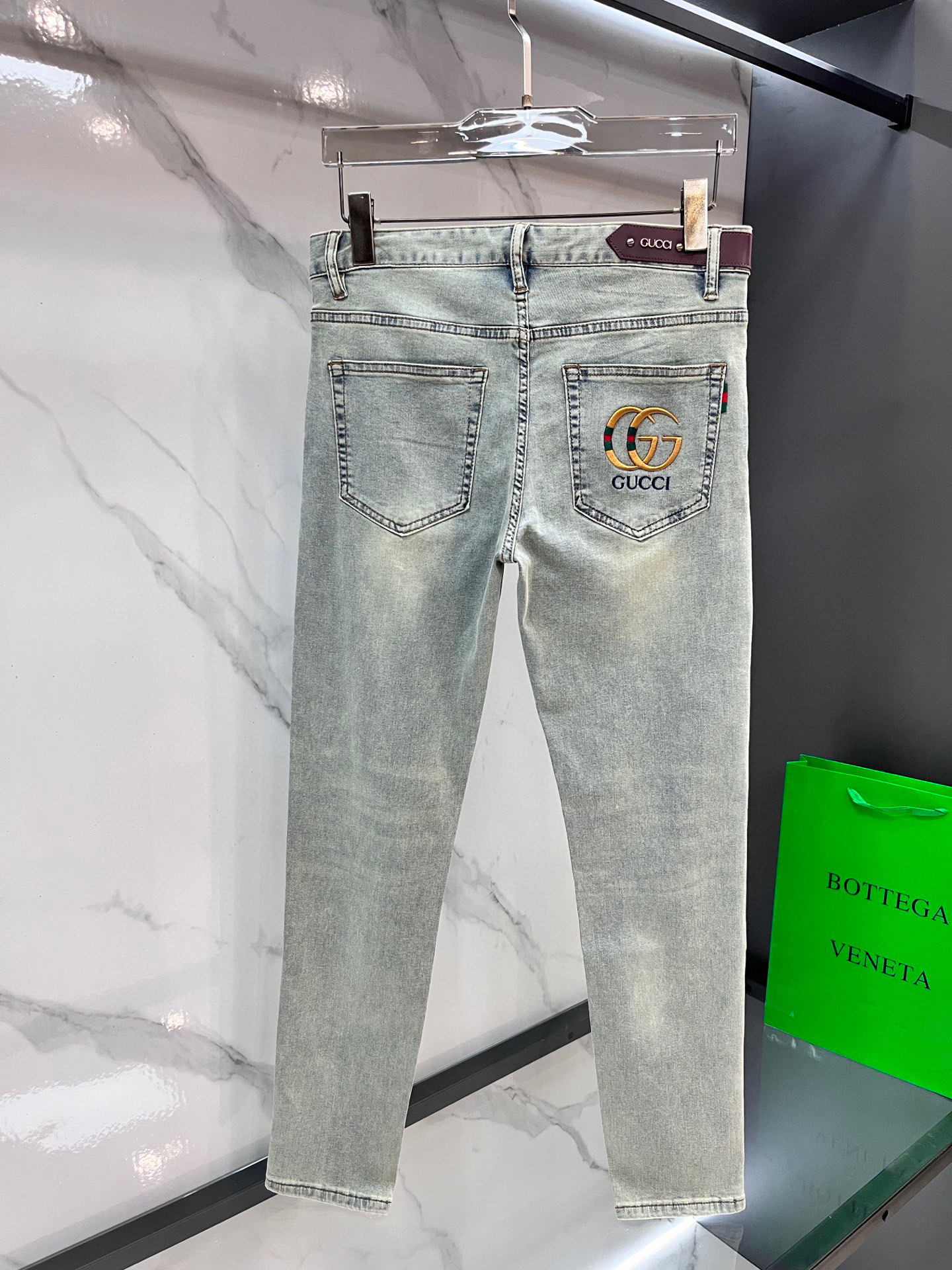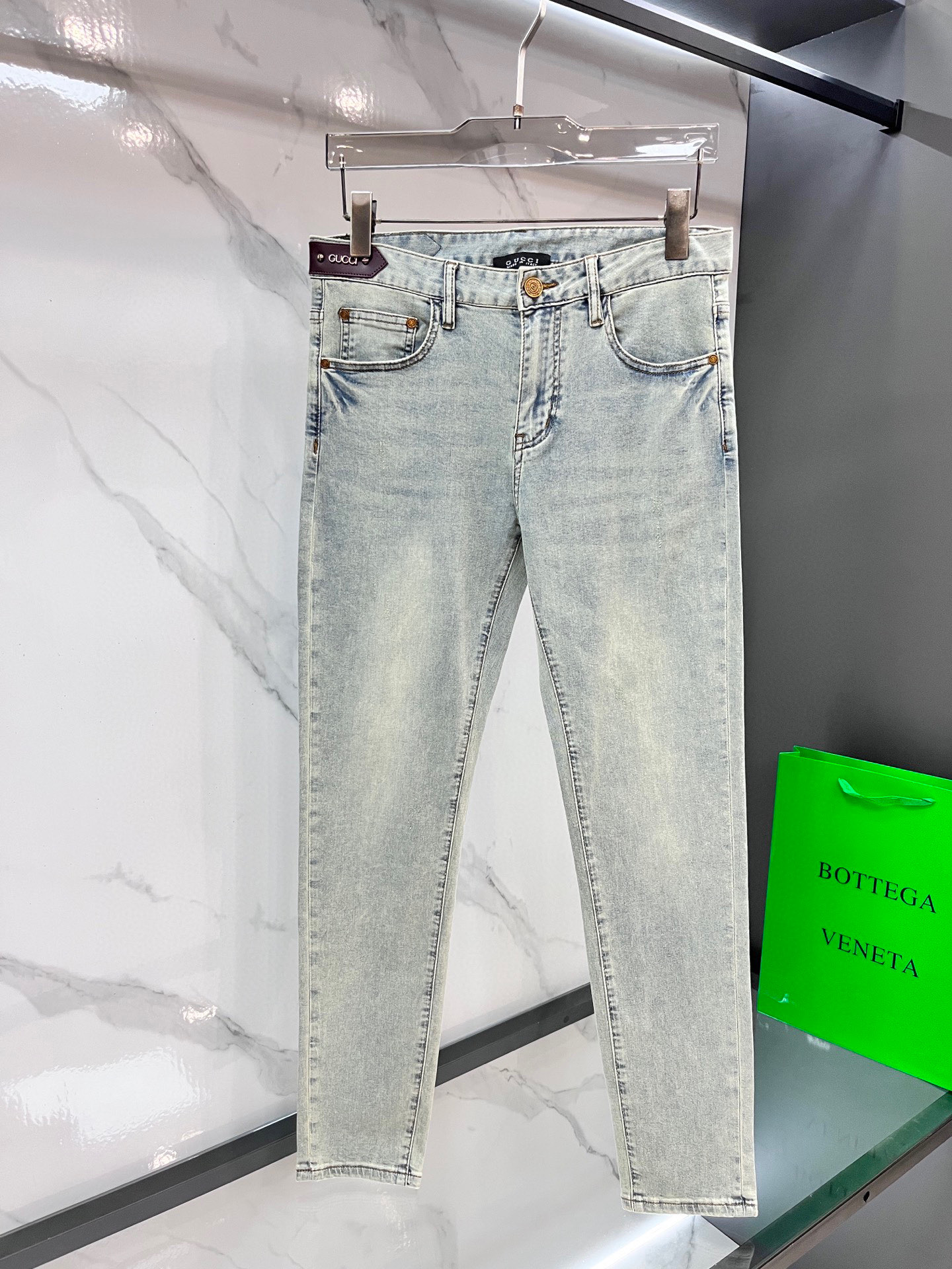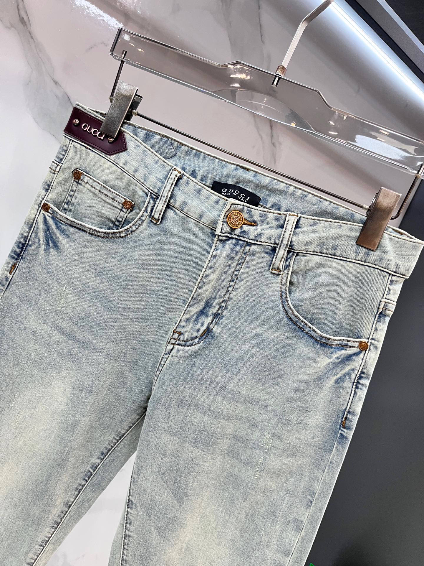 Gucci thin jeans. 98% cotton, 2% elastane. Sturdy, soft, slightly stretchy. Concealed zipper, embossed pockets. Clean cut, elegant fit. Sizes 29-38.