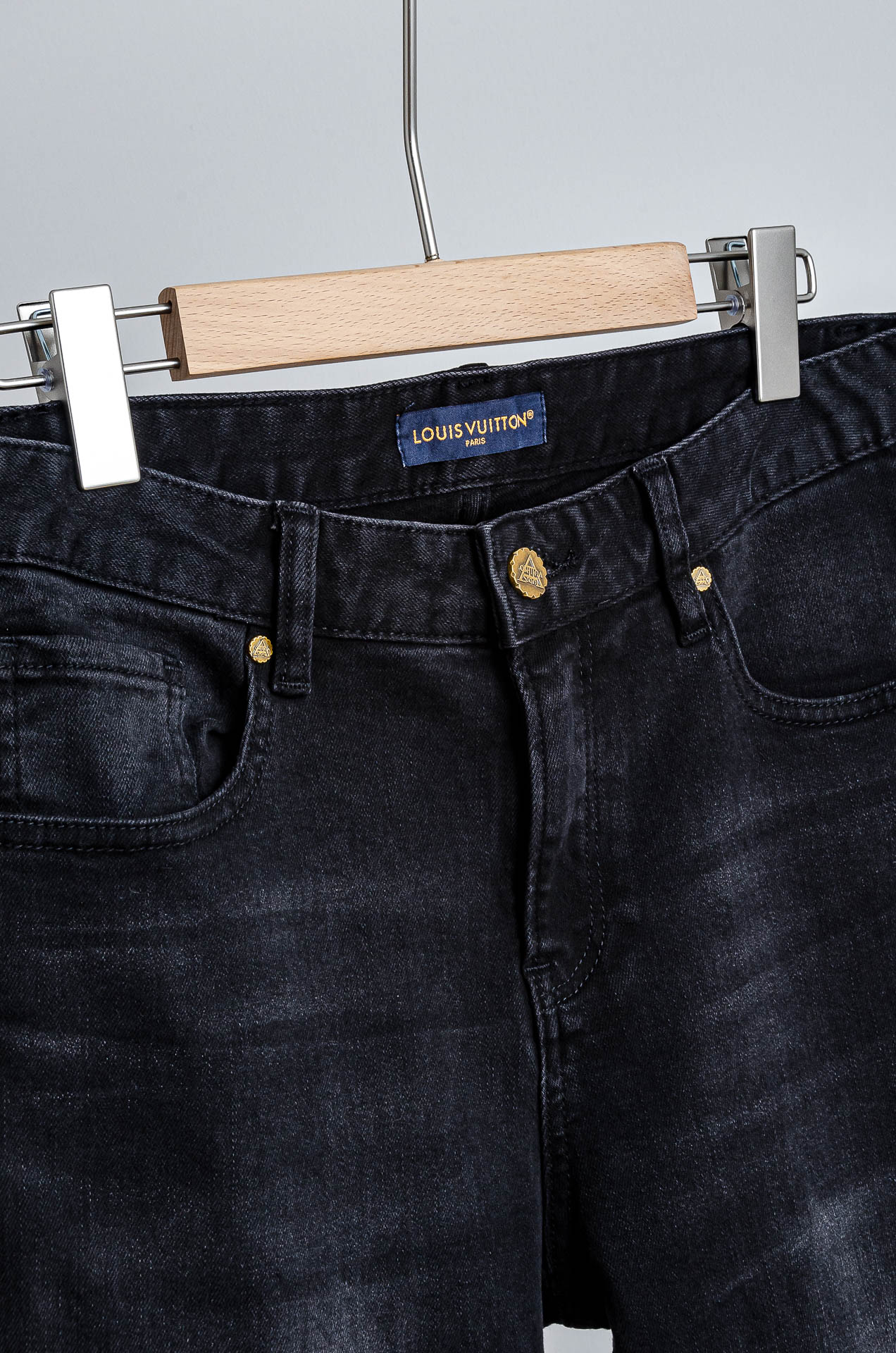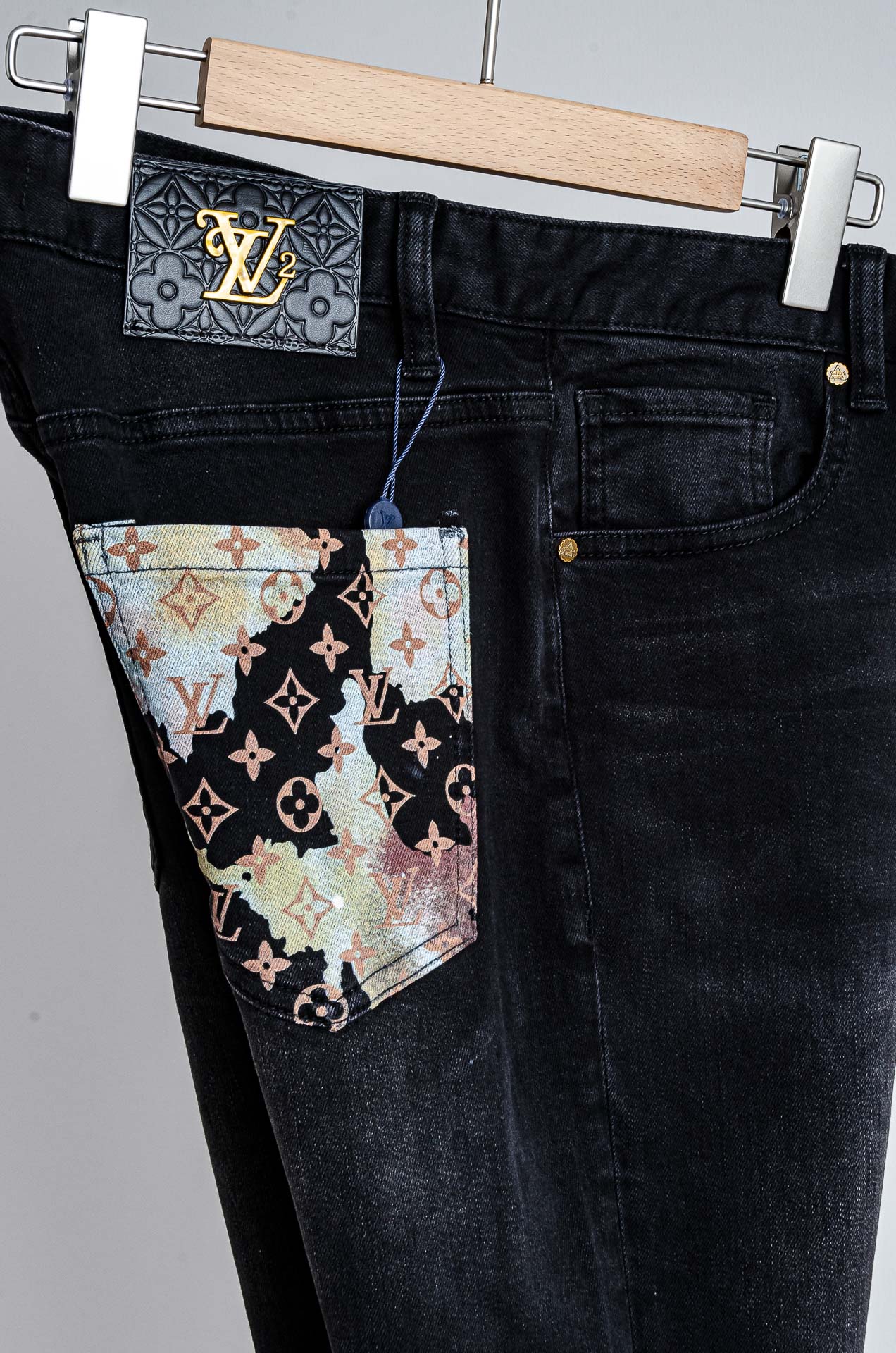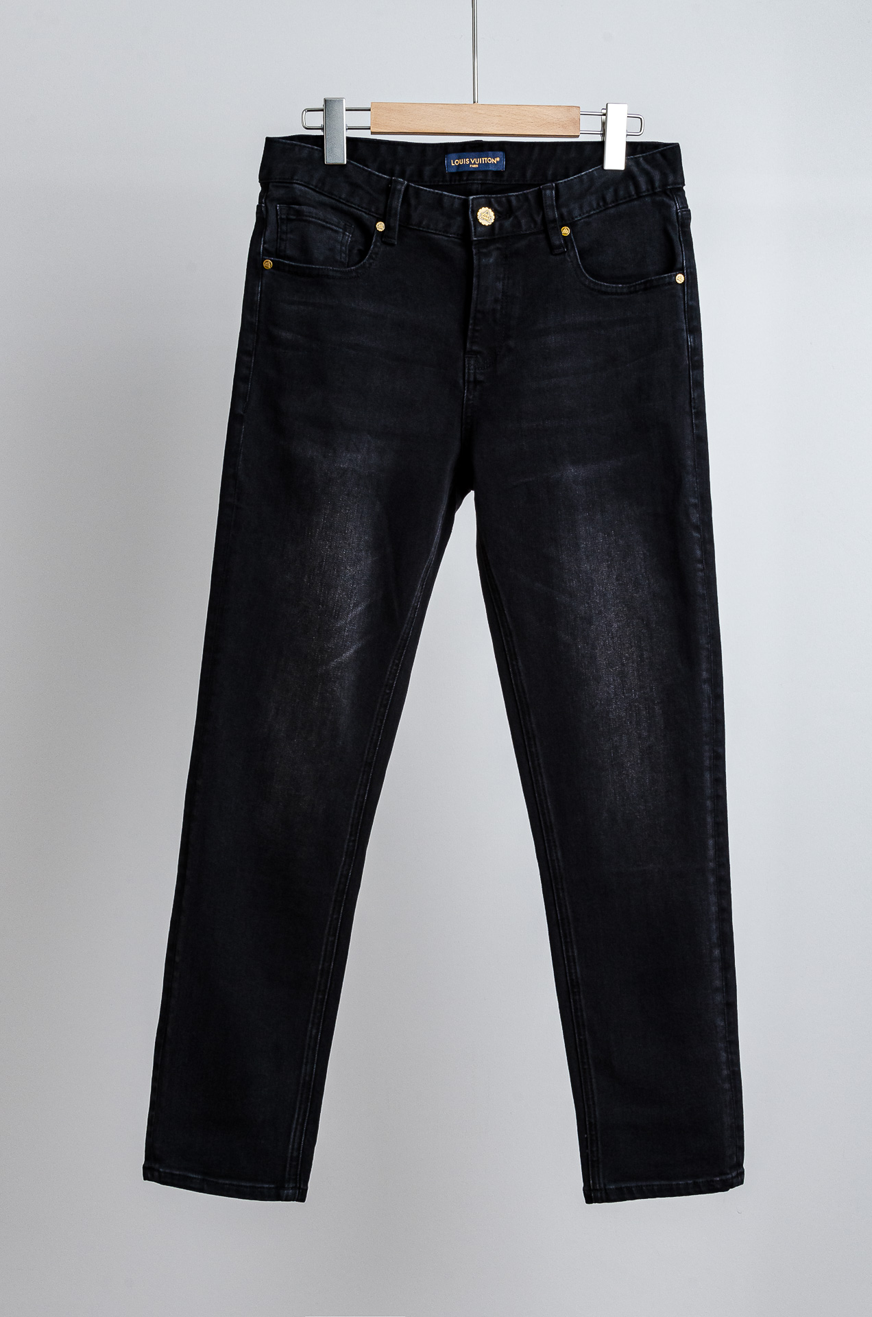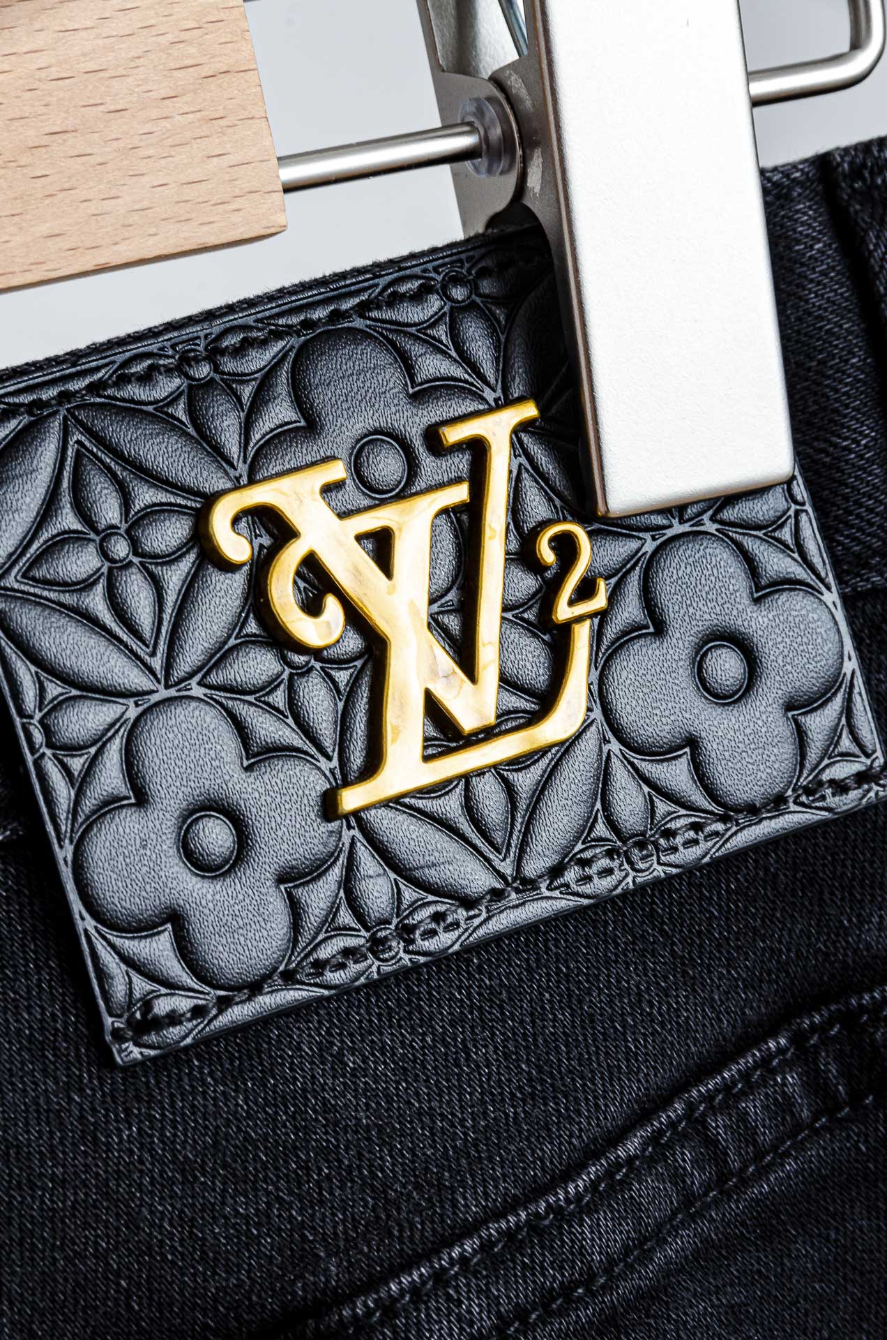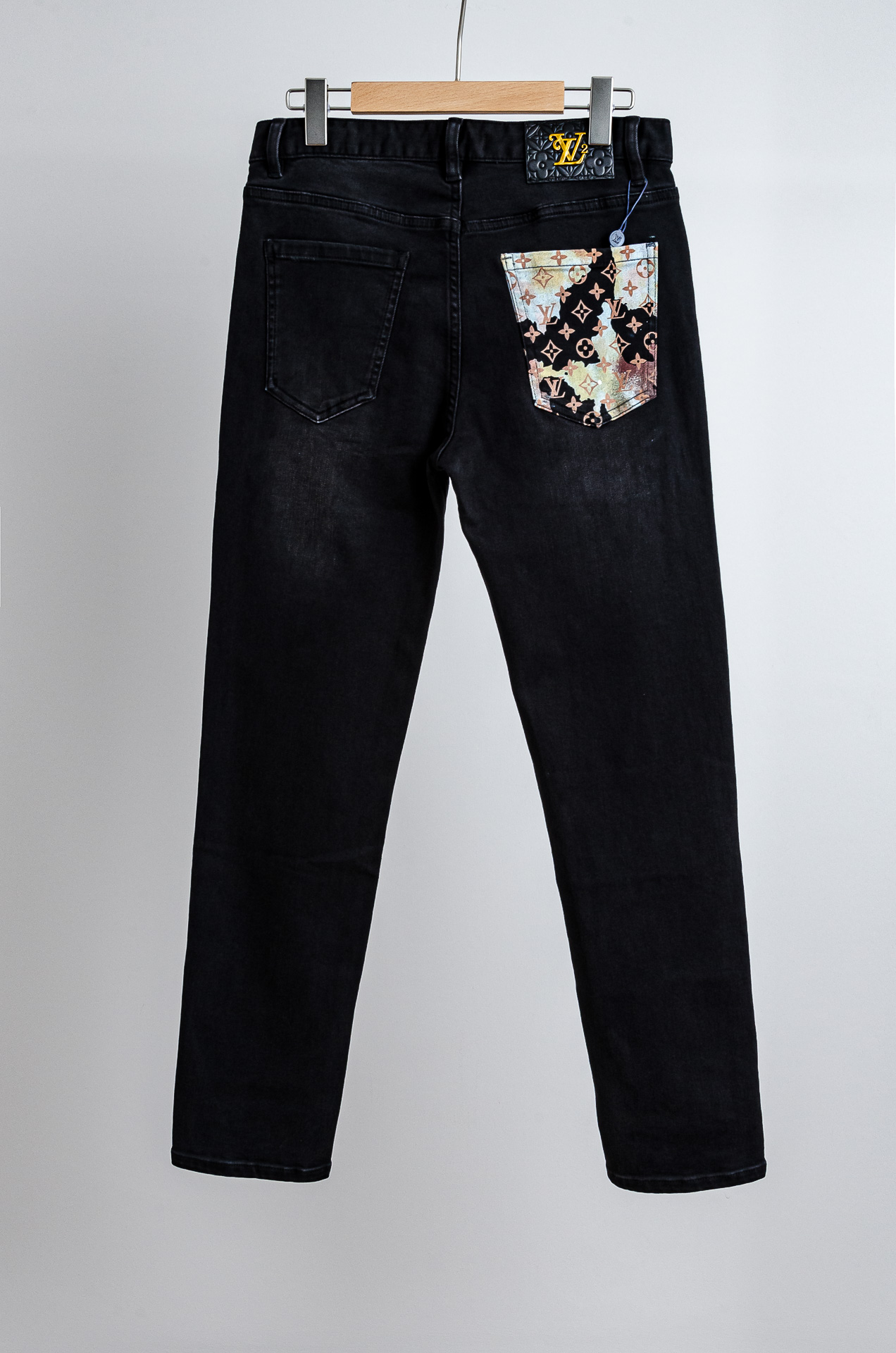 LV 2025 men's straight-leg denim jeans. Made from imported washed cotton, soft and elastic. Features YKK zipper, leather logo tag. Slim fit, comfortable for summer. Sizes: 30-38 (no 35, 37).