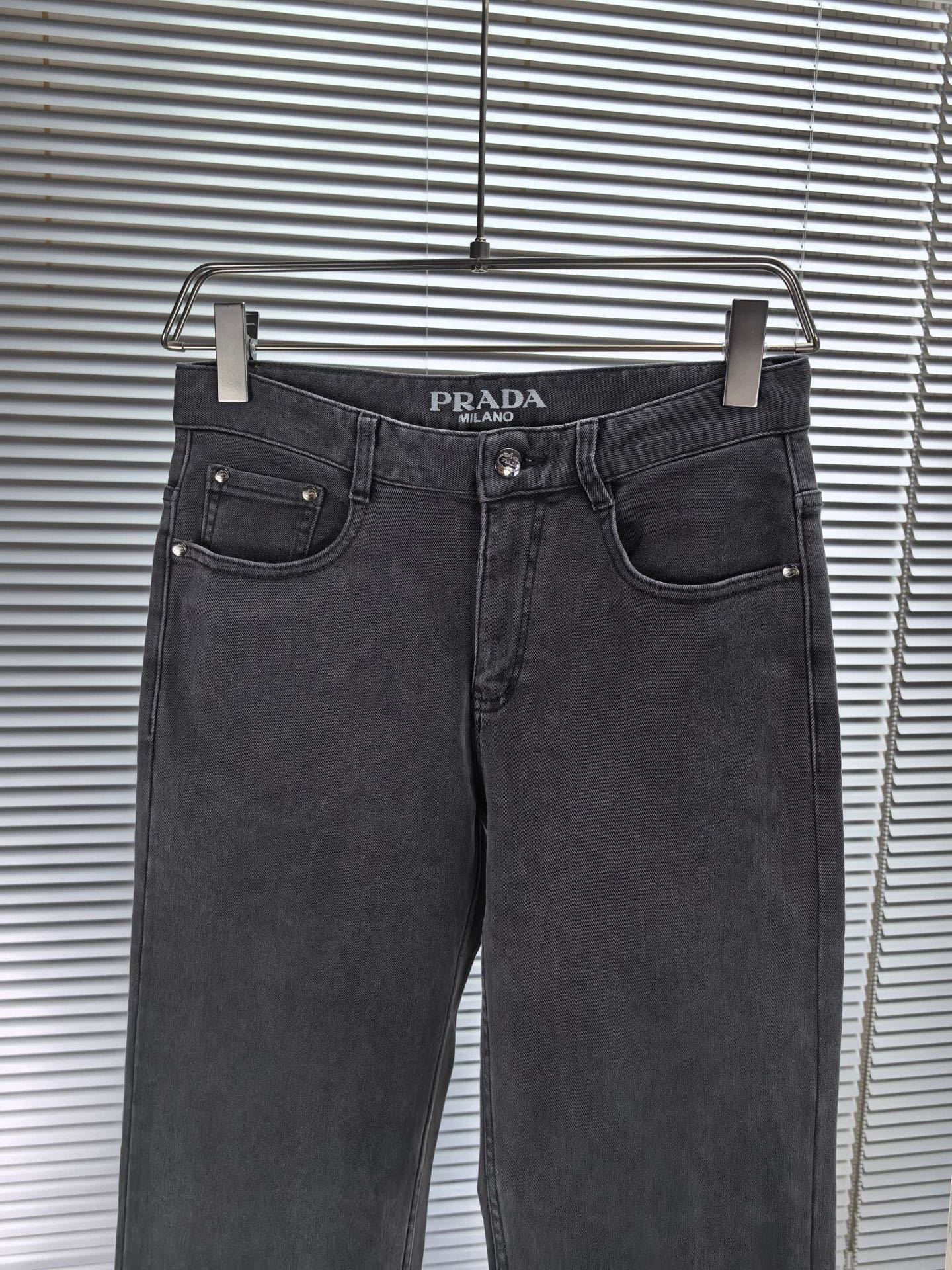 Prada wide-leg jeans, autumn-winter 1975. Heavy wash denim, custom soft fabric, comfortable, breathable. Custom metal logo, elastic material, simple design. Sizes 29-38.