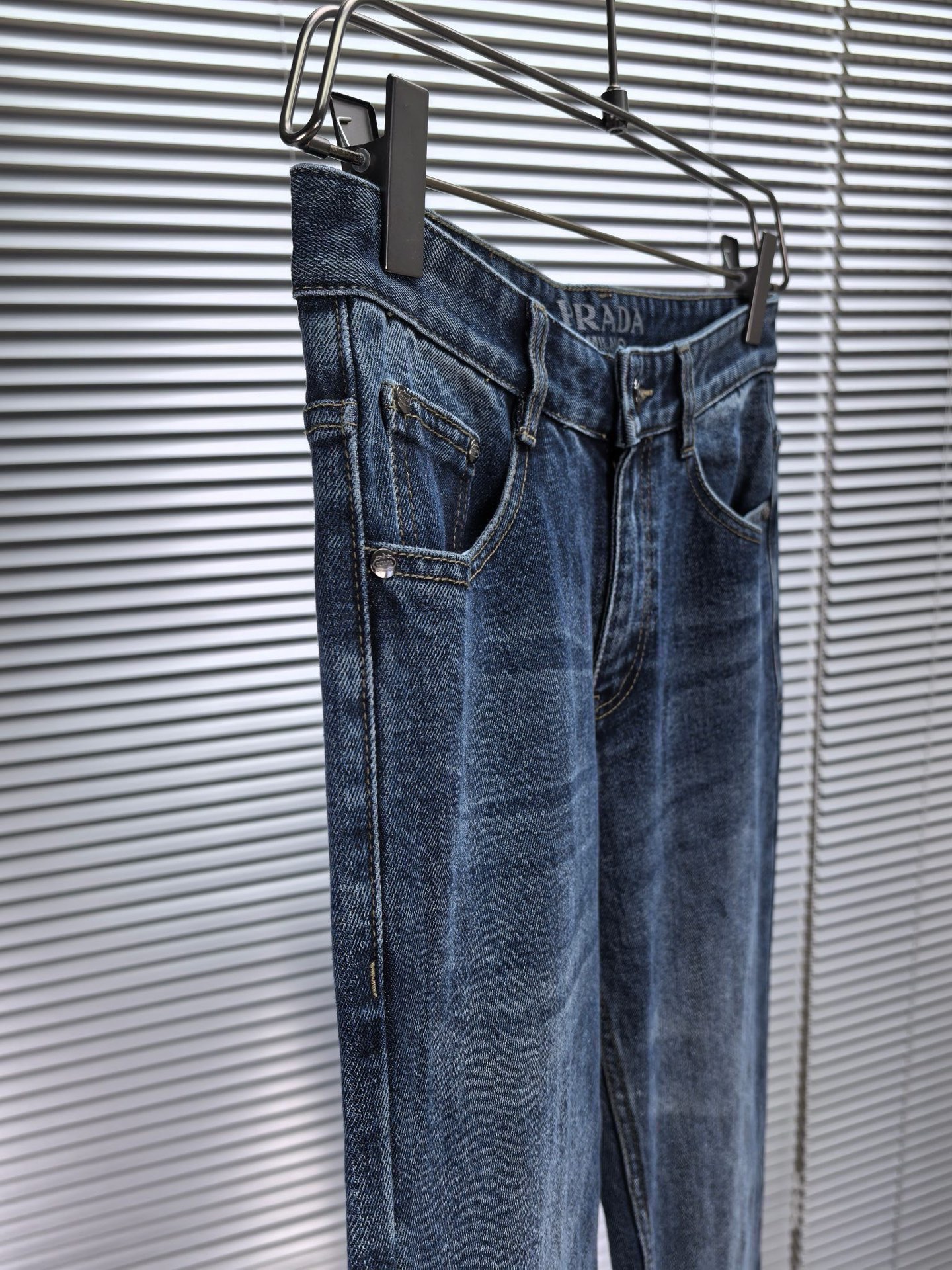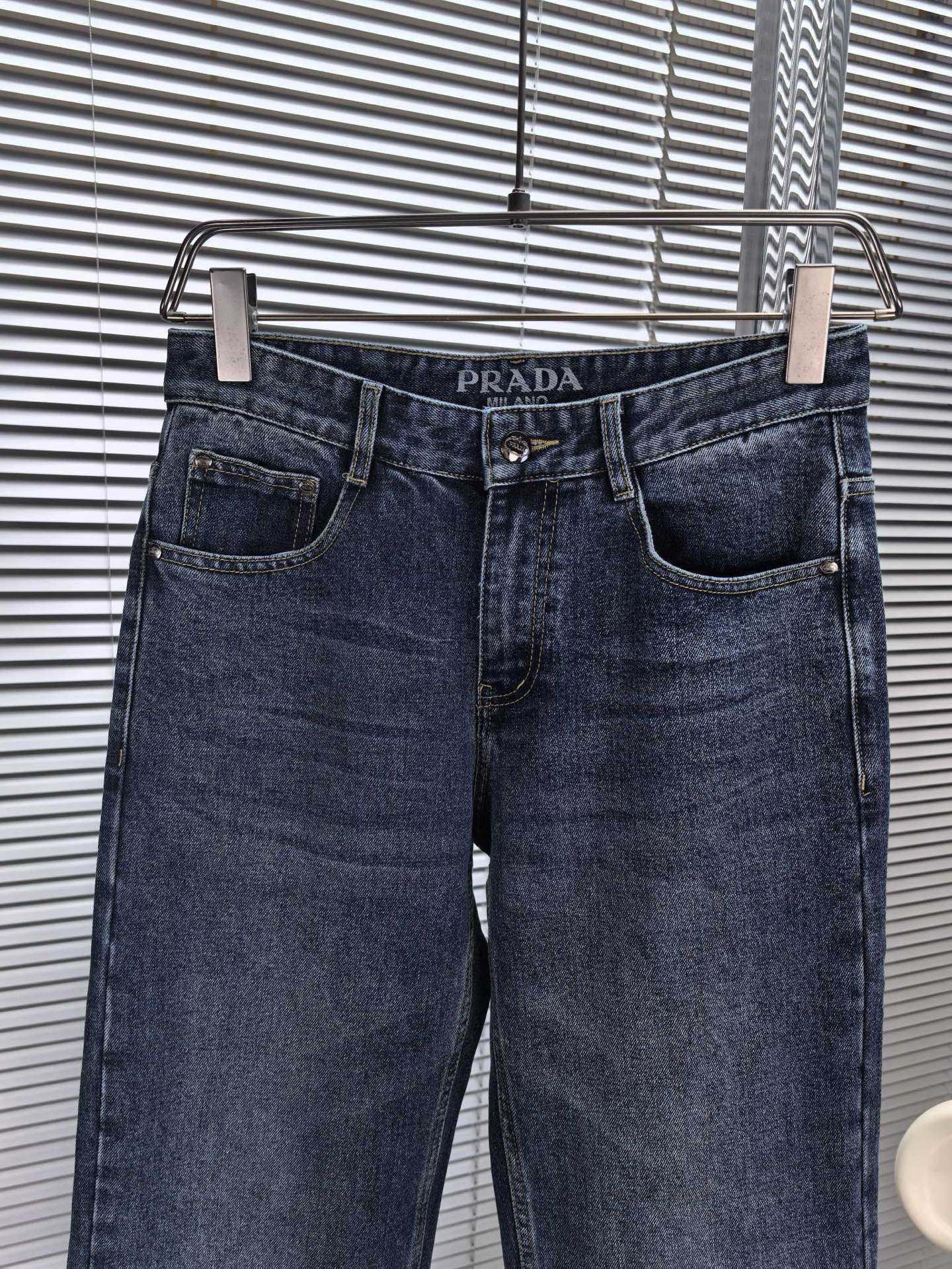 Prada wide-leg jeans, autumn-winter 1975. Heavy wash denim, custom soft fabric, comfortable, breathable. Custom metal logo, elastic material, simple design. Sizes 29-38.