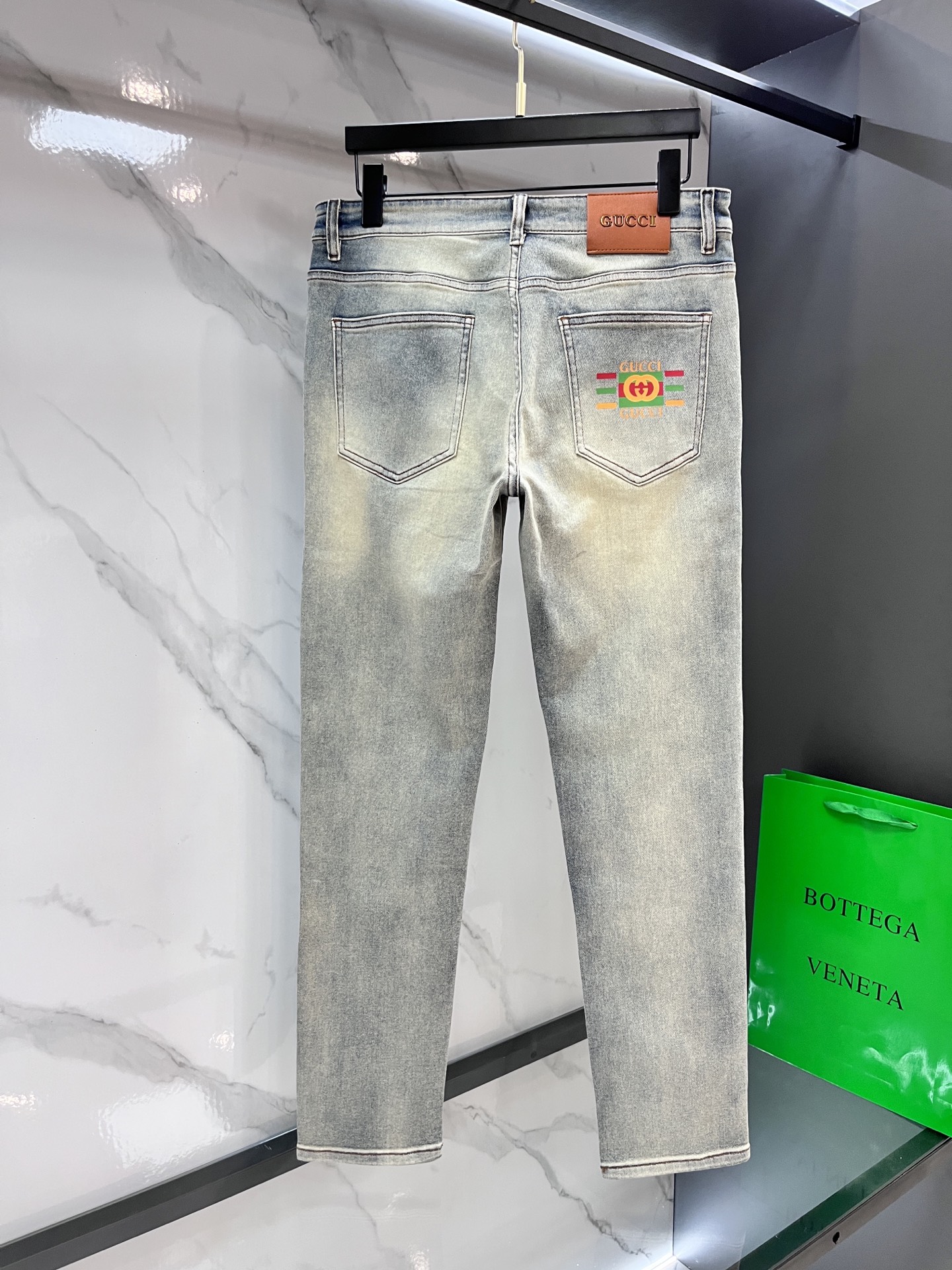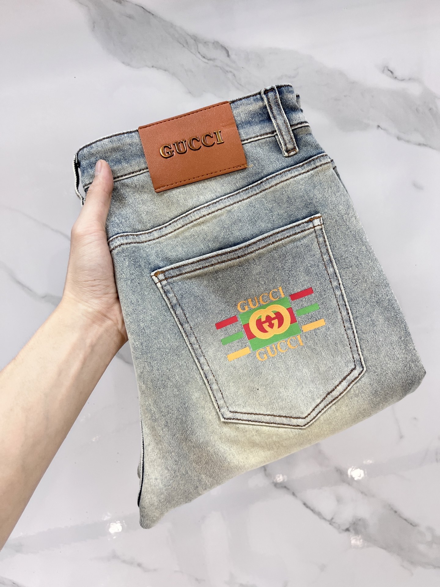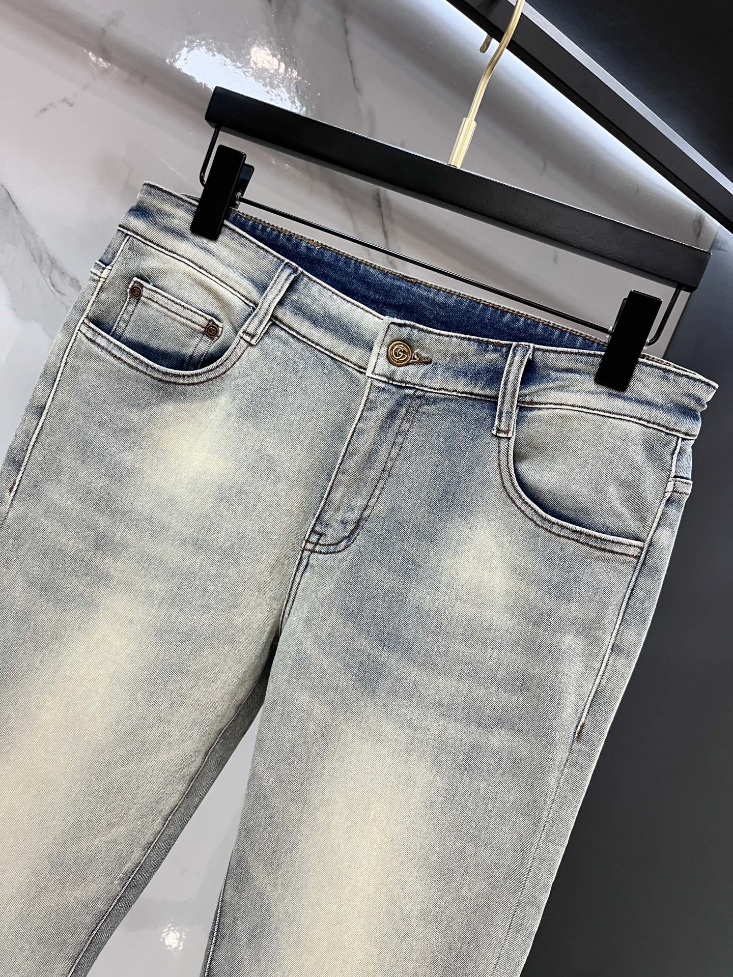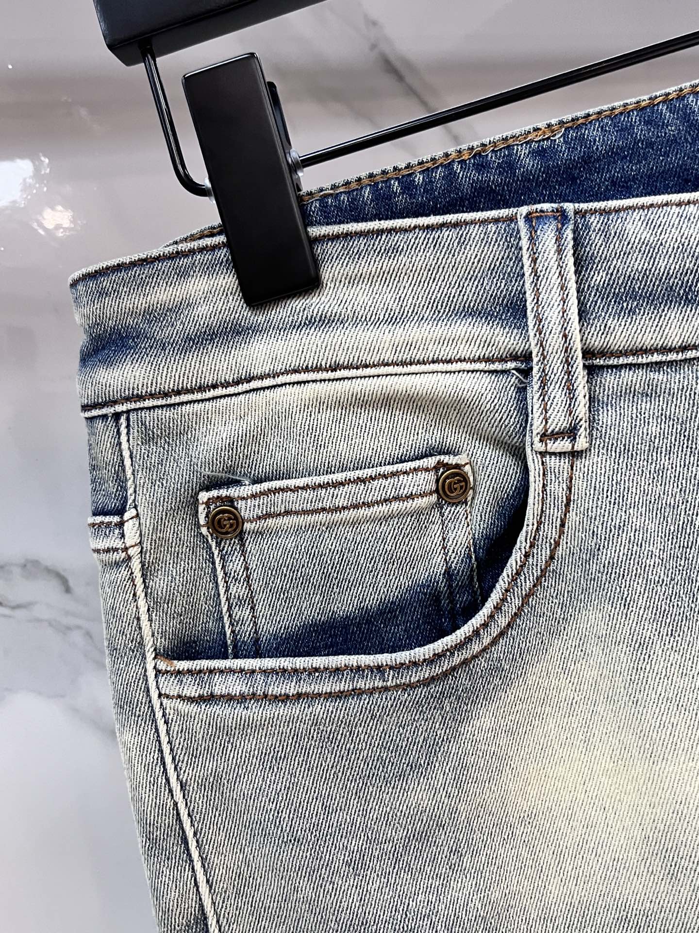 Gucci 2025SS lightweight distressed jeans. Imported stretch denim, comfortable & breathable. Metal hardware, excellent fit. Sizes 29-40.