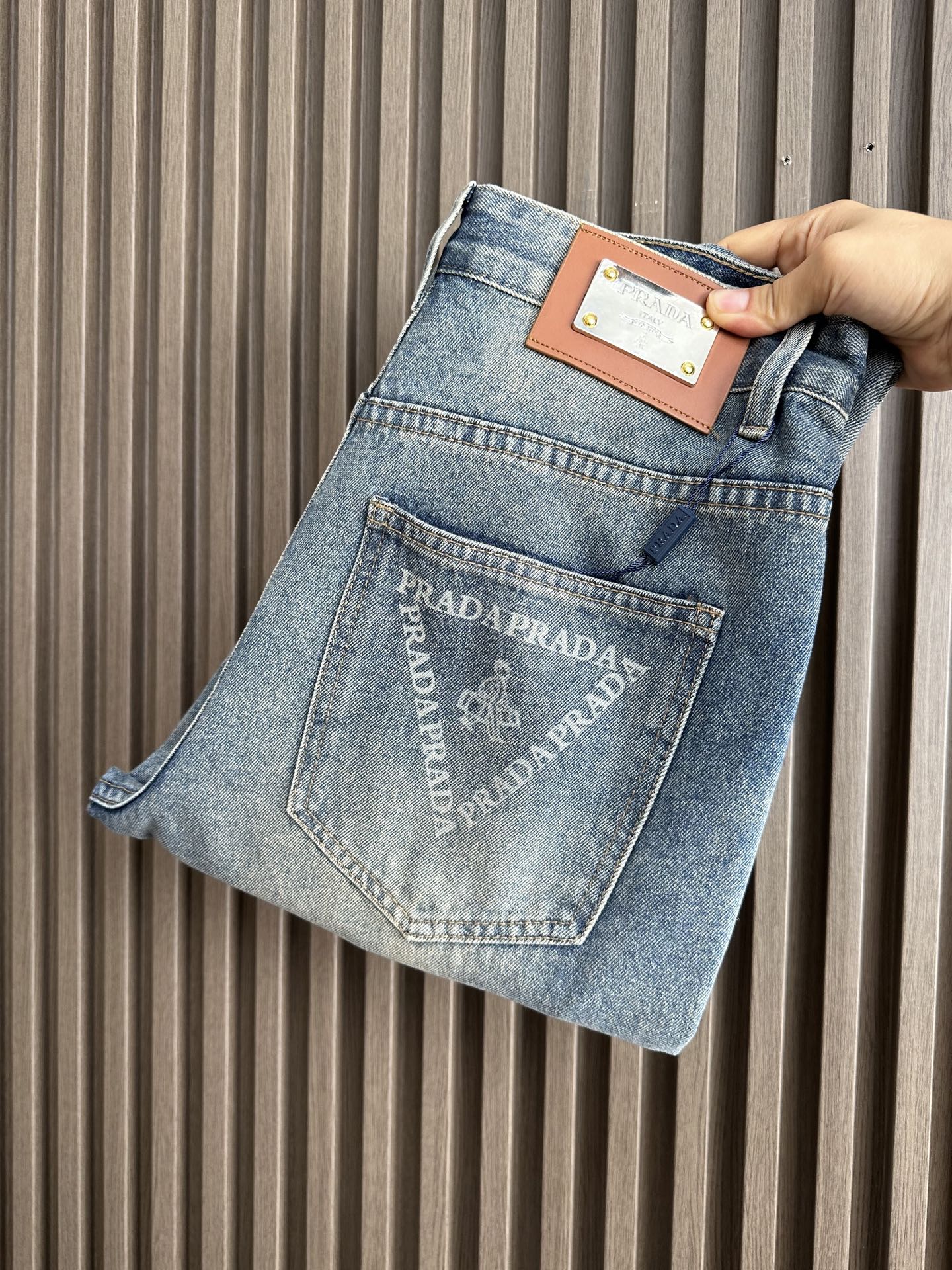 Prada wide-leg jeans, 25SS spring-summer men's fashion. Imported denim, 13oz Japanese fabric, eco-friendly enzyme wash. Retro color, soft yet structured, slight stretch. Perfect fit, versatile styling. Sizes: 29-38 (excl. 35, 37).