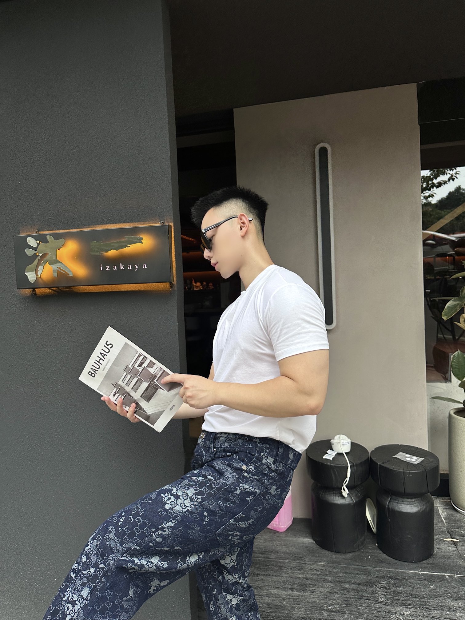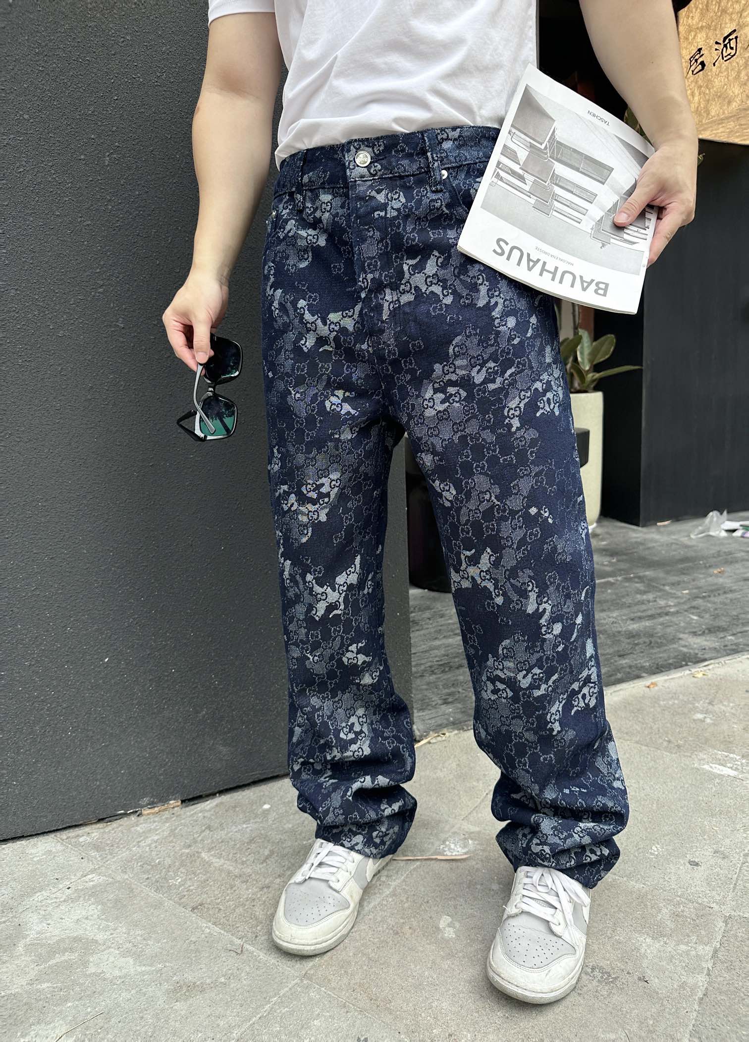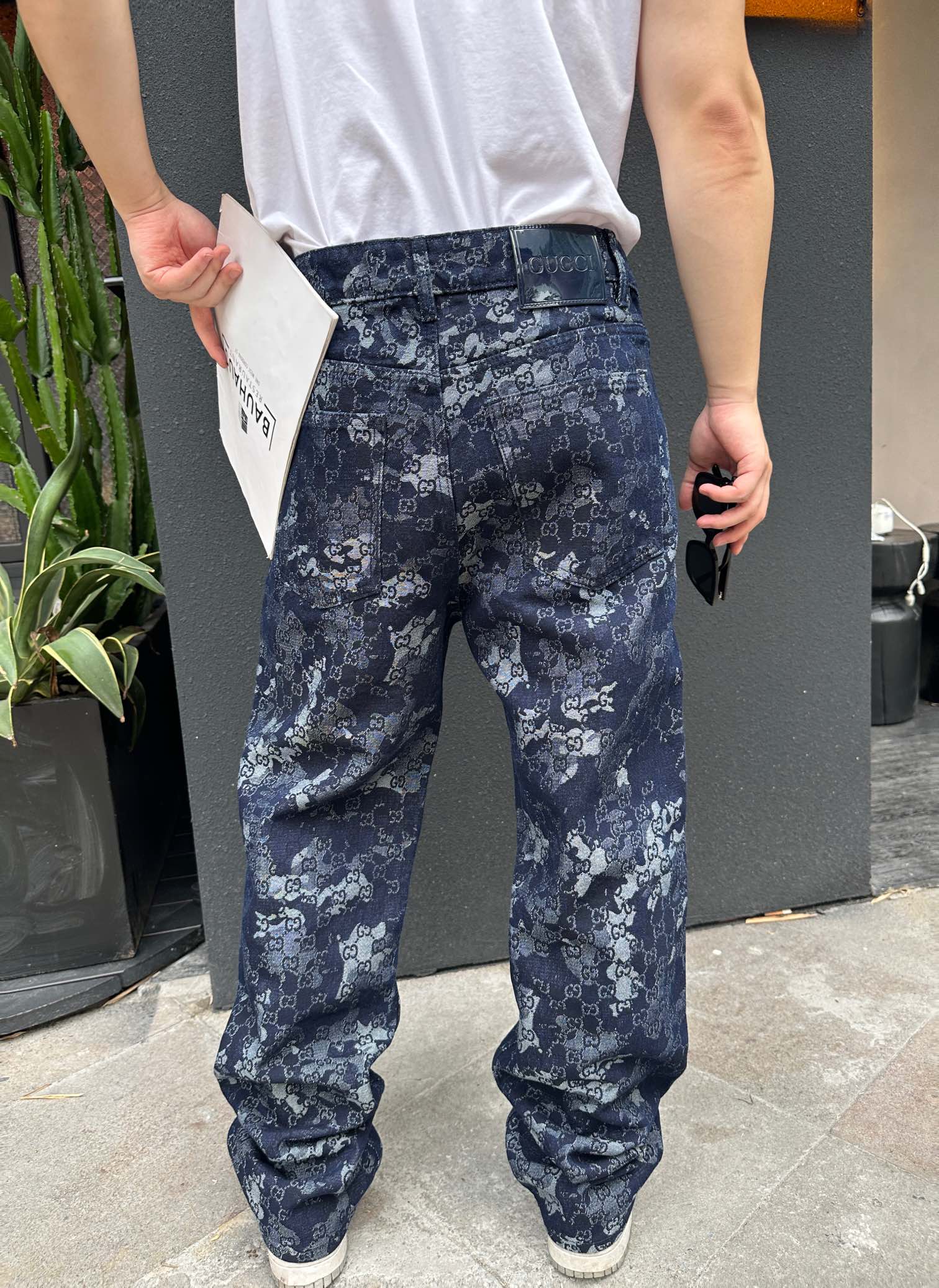 Gucci jacquard jeans with all-over GG marble pattern. Custom denim, deep blue with ivory accents. Features leather label, metal hardware. Relaxed fit, sizes 34-40. Exclusive supply.