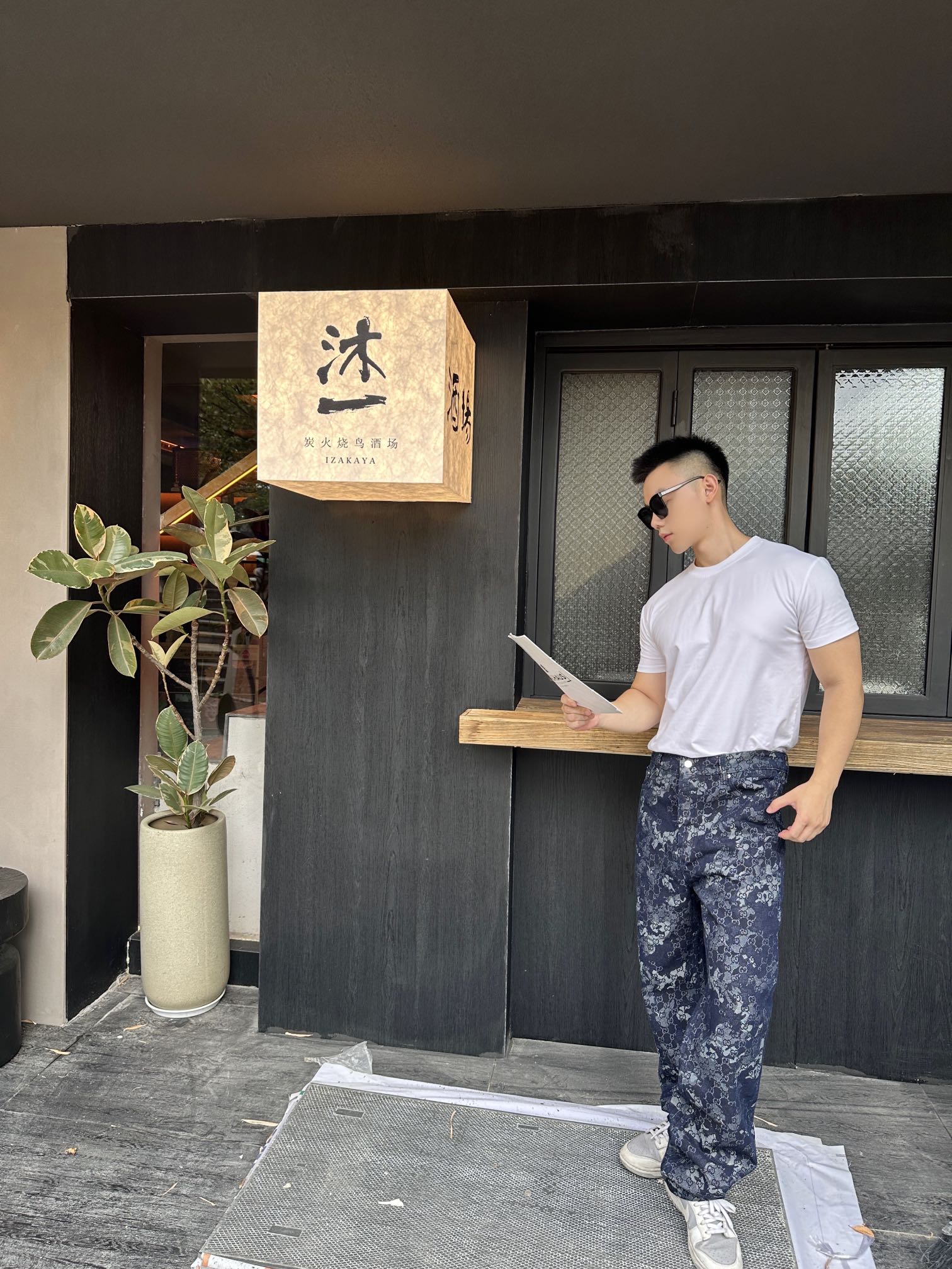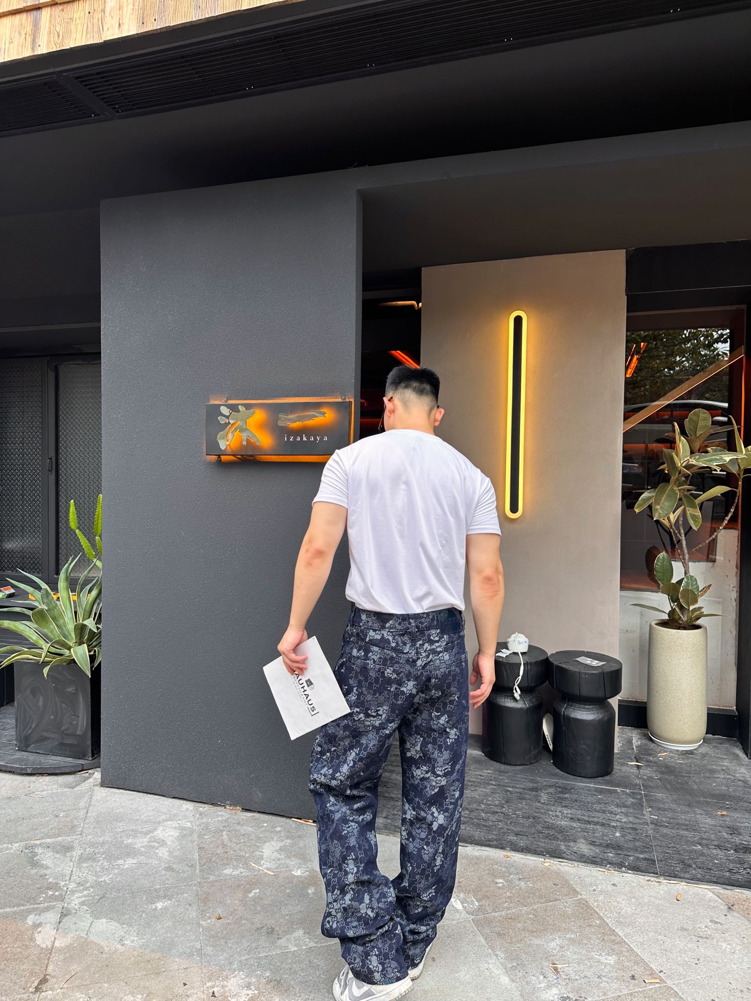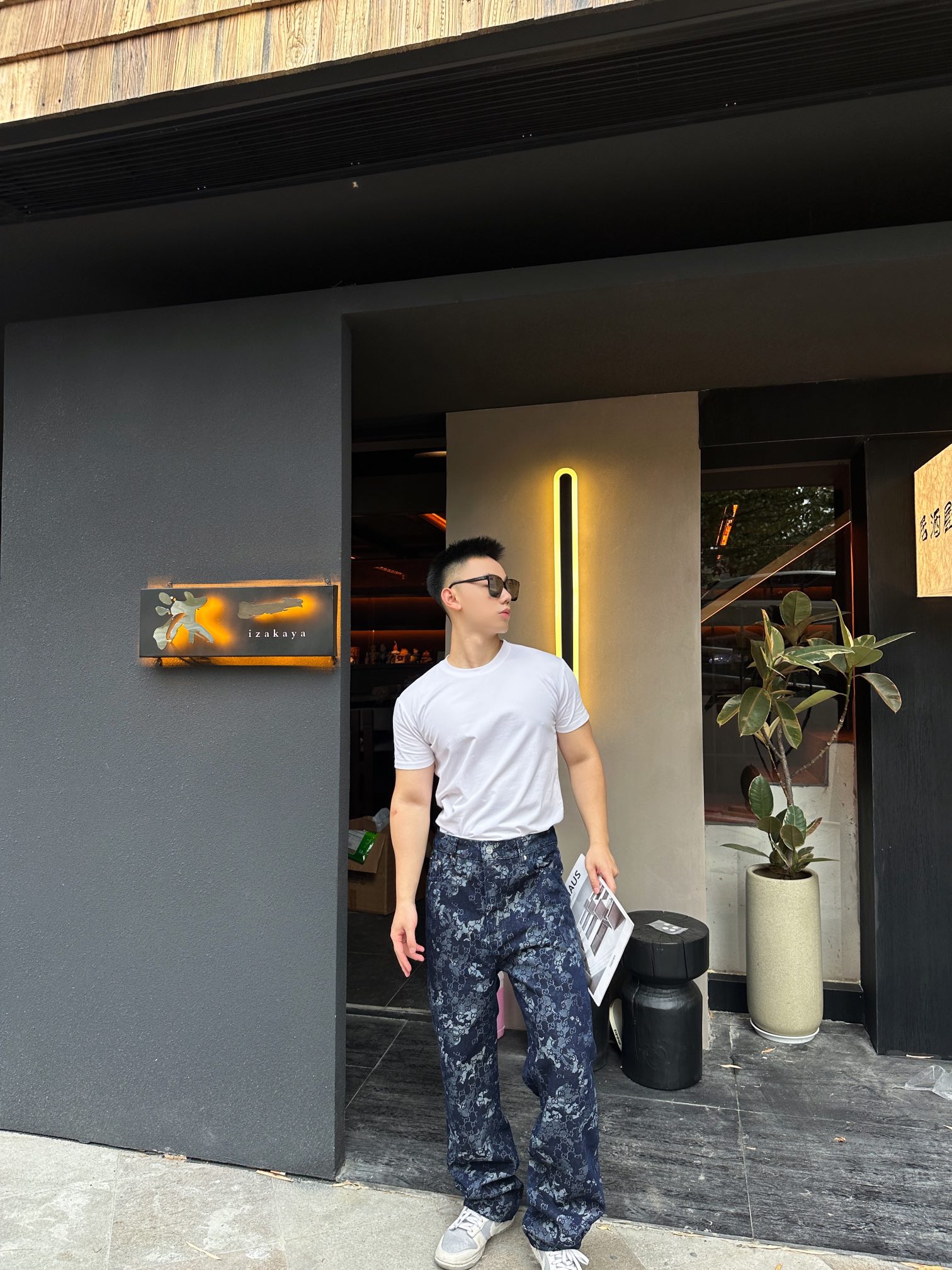 Gucci jacquard jeans with all-over GG marble pattern. Custom denim, deep blue with ivory accents. Features leather label, metal hardware. Relaxed fit, sizes 34-40. Exclusive supply.