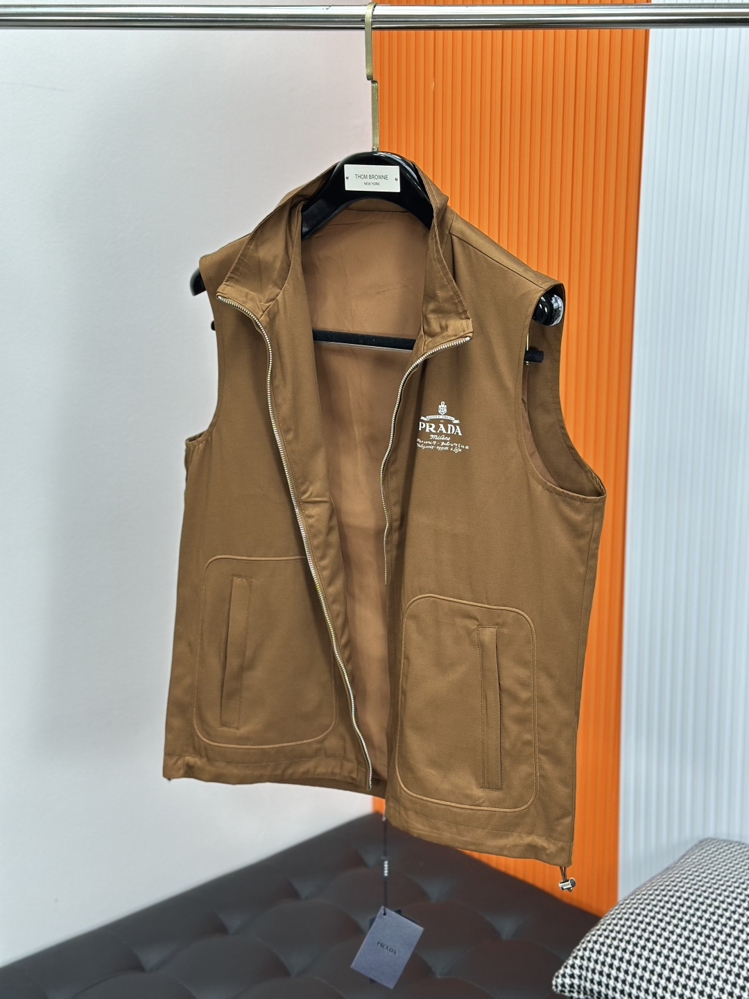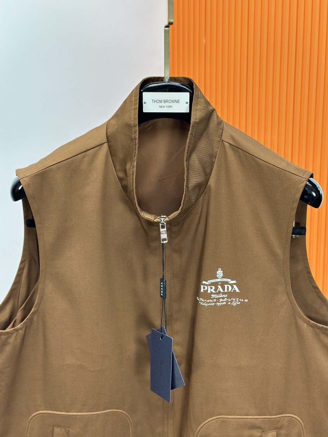 Prada vest with chest triangle logo. Soft, breathable fabric. Chic chest pocket adds style. Versatile for daily wear. Sizes 48-56.