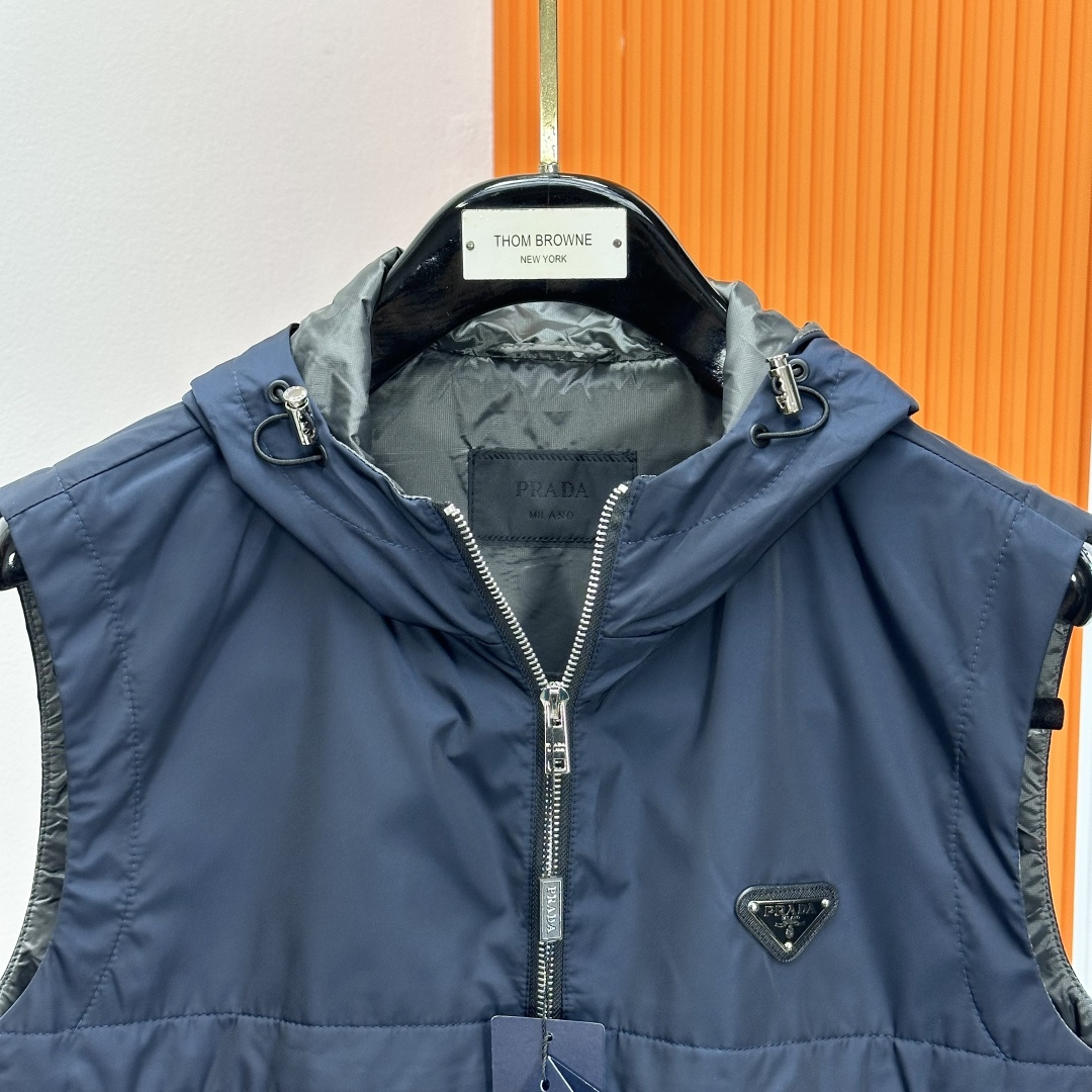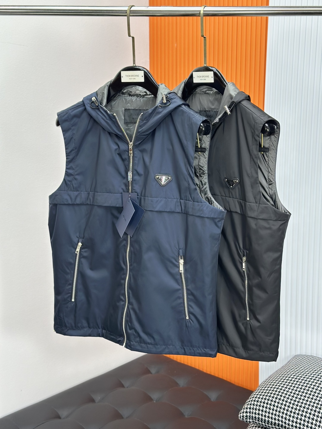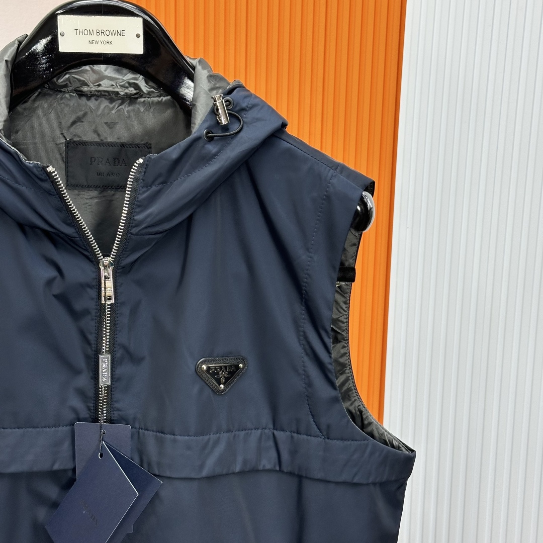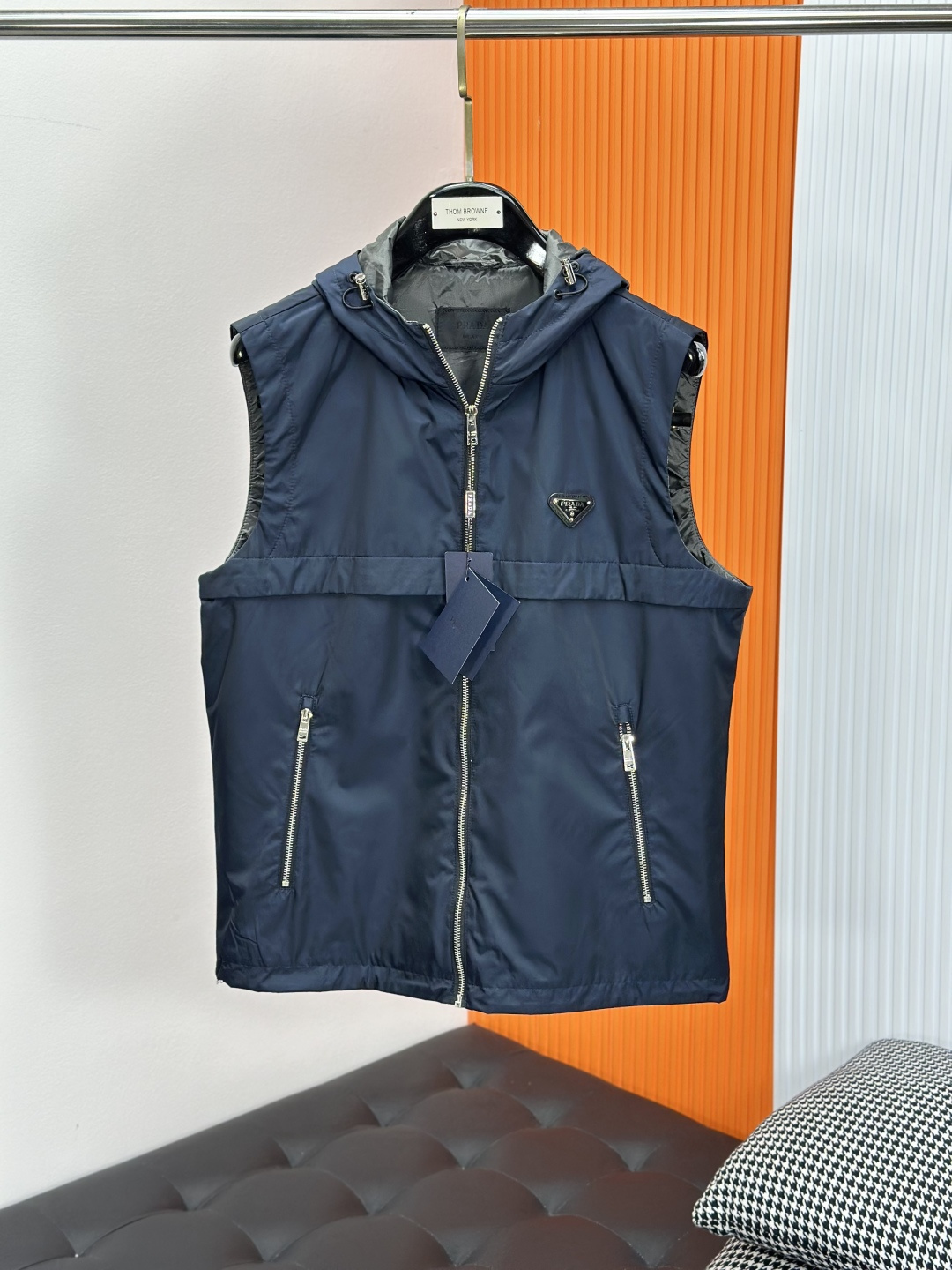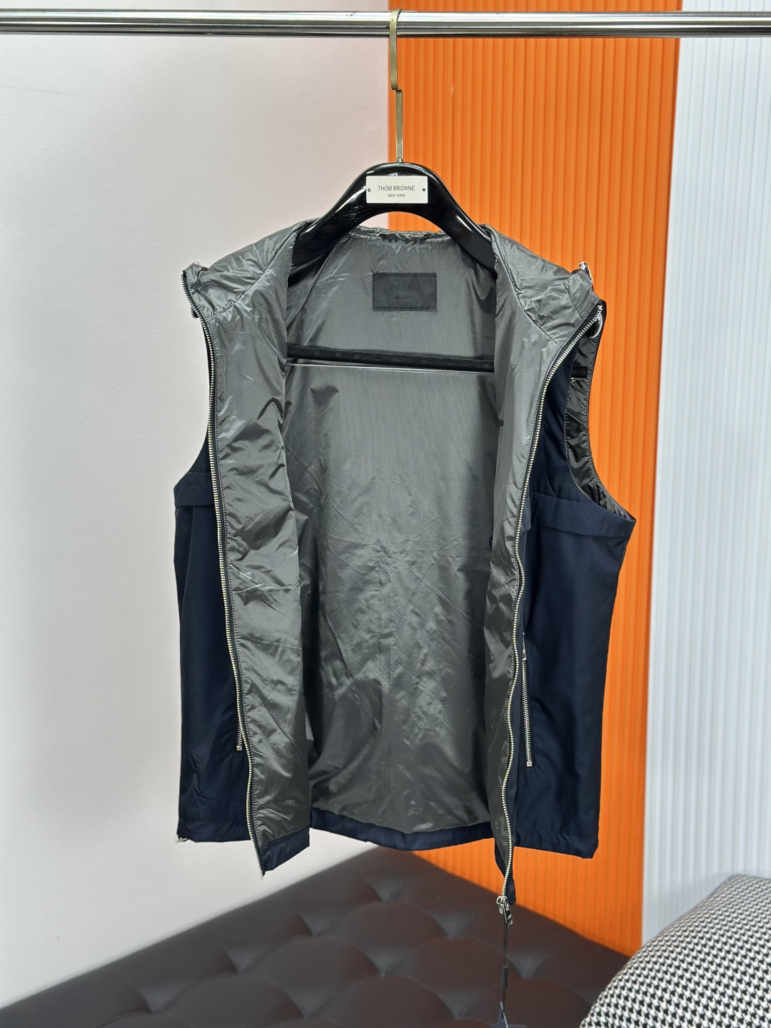 Prada vest with chest triangle logo. Soft, breathable fabric. Chic chest pocket adds style. Versatile for daily wear. Sizes 48-56.