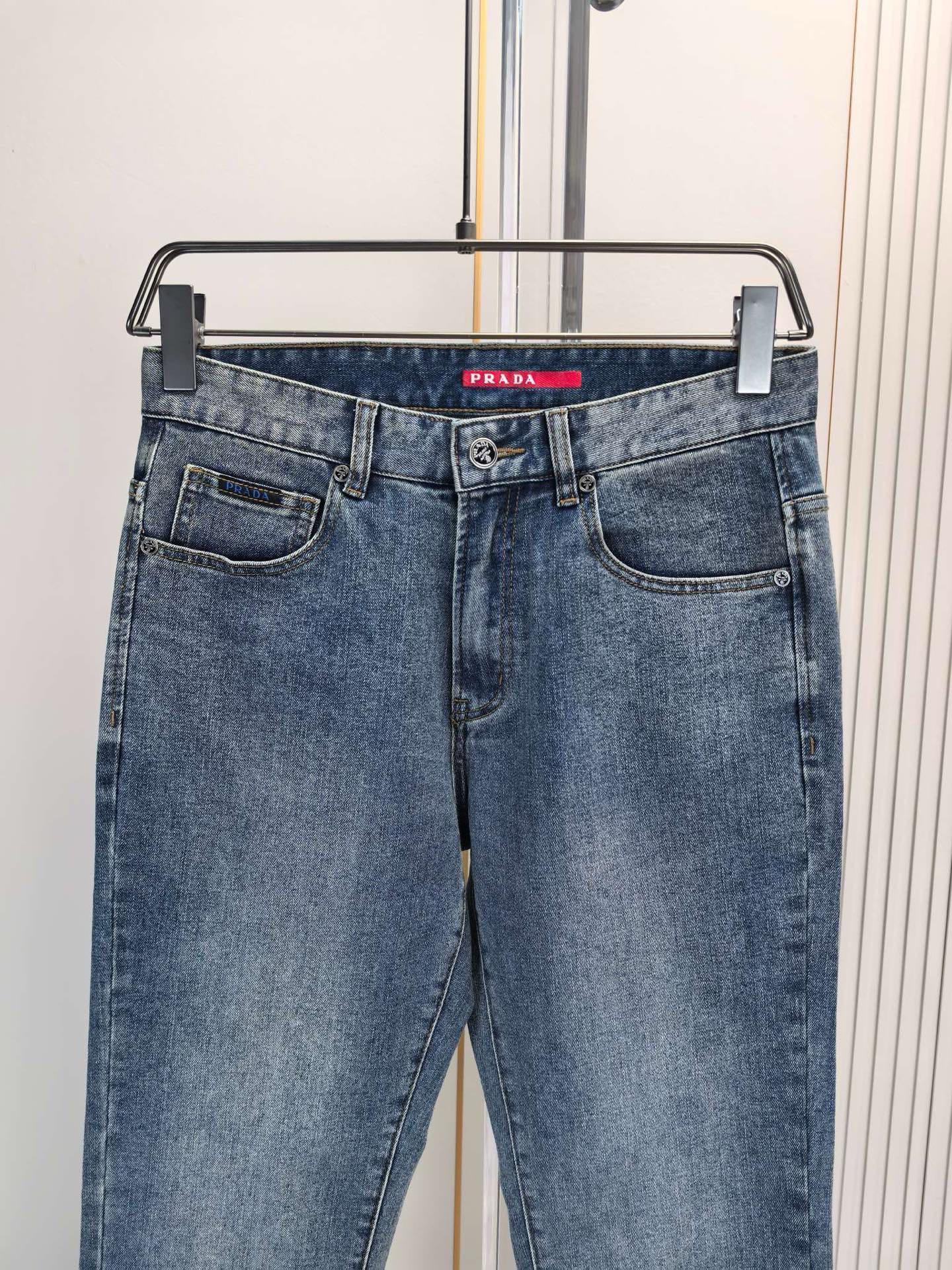 Prada 2025 early fall men's jeans. Heavy wash custom denim, soft & comfortable. Top craftsmanship, breathable. Custom hardware logo. Sizes 29-40.