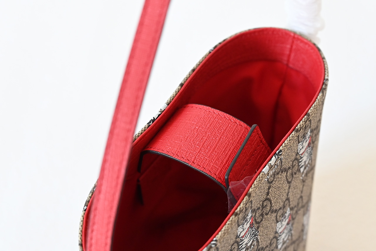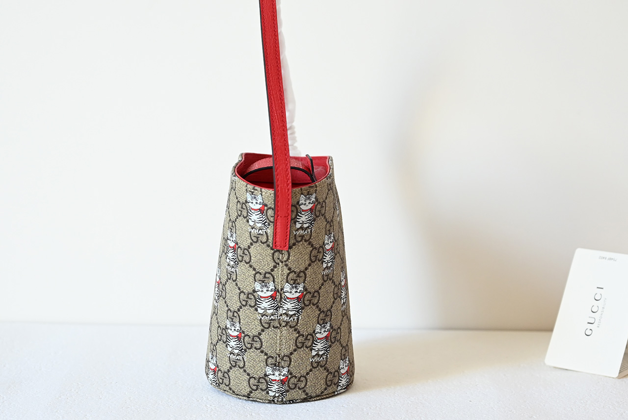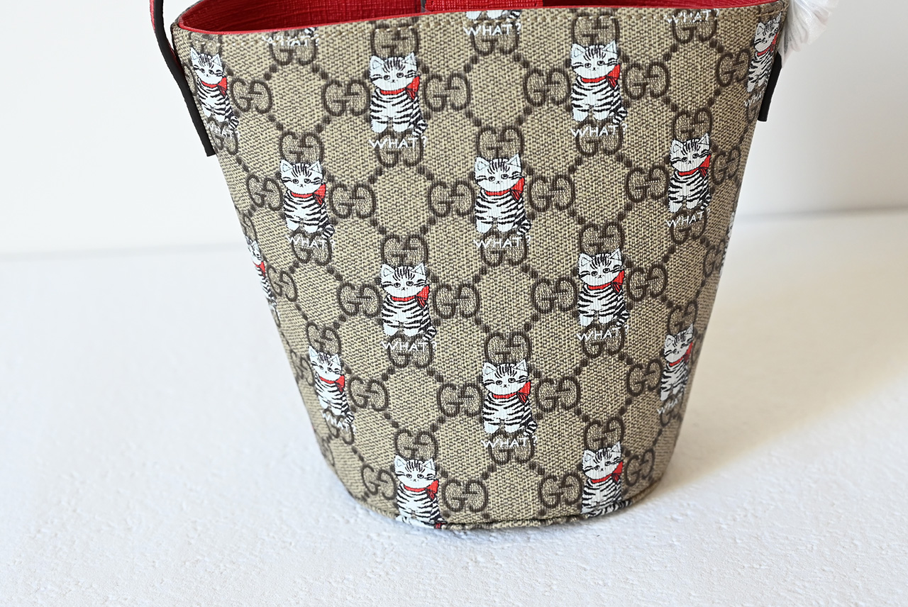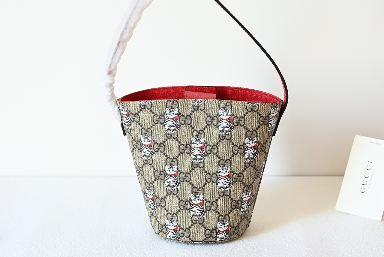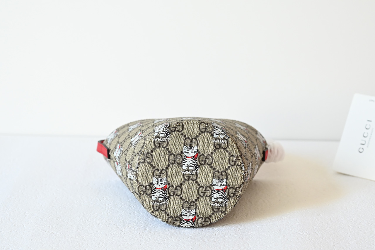【New Arrival】 Korean illustrator and writer Seungyoun Kim is known for her charming and adorable designs, and her work evokes familiar scenes from childhood. She integrates prints and embroidery of puppies and other animals with the brand name, adding charm to the Early Spring 2025 children's collection. This GG Supreme bucket bag is artfully decorated with an all-over print of puppies and mushrooms.