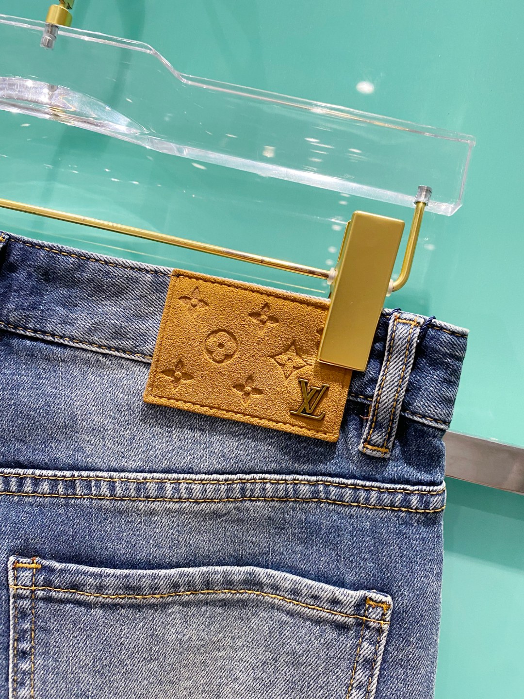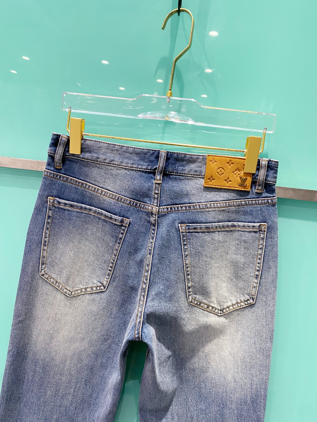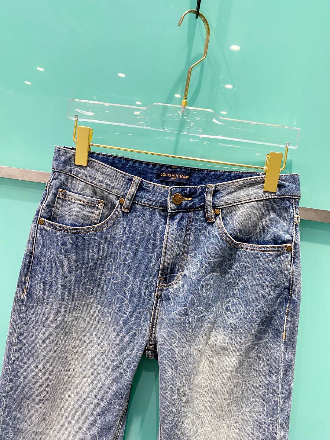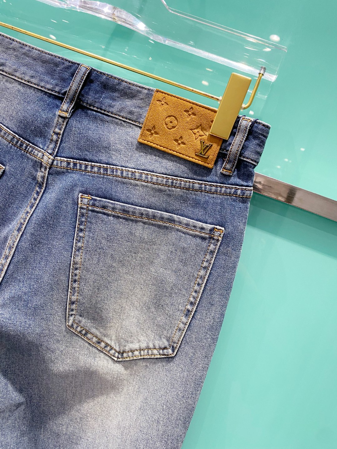 LV 2025 early fall men's casual jeans, top quality. Official website available. Custom cotton denim. Versatile for casual/formal wear. Sizes 29-38.