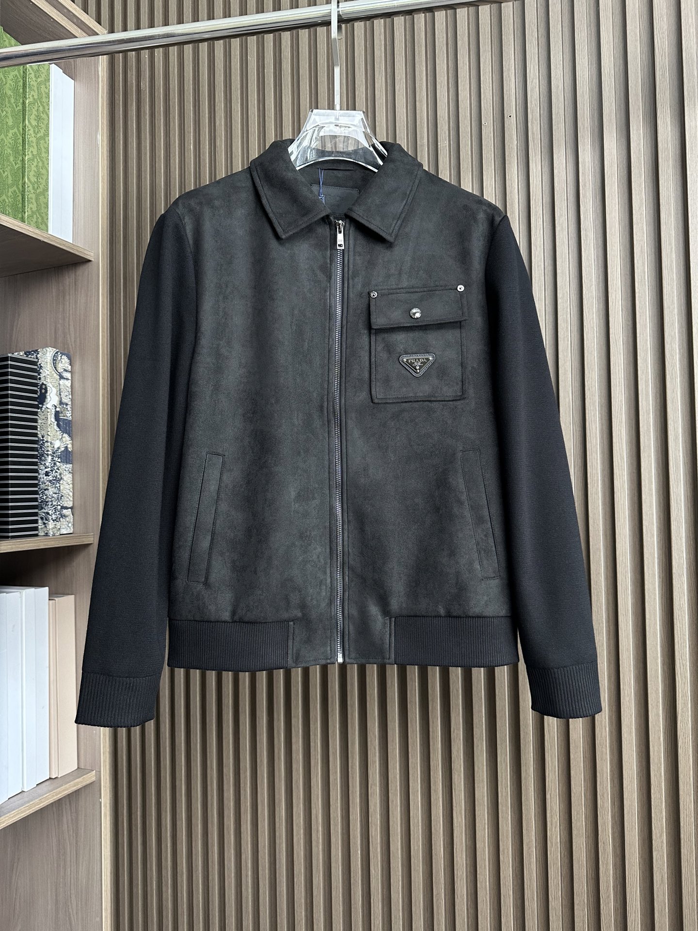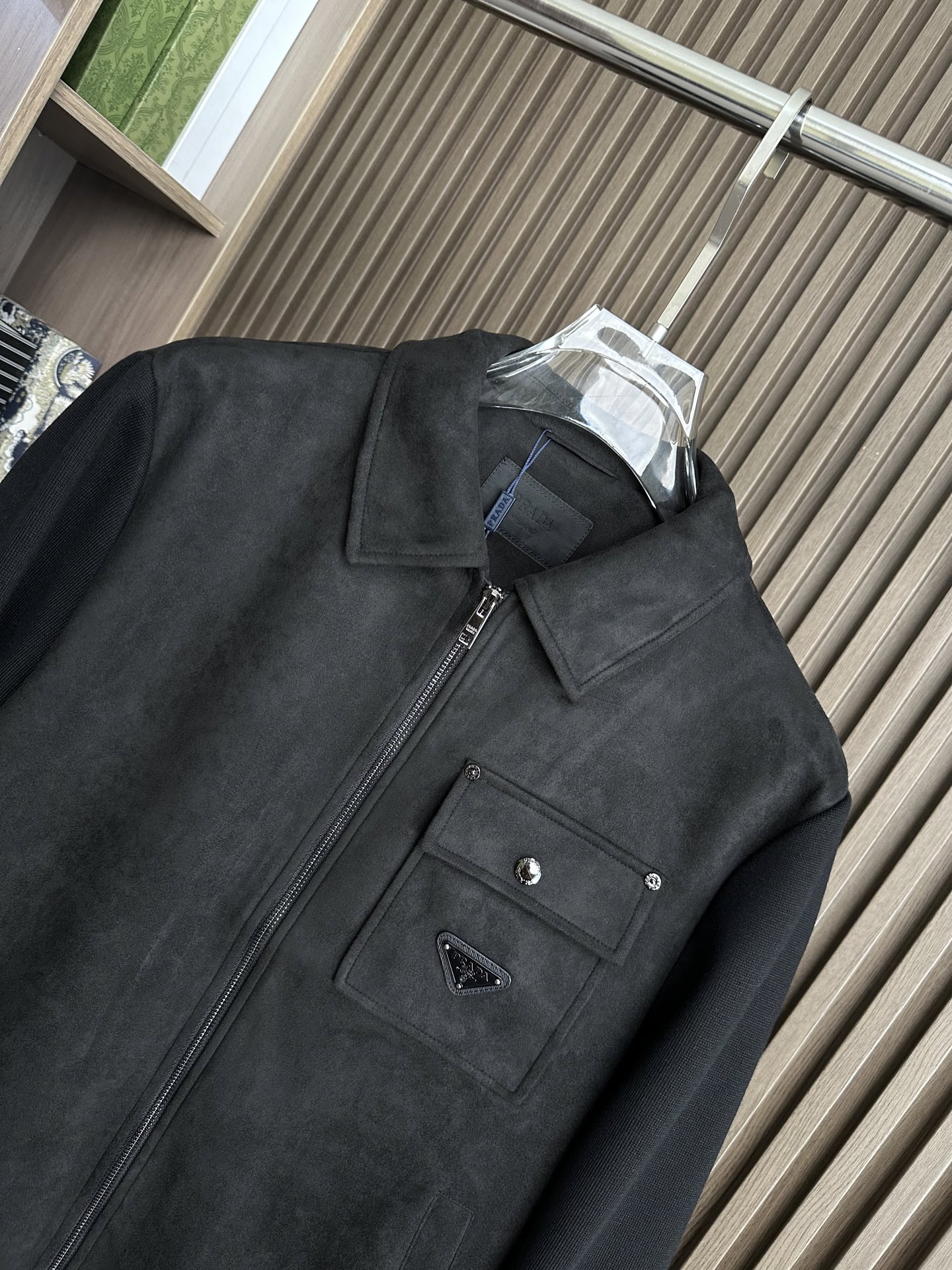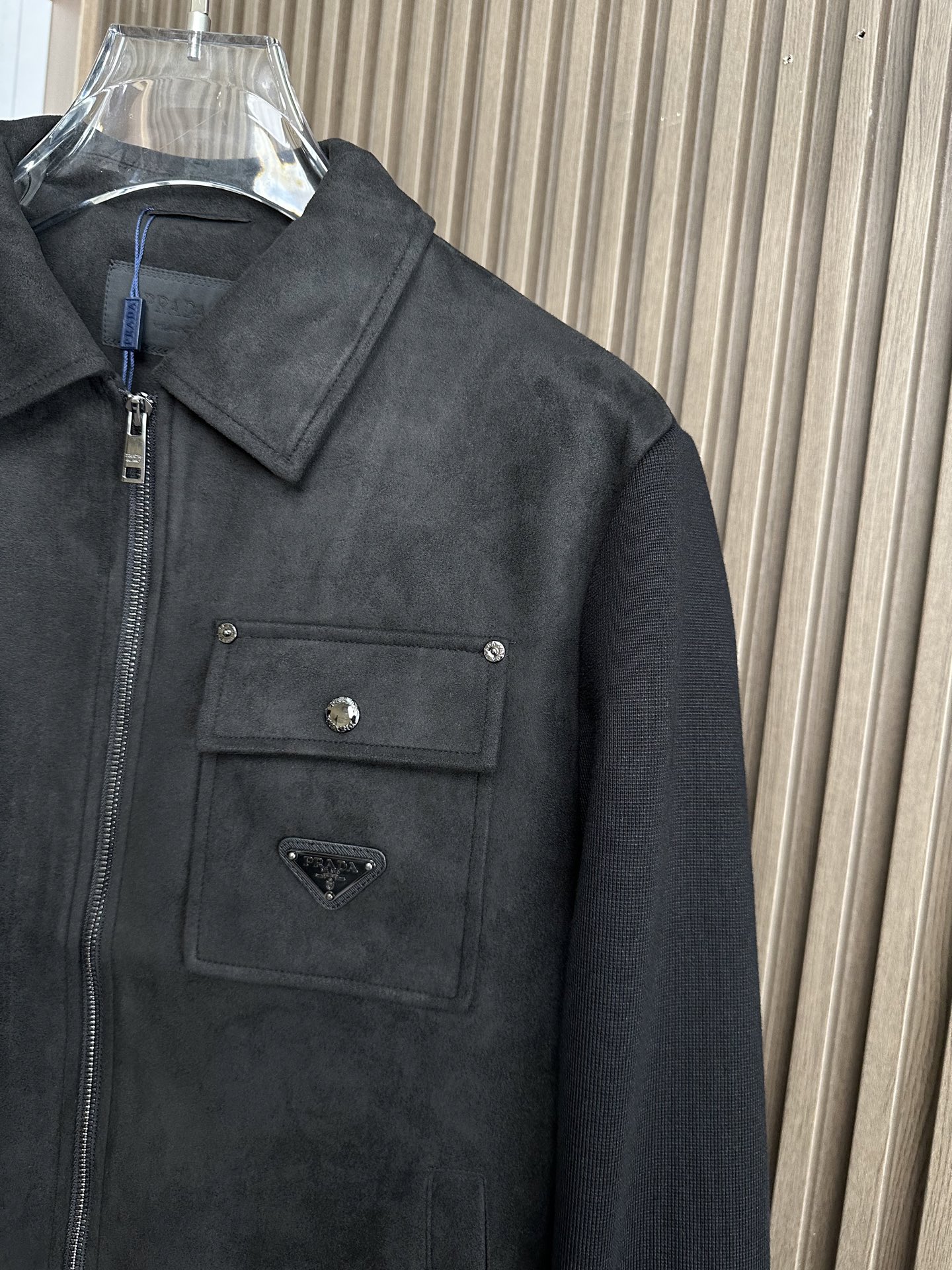 Prada秋冬夹克,麂皮绒拼接大翻领双口袋设计。黑色、棕色、藏蓝色。尺码M-3XL。适合商务休闲。