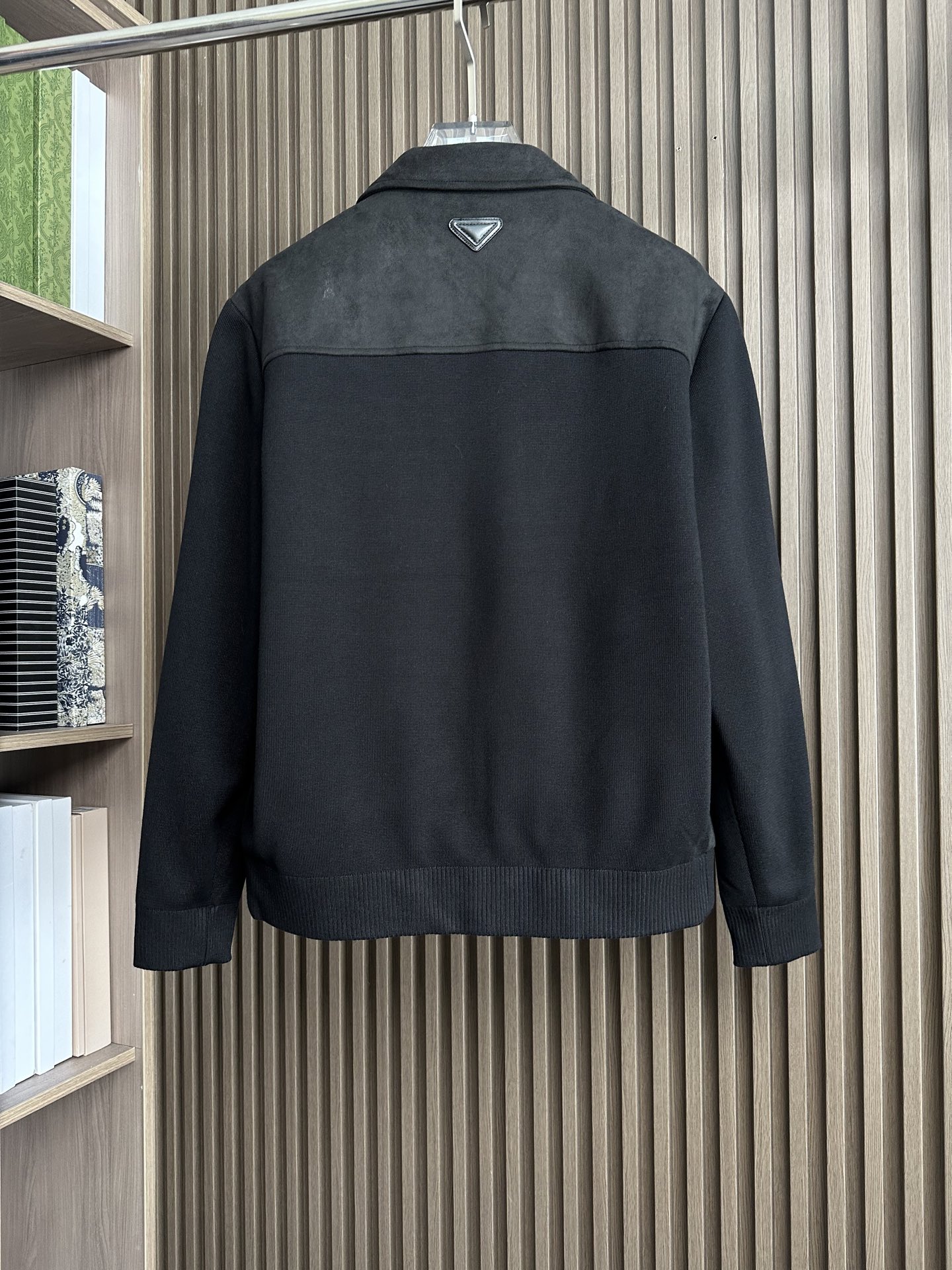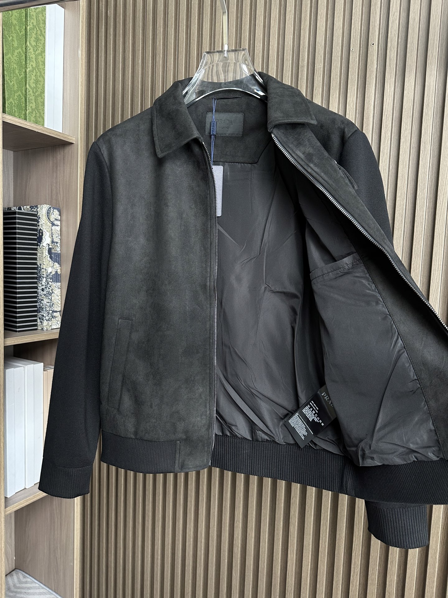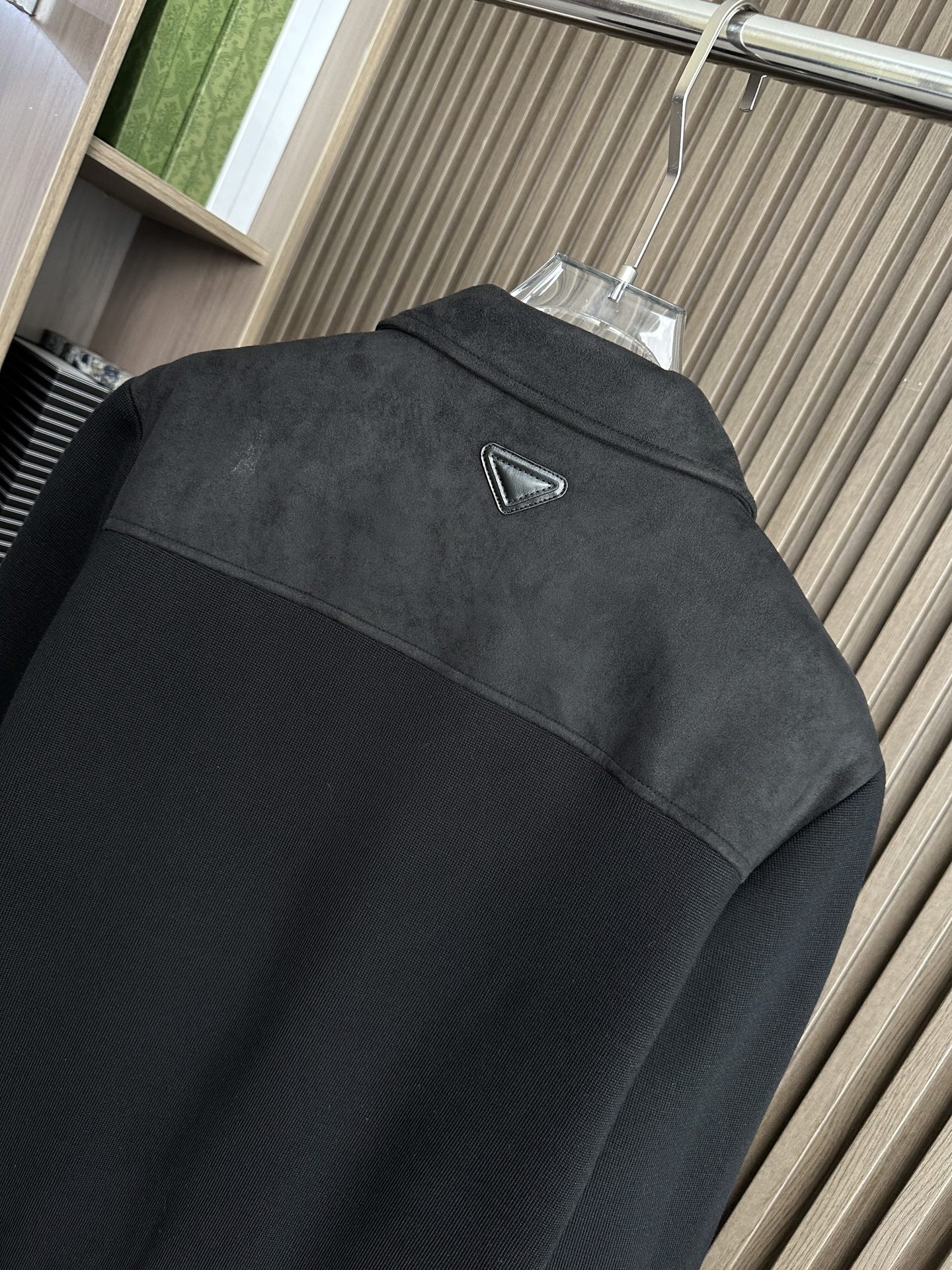 Prada秋冬夹克,麂皮绒拼接大翻领双口袋设计。黑色、棕色、藏蓝色。尺码M-3XL。适合商务休闲。
