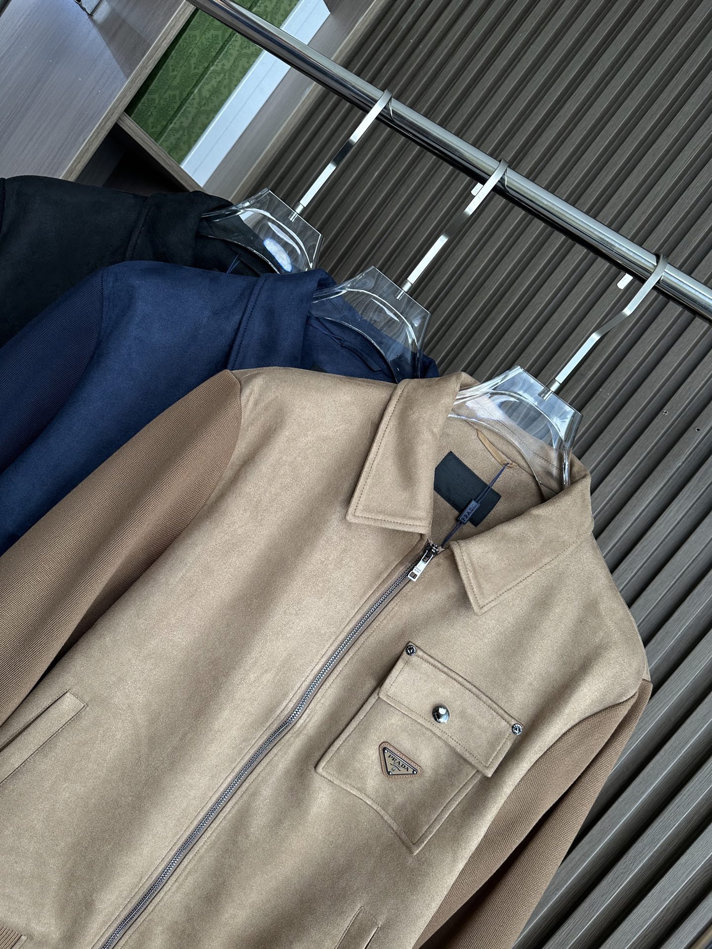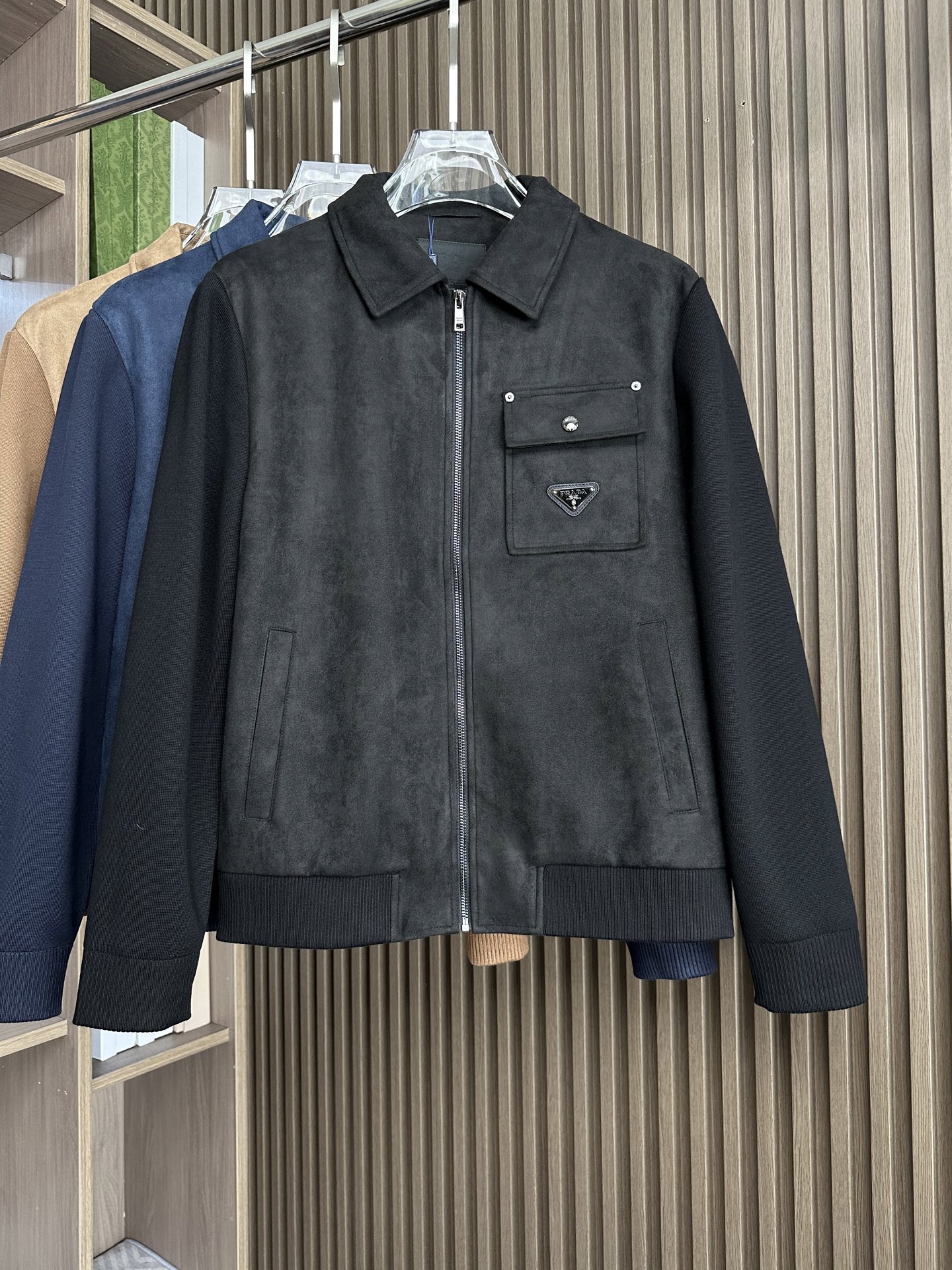 Prada autumn-winter jacket with large collar, suede blend, dual pockets. Available in black, brown, navy. Sizes M-3XL.