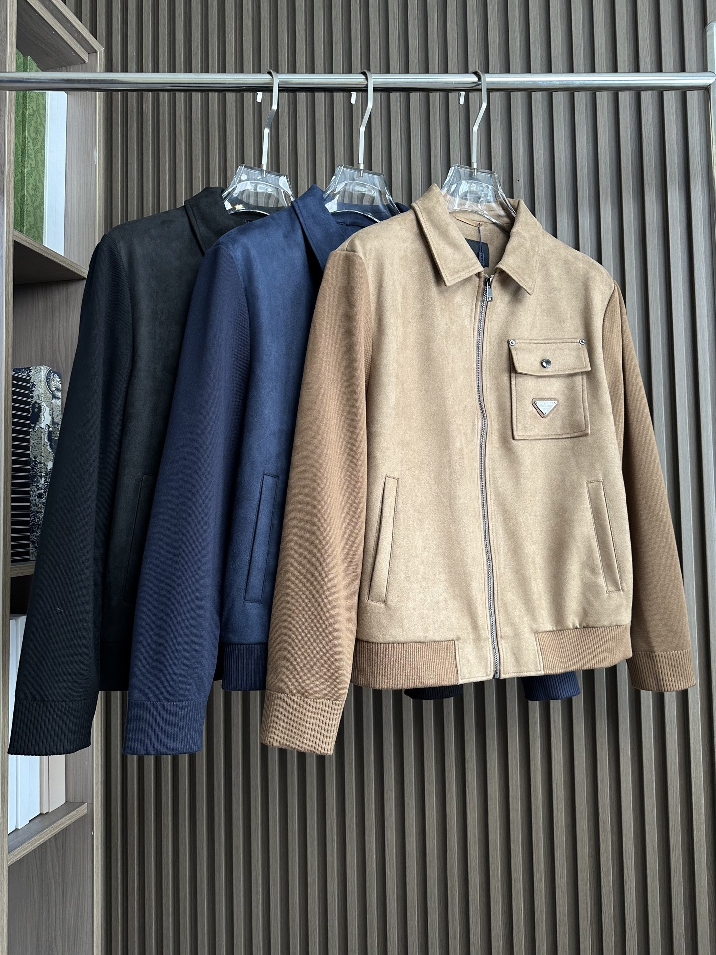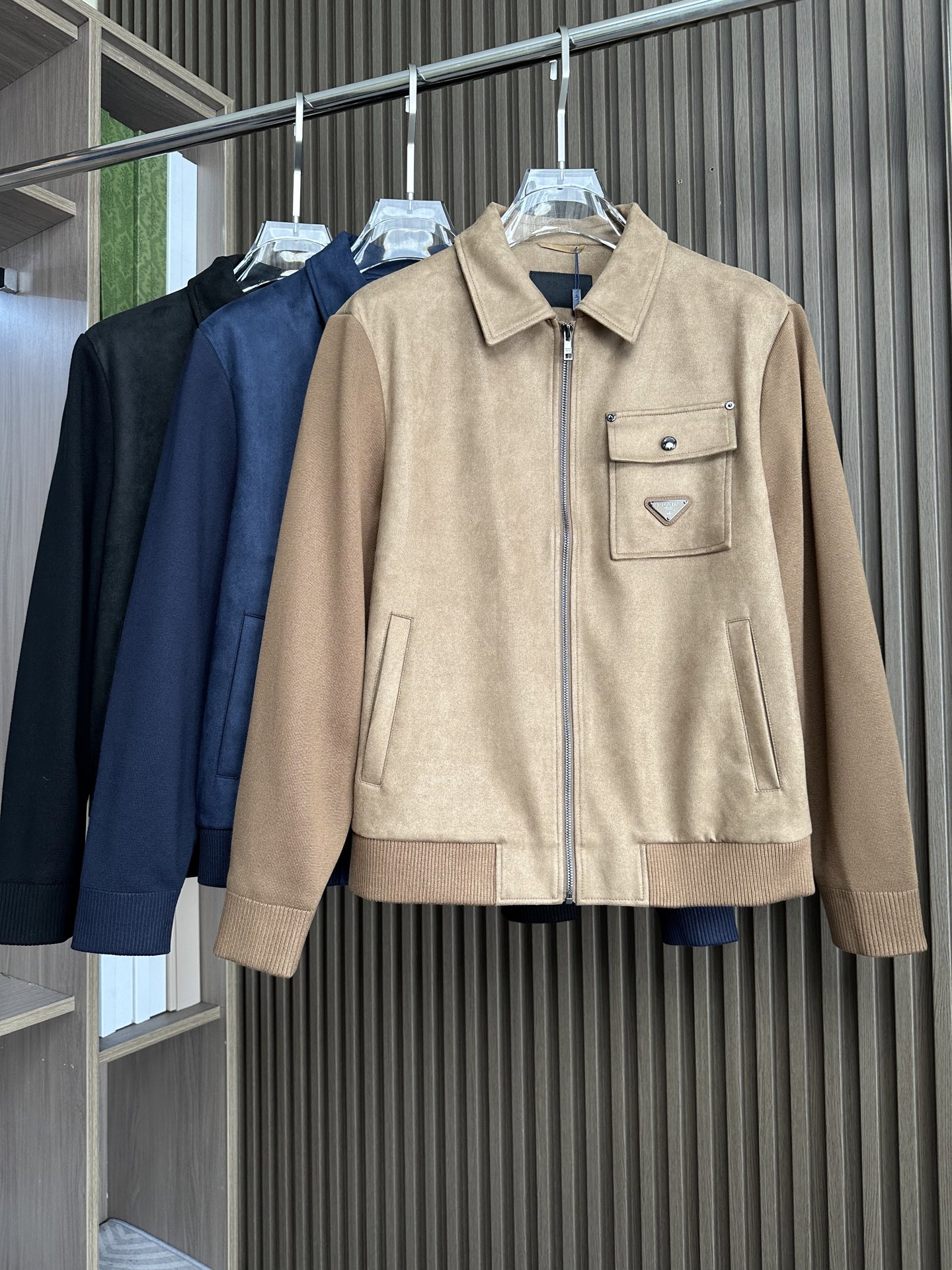 Prada秋冬新款夹克,麂皮绒拼接大翻领双口袋设计。精选面料,质感奢华,适合多种场合。颜色:黑、棕、藏蓝。尺码:M-3XL。