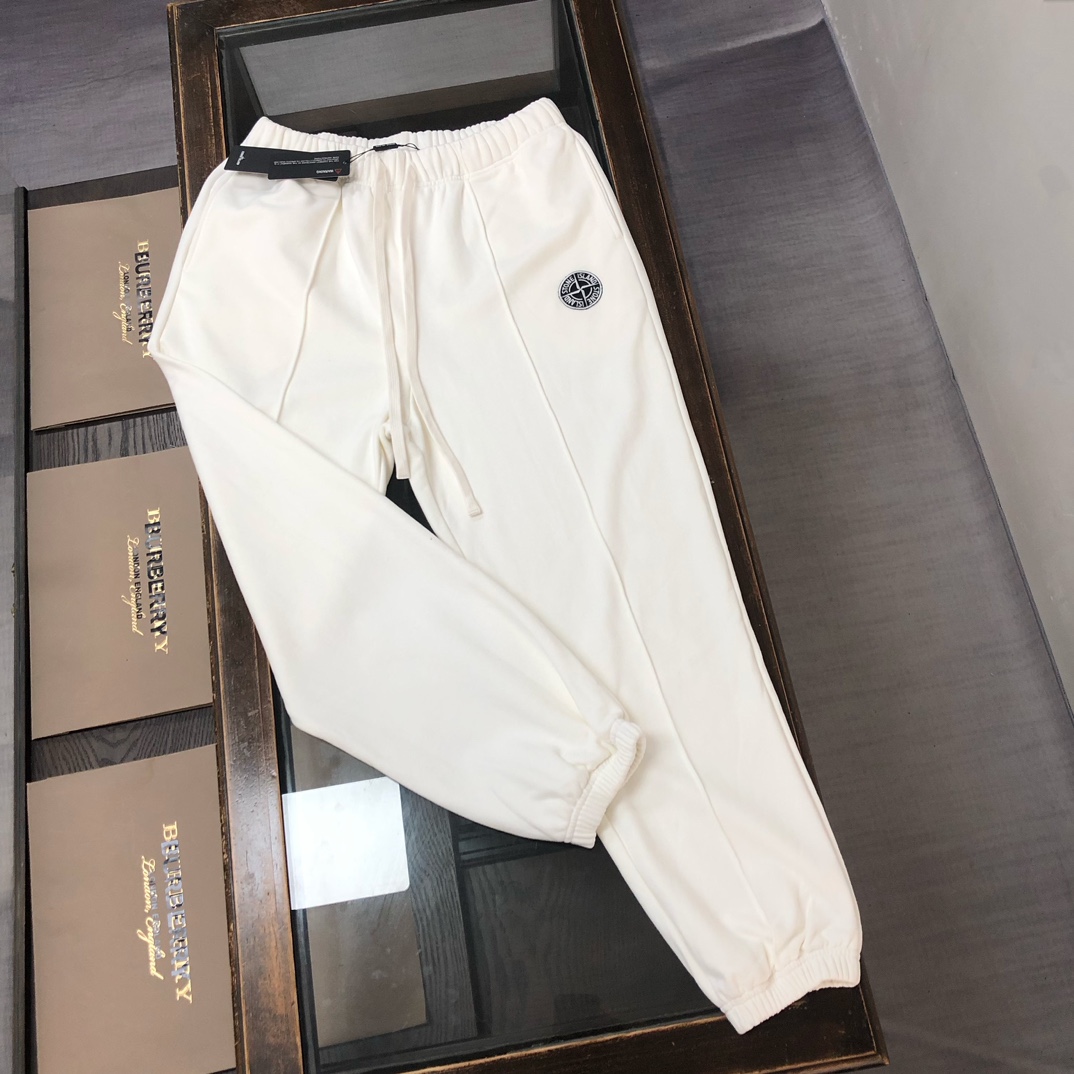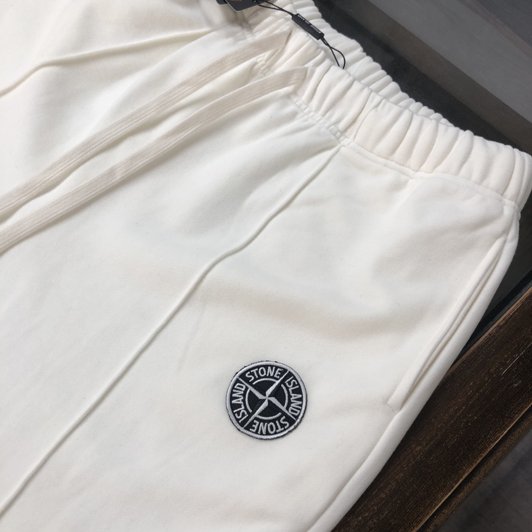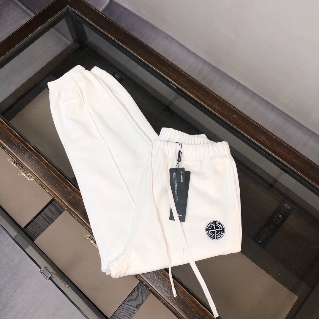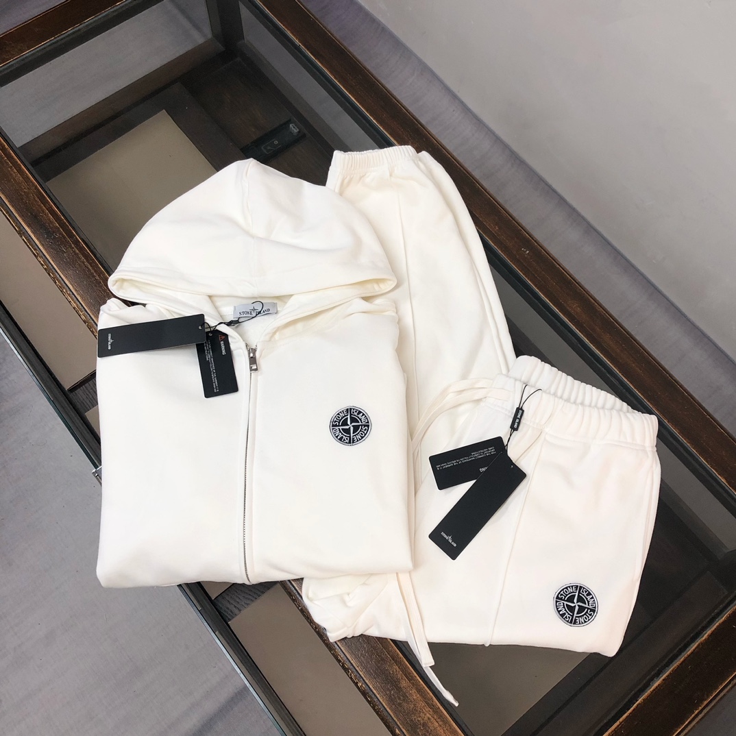 Stone Island 2025 early autumn couples hoodie & pants set. Features 3D tailoring, custom fabric, breathable. Embroidered compass logo. Colors: black, white, blue, gray. Sizes: S-XXL.