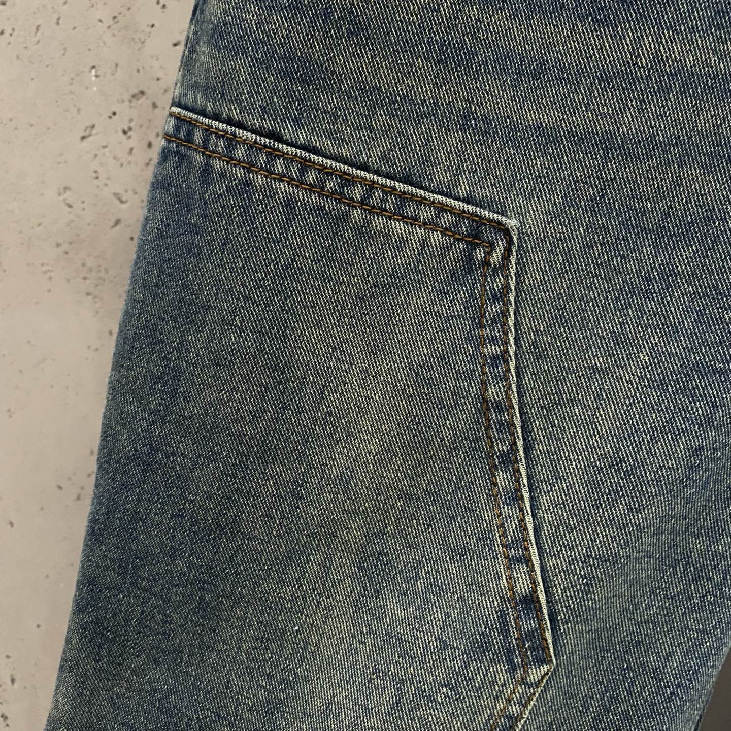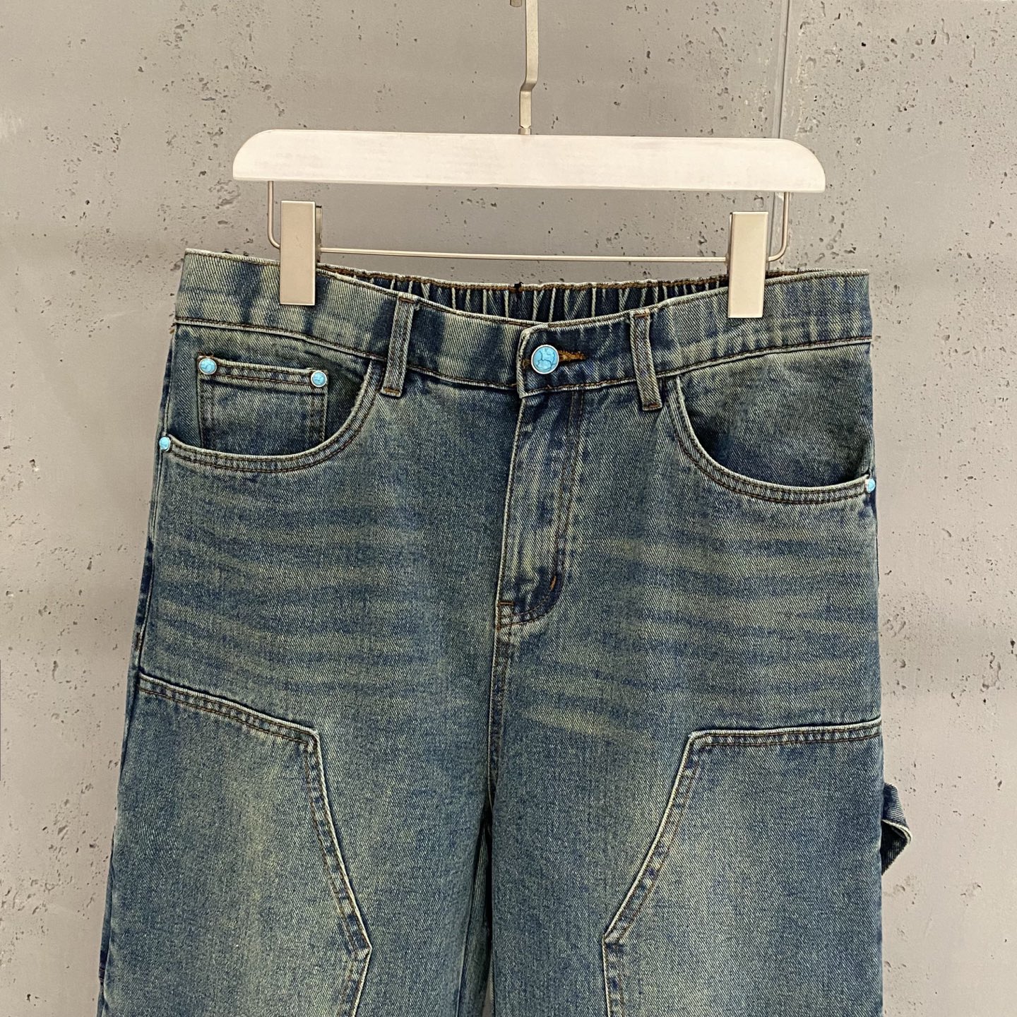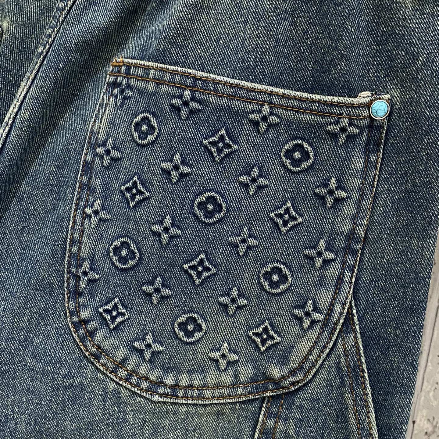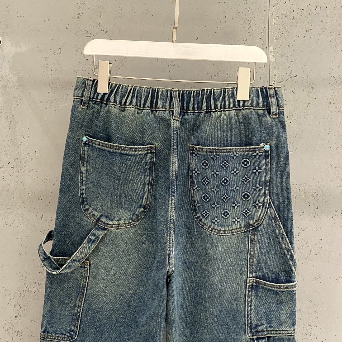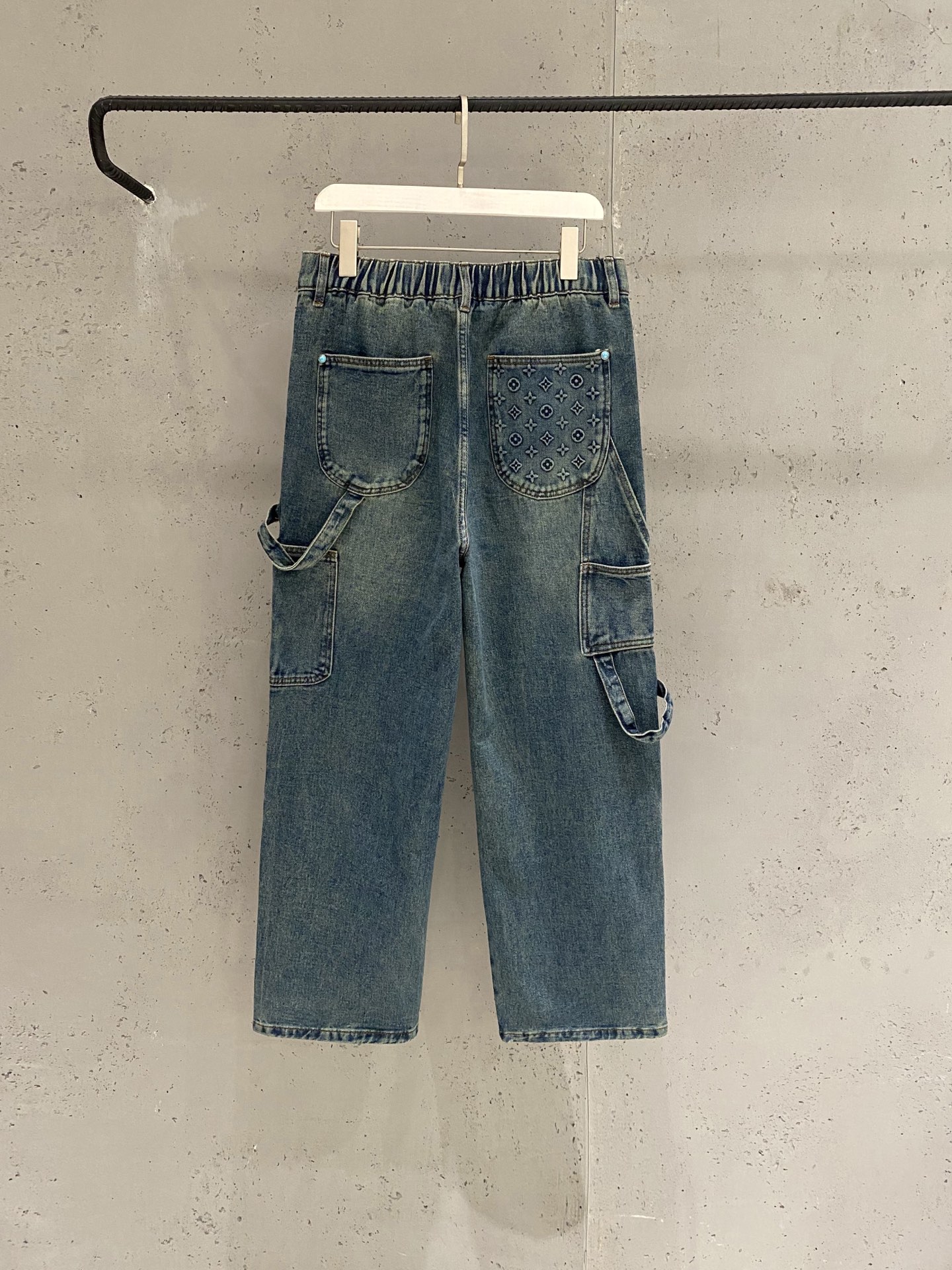 2025 Fall/Winter Vuit*on Monogram straight leg loose fit cargo jeans. Unisex wash blue. Sizes XS-L. Made with soft Okayama stone-washed twill cotton, selvedge detailing, and turquoise rivets.