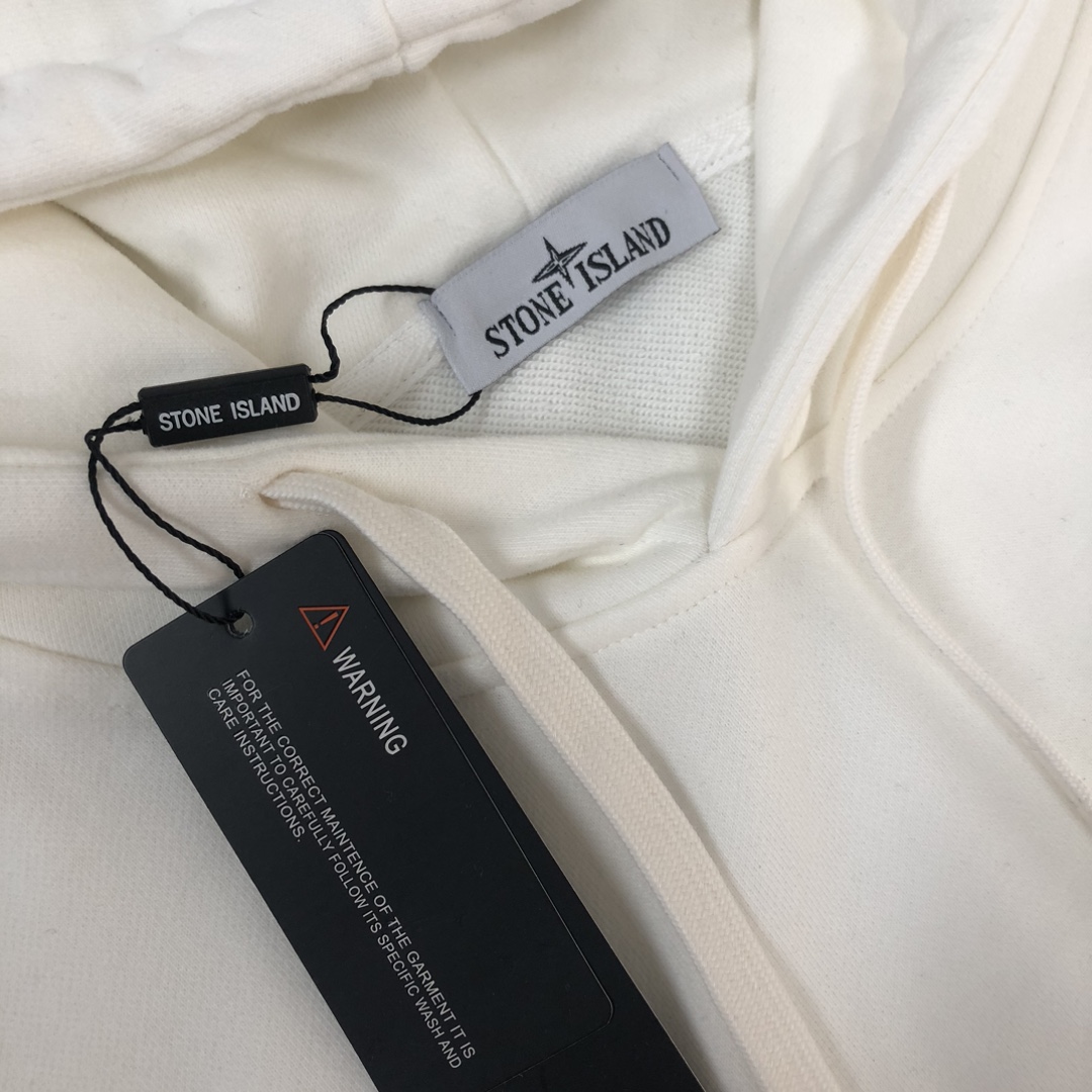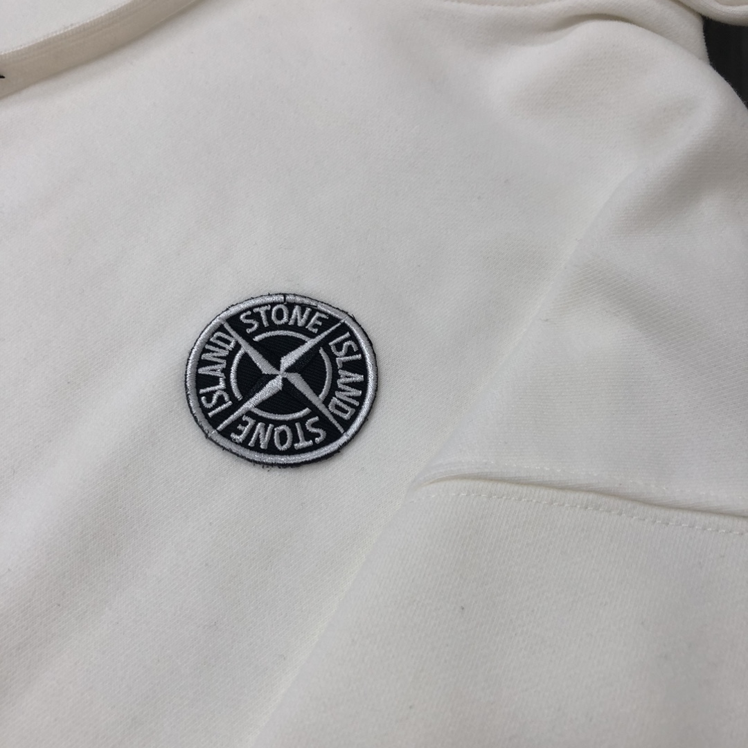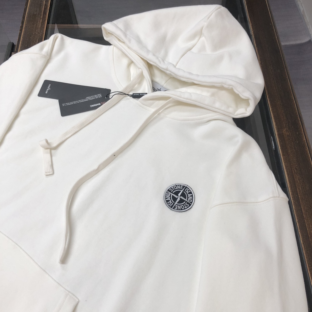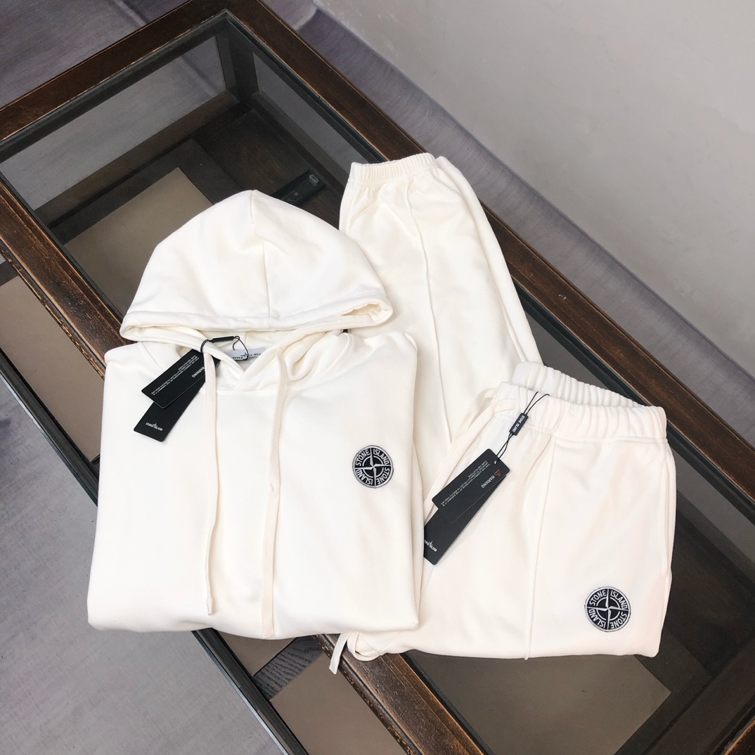 Stone Island 2025 early autumn couples hoodie & jogger set. Custom Italian fabric, breathable, embroidered logo. Colors: black, white, blue, gray. Sizes: S-XXL.