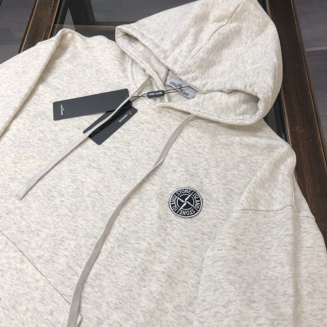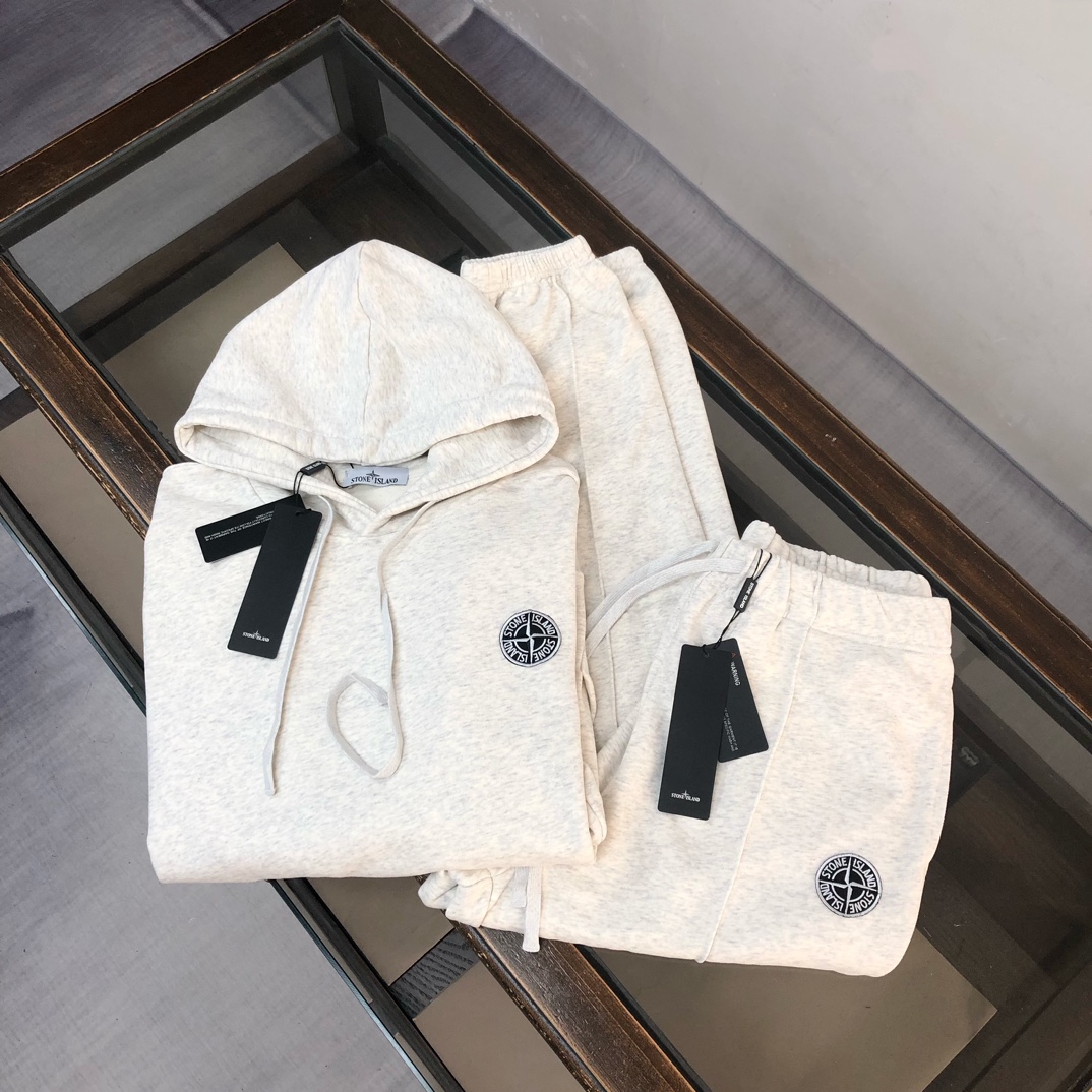 Stone Island 2025 early autumn couples hoodie & jogger set. Custom Italian fabric, breathable, embroidered logo. Colors: black, white, blue, gray. Sizes: S-XXL.