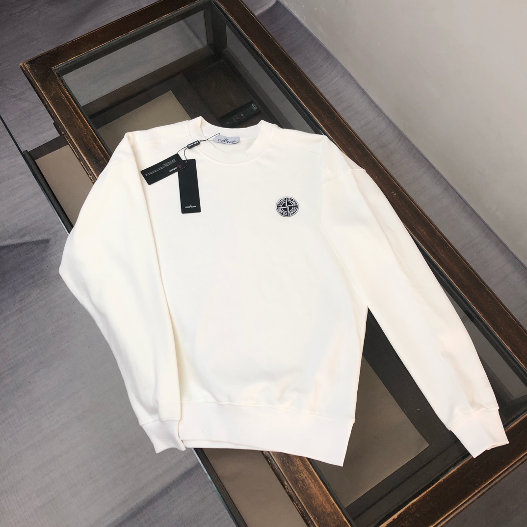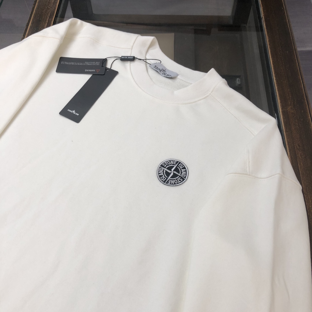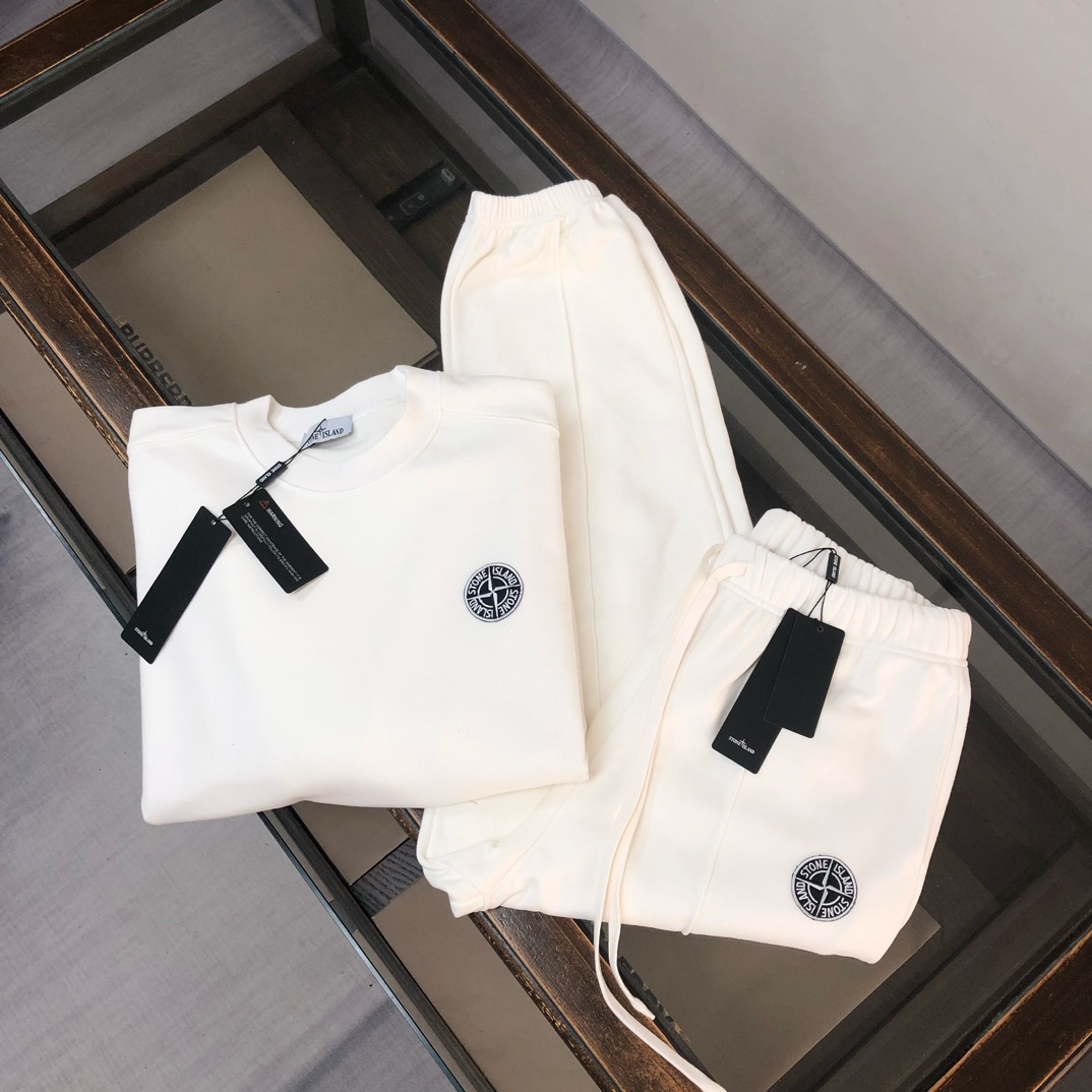 Stone Island 2025 early autumn couples hoodie & pants set. Features custom fabric, breathable, embroidered logo. Colors: black, white, blue, gray. Sizes: S-XXL.
