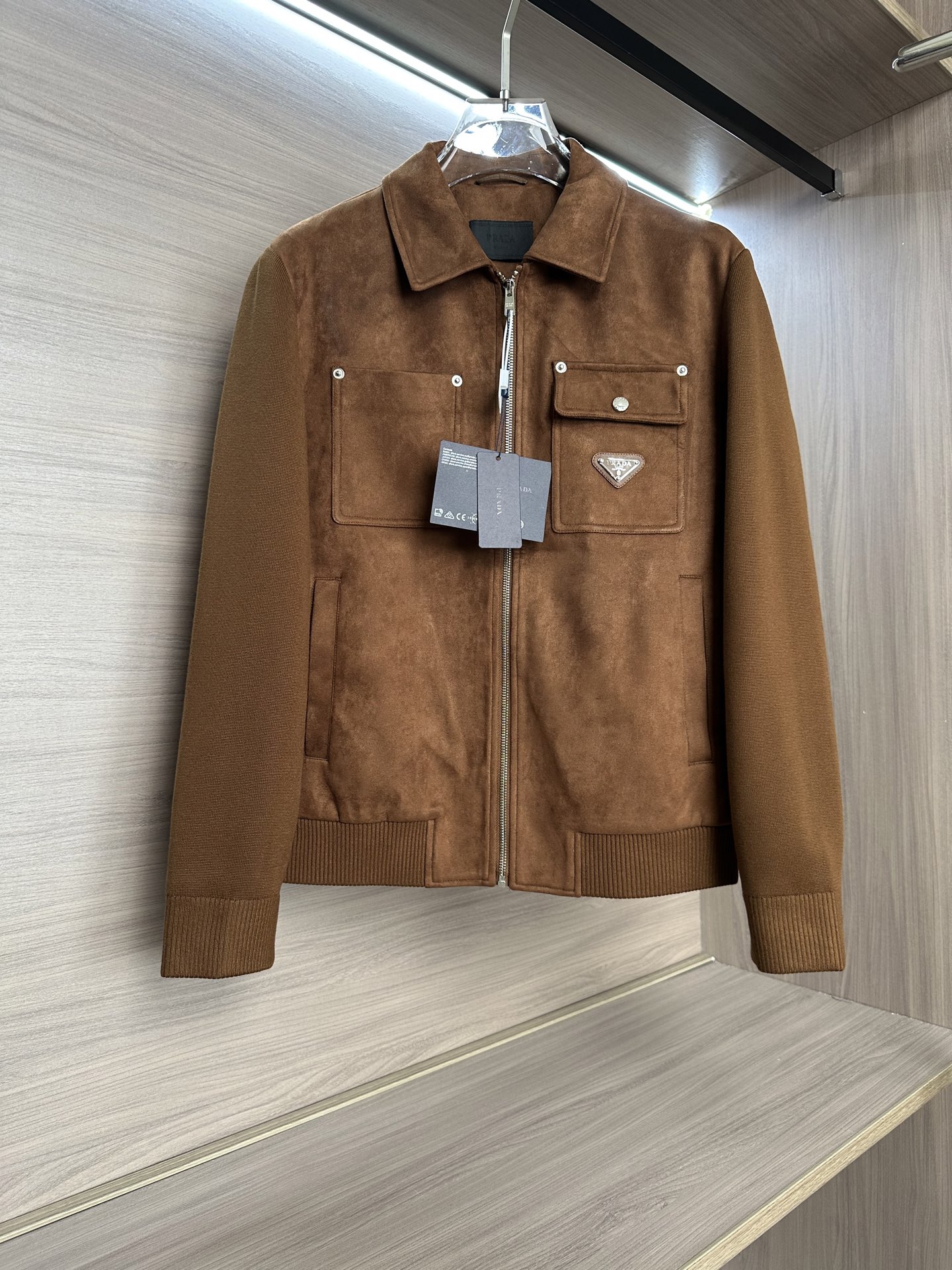 Prada autumn-winter jacket with suede collar and dual pockets. Available in black and brown, sizes M-3XL. Versatile design for various occasions.