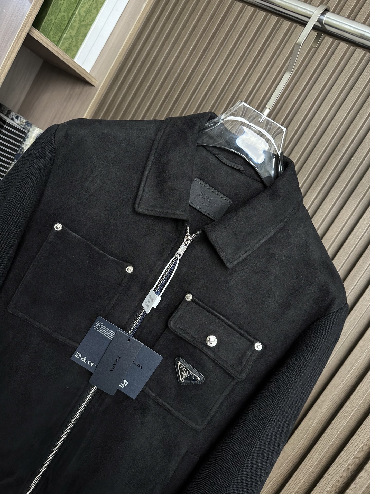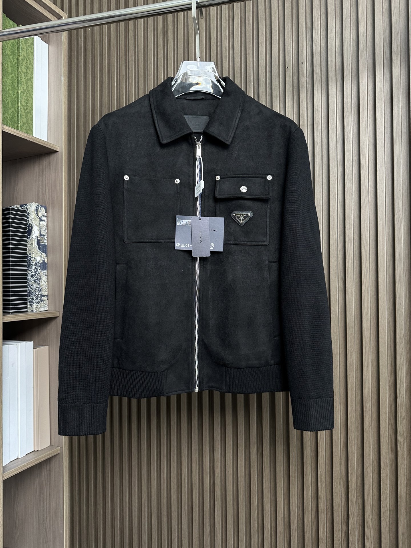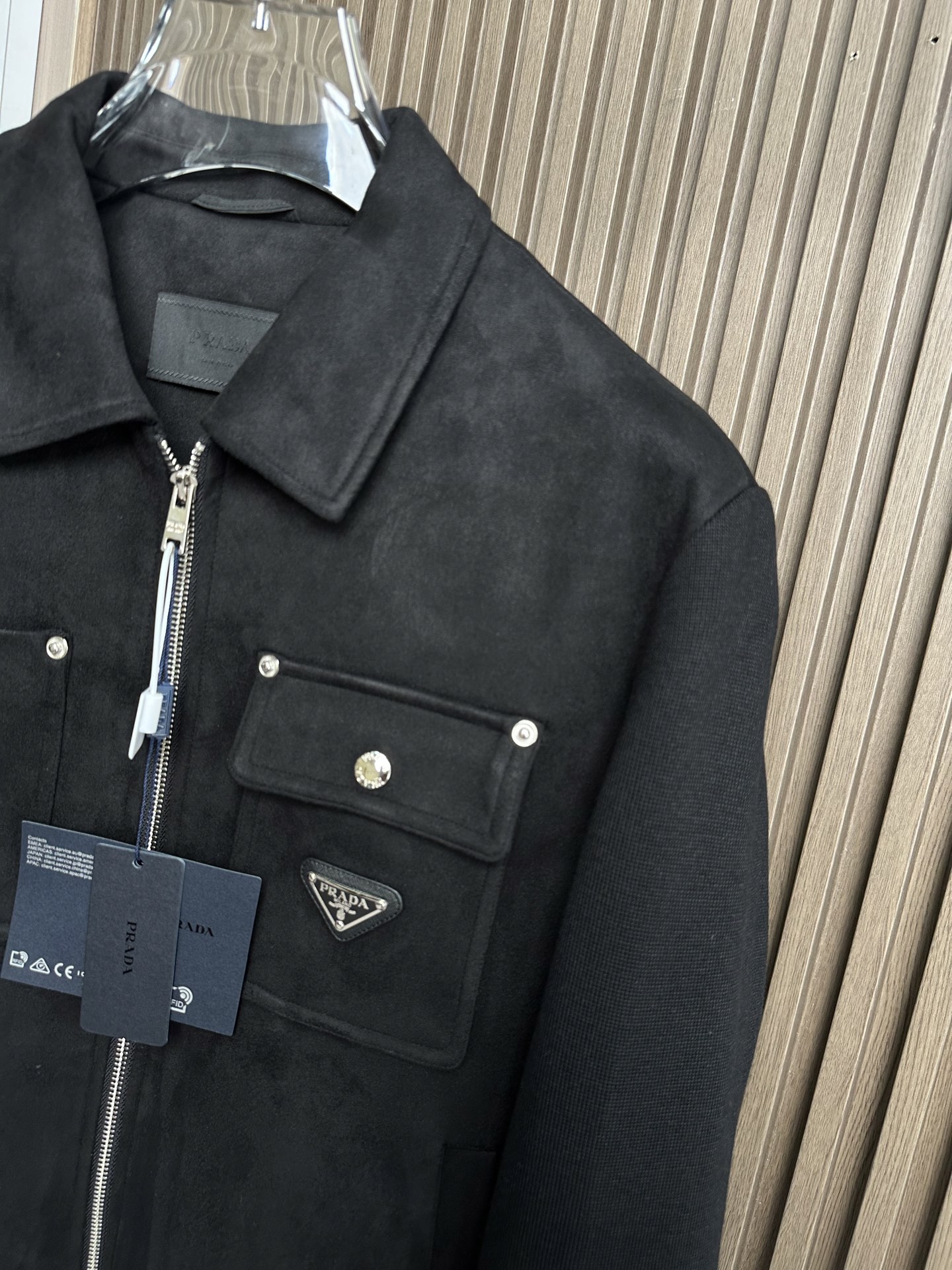 Prada autumn-winter jacket. Features large lapel, dual pockets, suede blend fabric. Versatile for casual or business wear. Colors: black, brown. Sizes M-3XL.