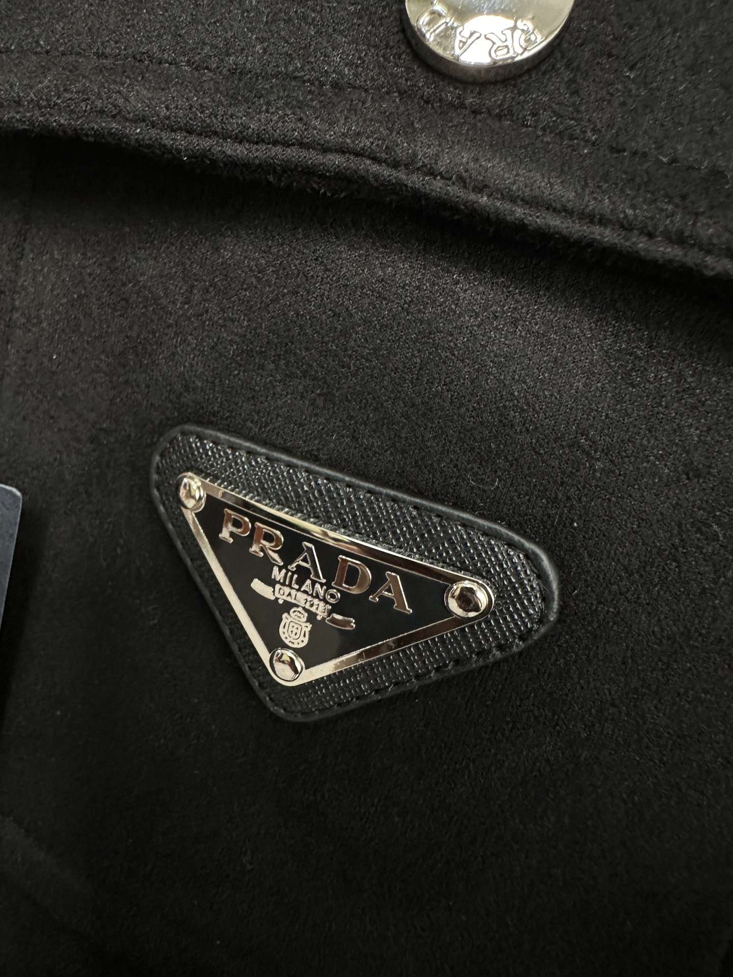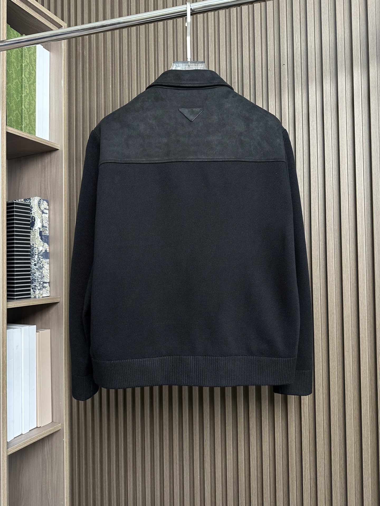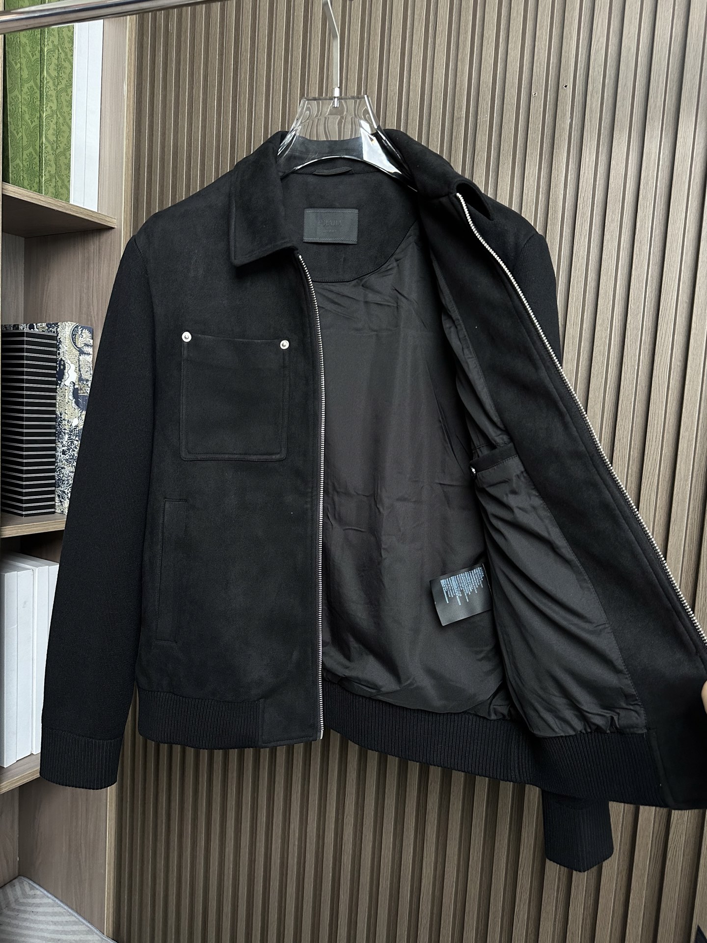 Prada autumn-winter jacket. Features large lapel, dual pockets, suede blend fabric. Versatile for casual or business wear. Colors: black, brown. Sizes M-3XL.