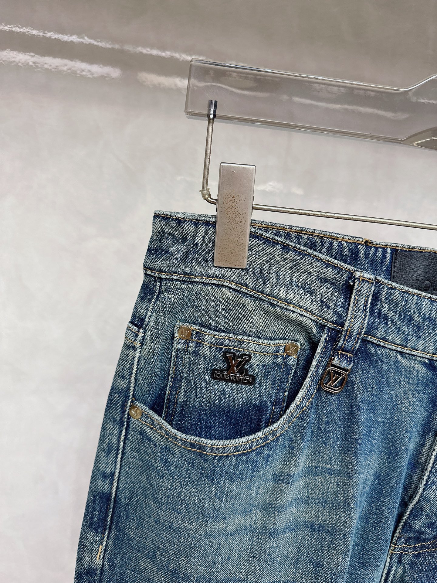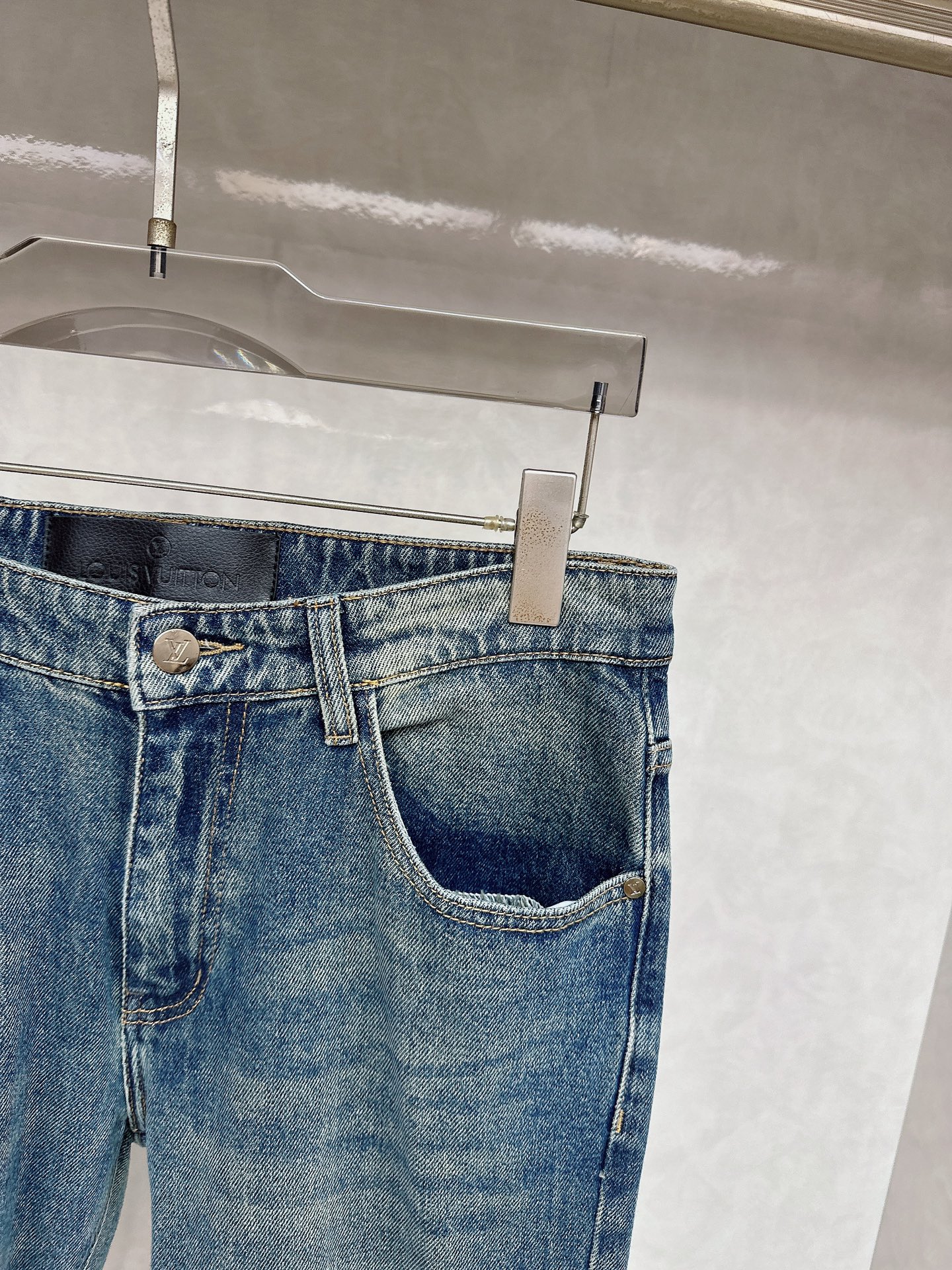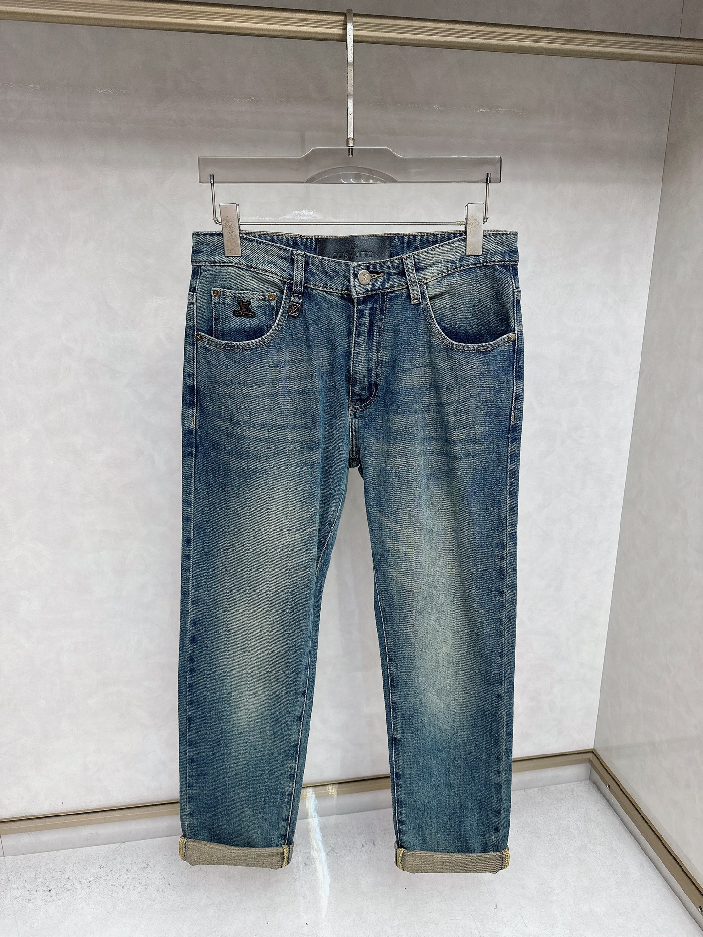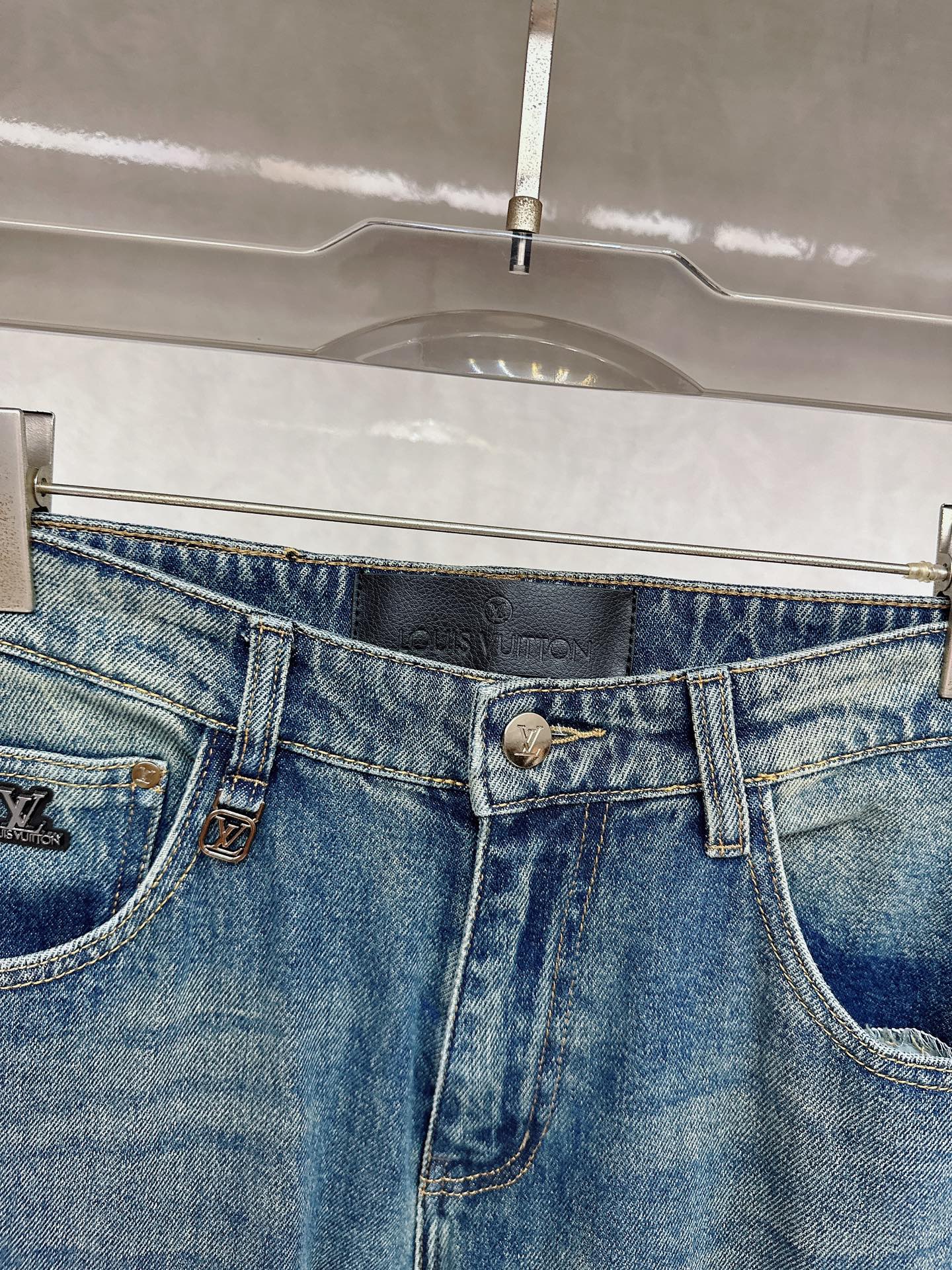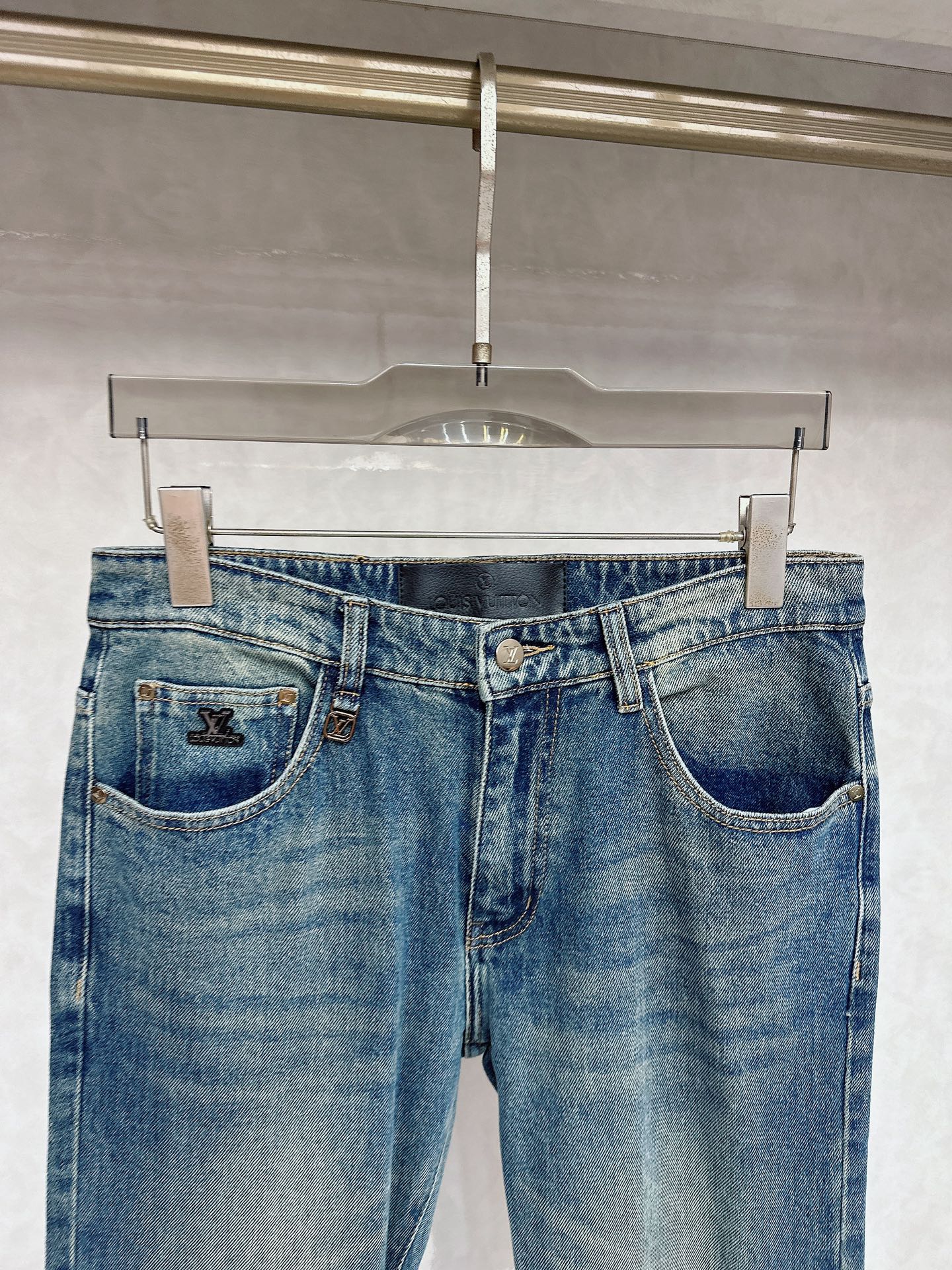 LV 2025 early autumn men's jeans. Original fabric and wash. Imported stretch denim, complex craftsmanship, unique color effects. Premium materials, leather label, metal hardware. Comfortable, breathable, high-quality. Sizes 30-38, no 37.