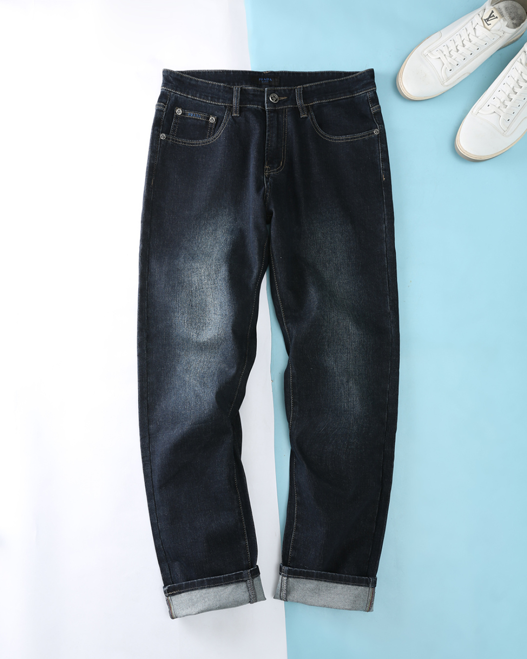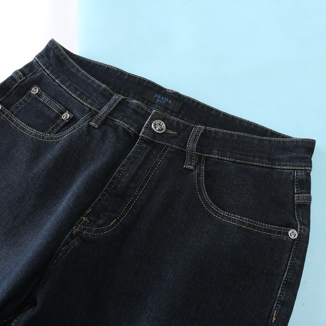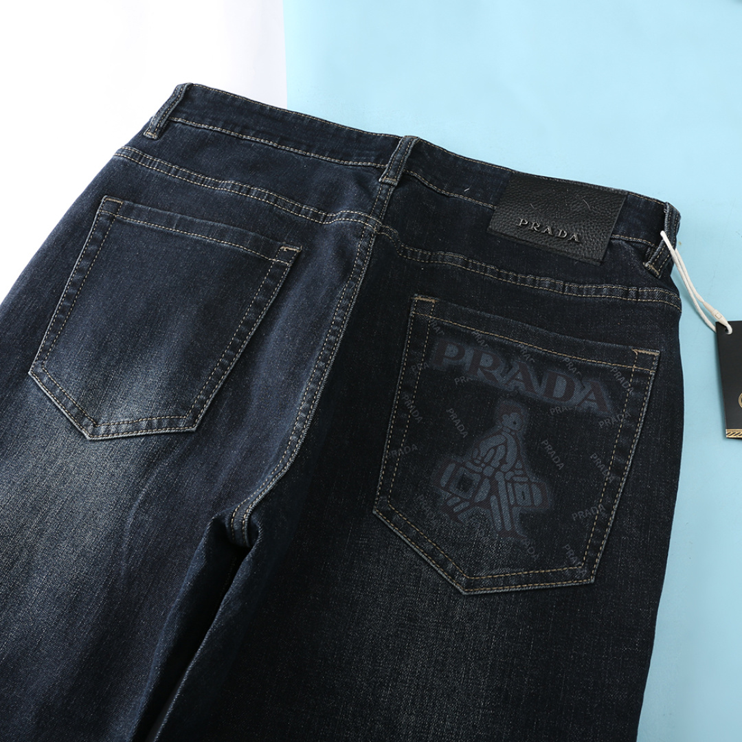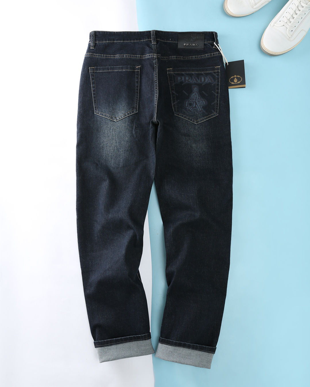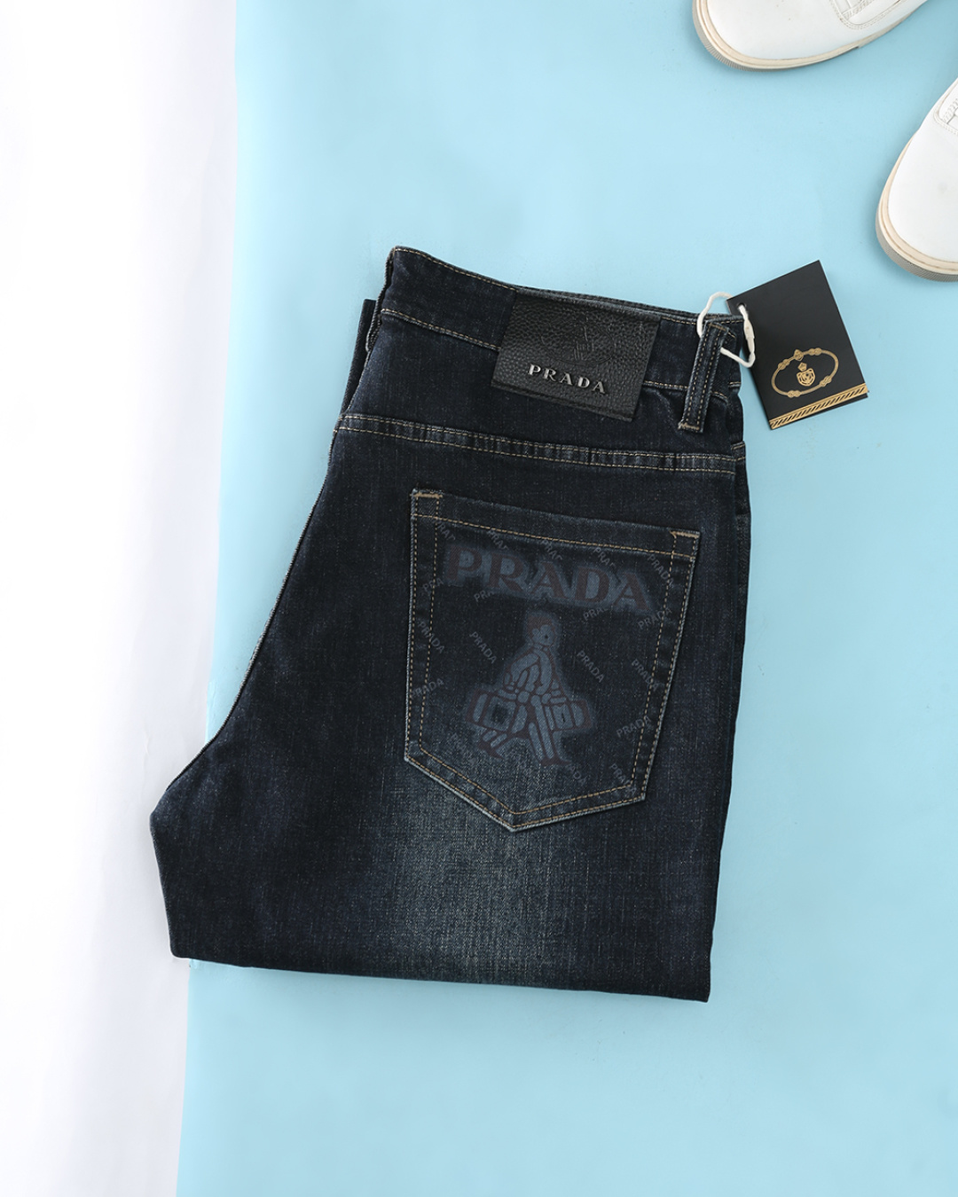 Prada 2025 AW men's denim jeans with back pocket print. Imported heavyweight fabric, yeast wash for vintage indigo. Classic 5-pocket design, straight leg. Sizes 29-42.