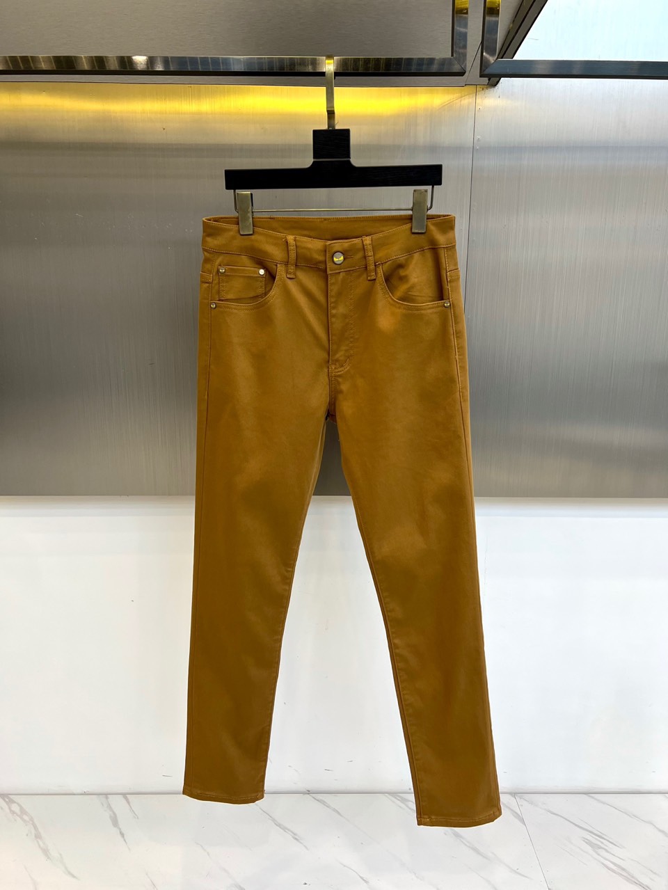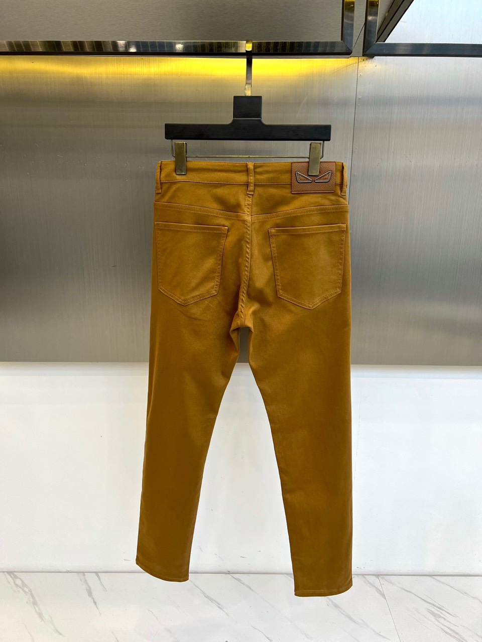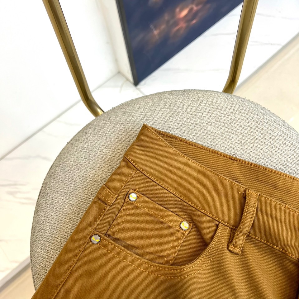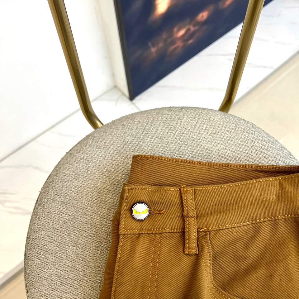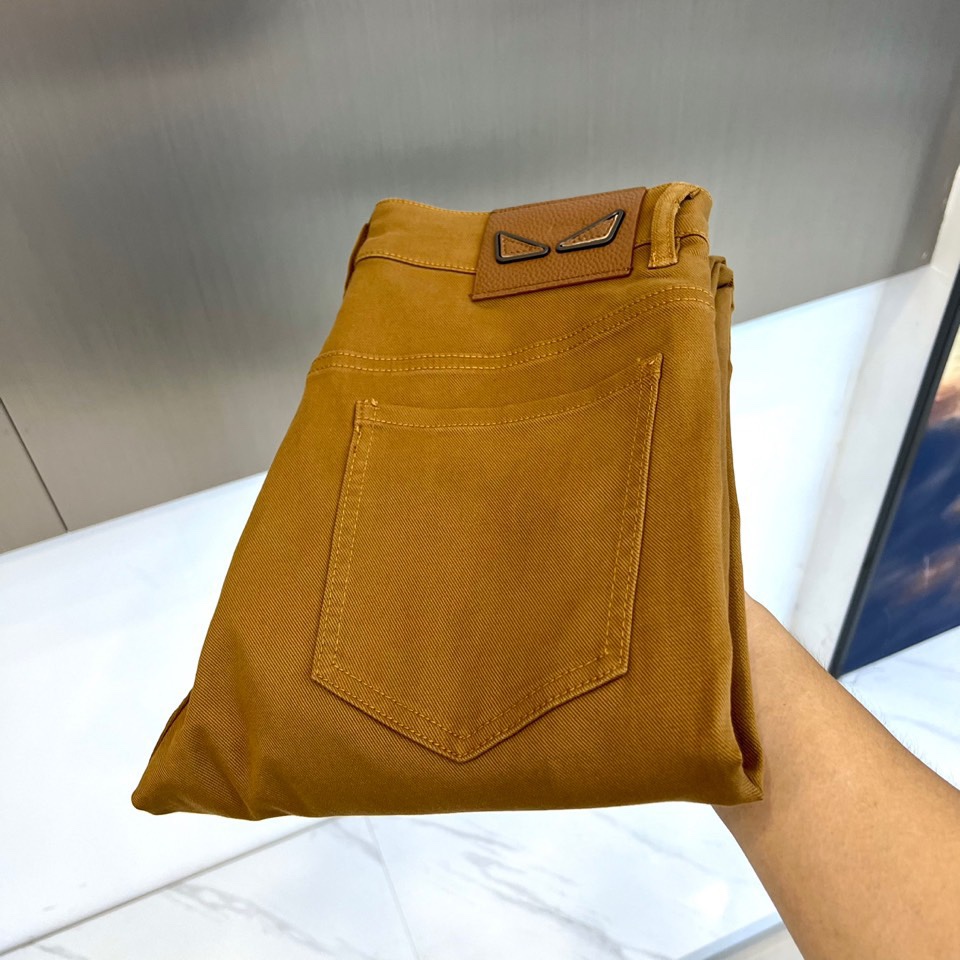 Fendi 2025 AW dark brown jeans. High-quality denim, signature brown leather patch with metal Monster eye rivets. Italian craftsmanship, clean silhouette. Versatile for coats, knits, leather jackets. Retro-modern urban style. Sizes 29-38 (no 37).