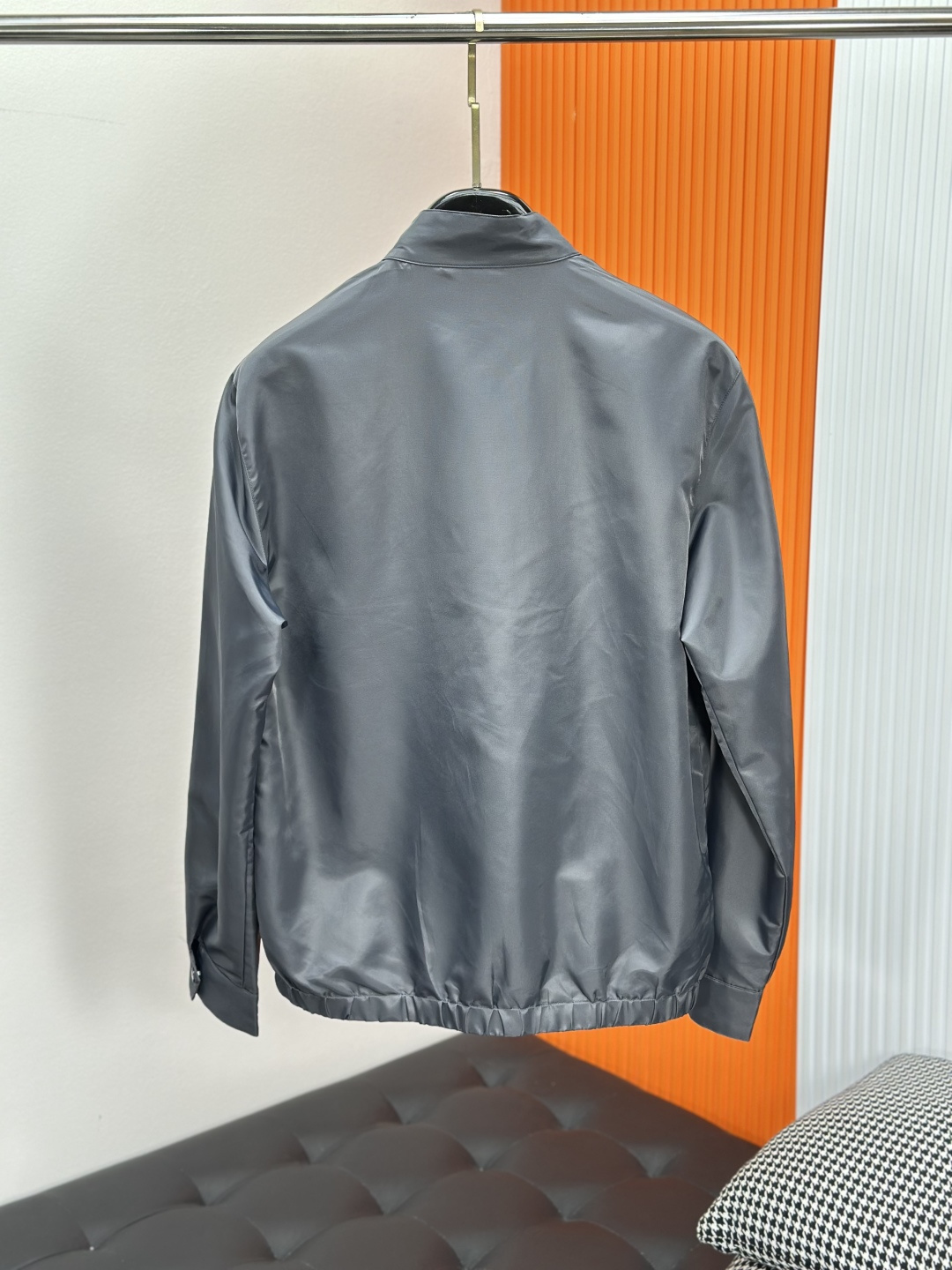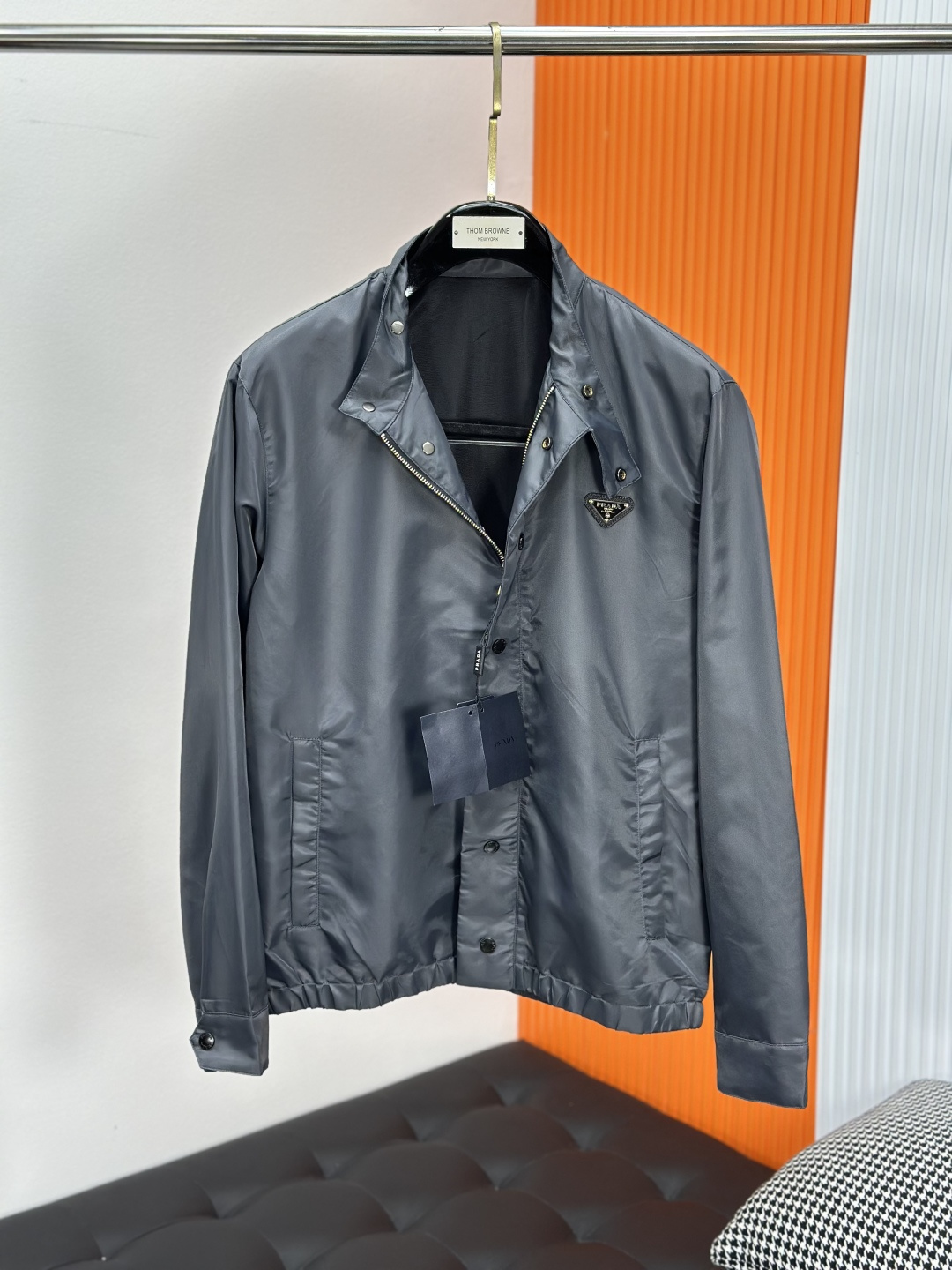 Prada jacket with chest triangle logo. Soft, breathable fabric. Stylish chest pocket adds dimension. Tailored fit for daily wear. Versatile with jeans or casual pants. Quality stitching and buttons. Available in sizes 48-56.
