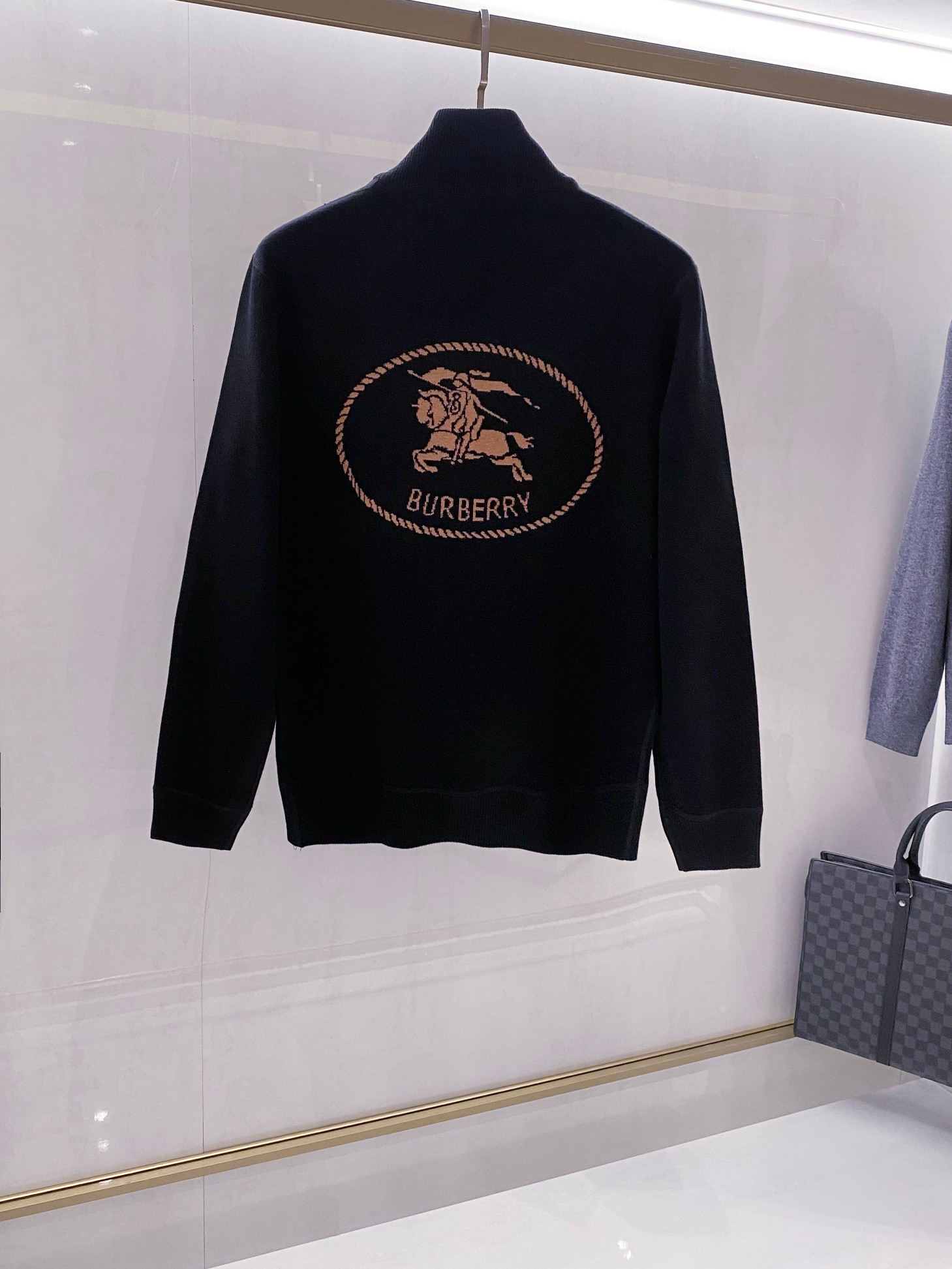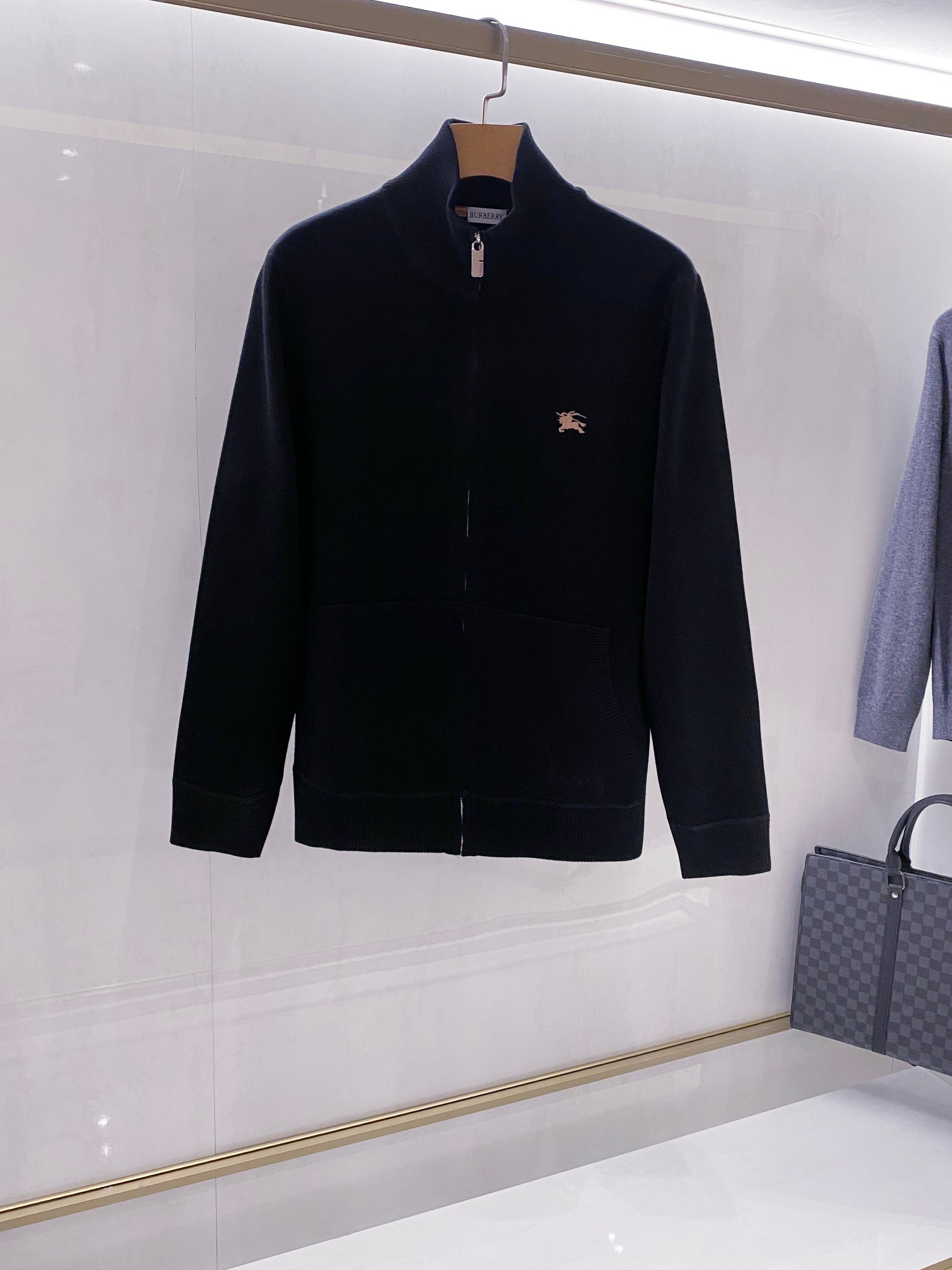 Burberry men's wool stand collar coat. Classic British design with gold embroidery, knight logo. 70% wool blend, black/dark blue. Metal zipper, reinforced collar. Sizes M-3XL.