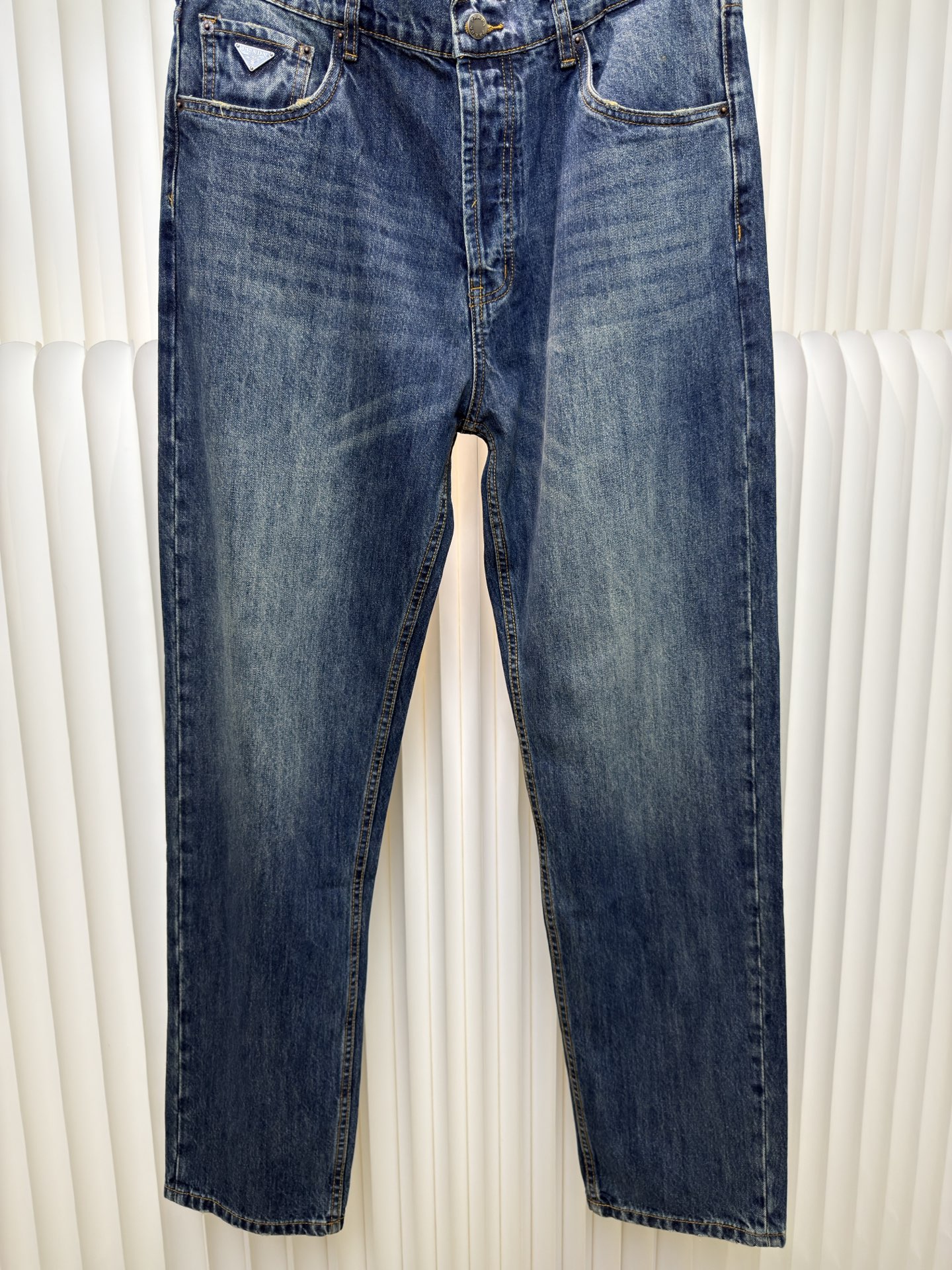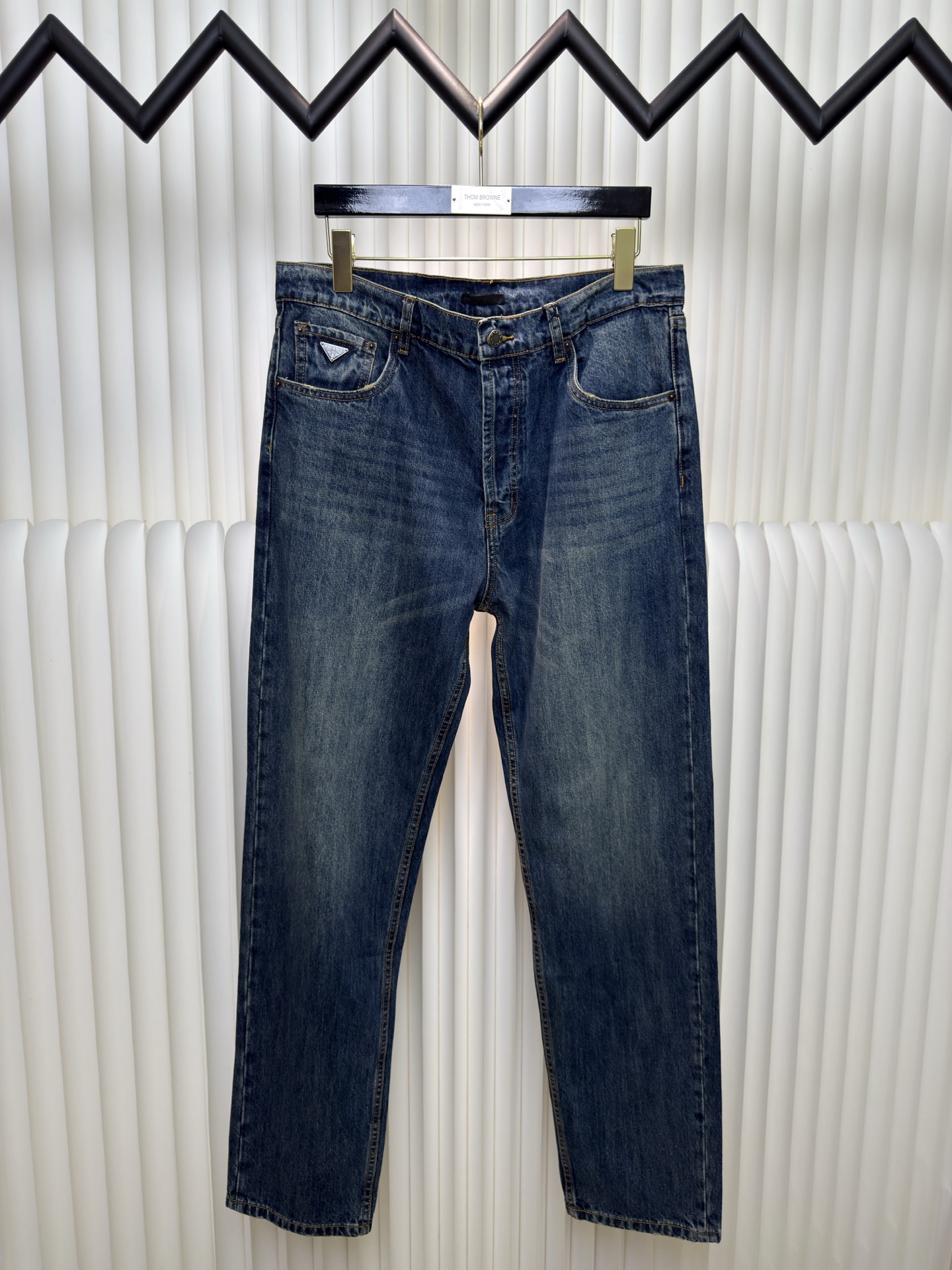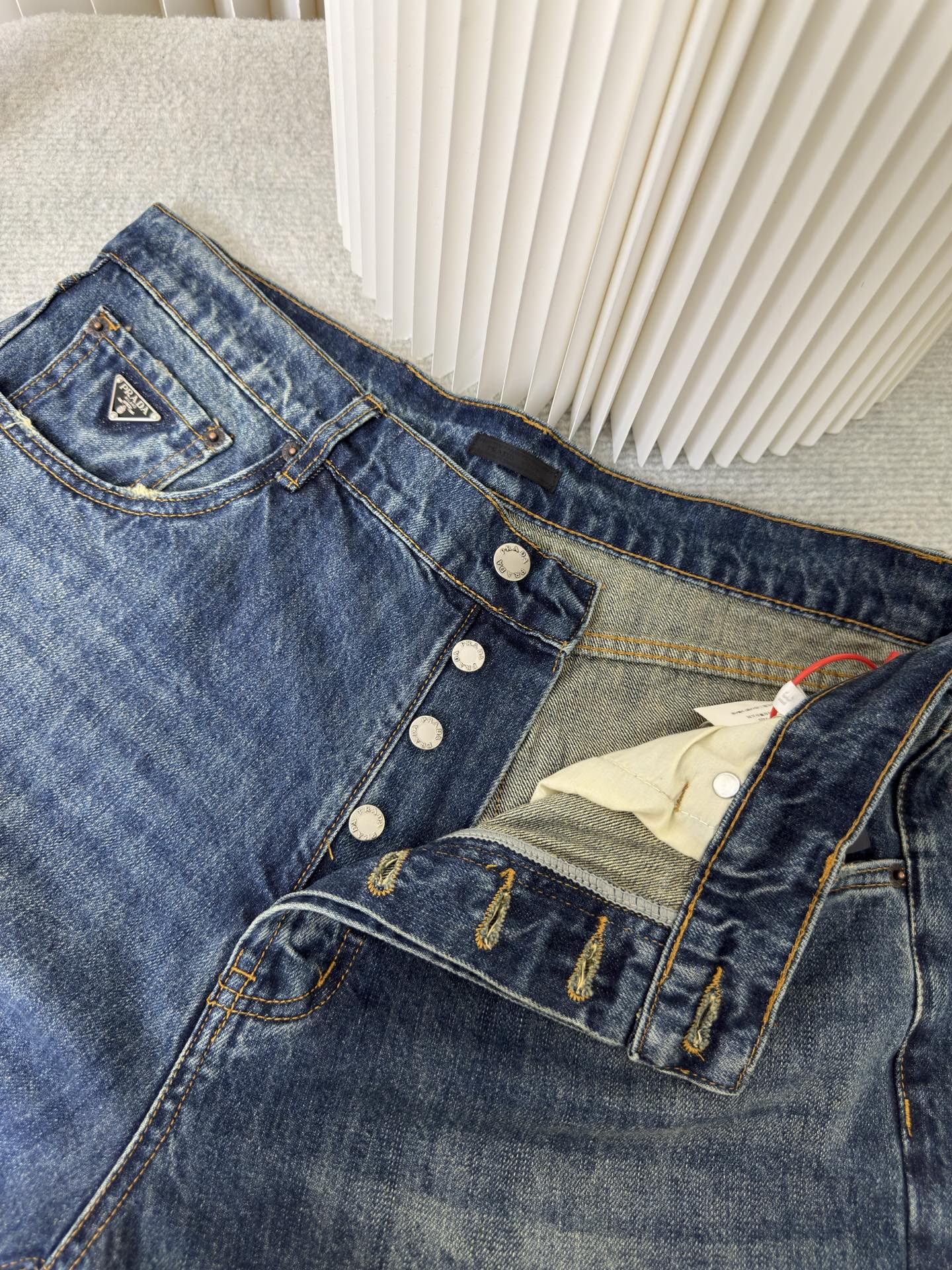 Prada triangle logo jeans. Custom blue denim, soft texture. Embroidered triangle logo, elegant design. Distressed details, vintage wash. Loose fit. Sizes 30-33.