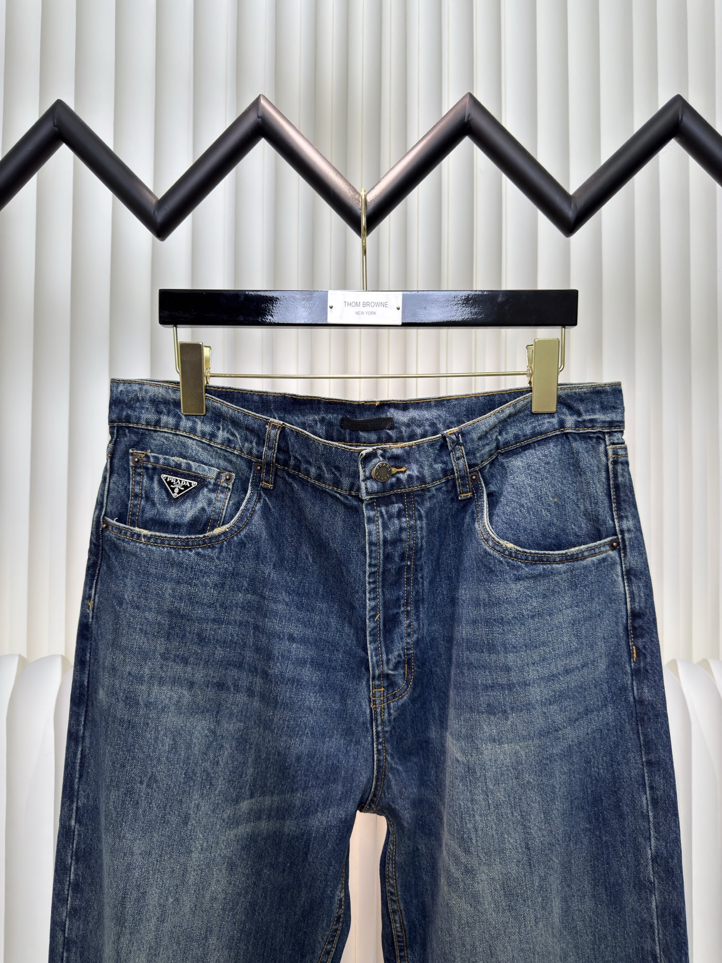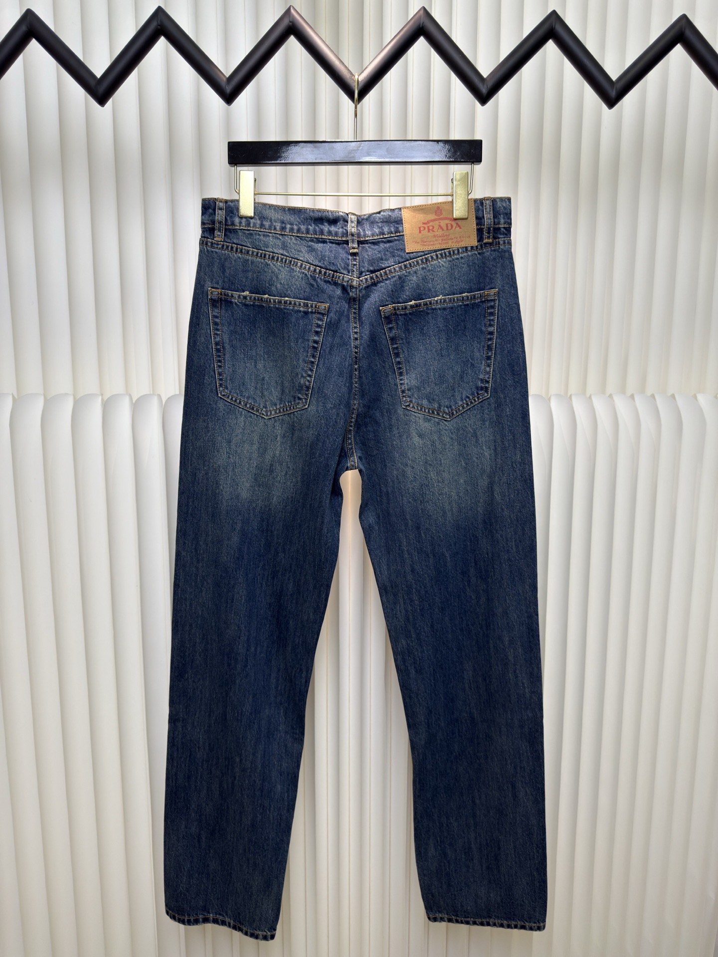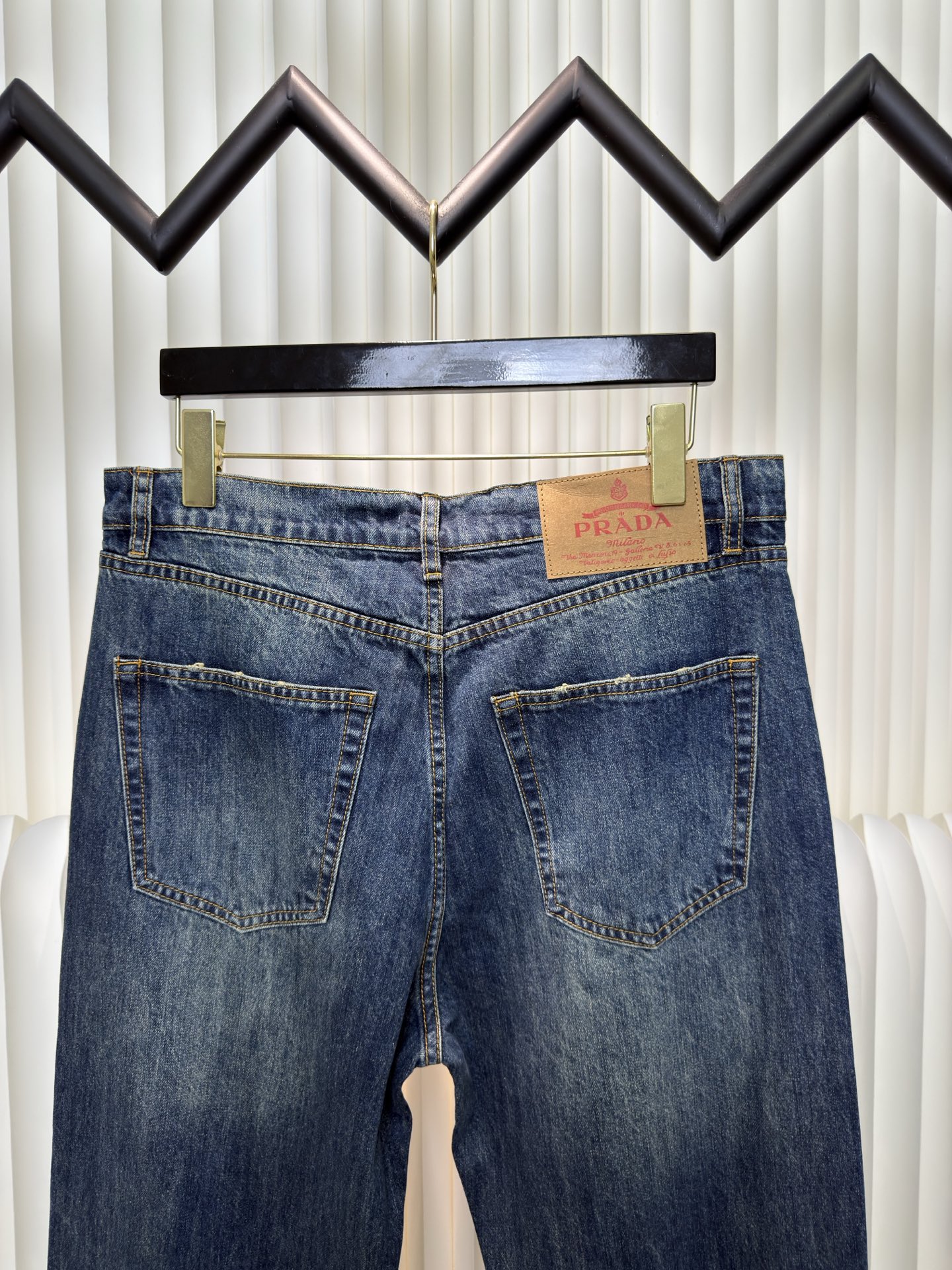 Prada triangle logo jeans. Custom blue denim, soft texture. Embroidered triangle logo, elegant design. Distressed details, vintage wash. Loose fit. Sizes 30-33.