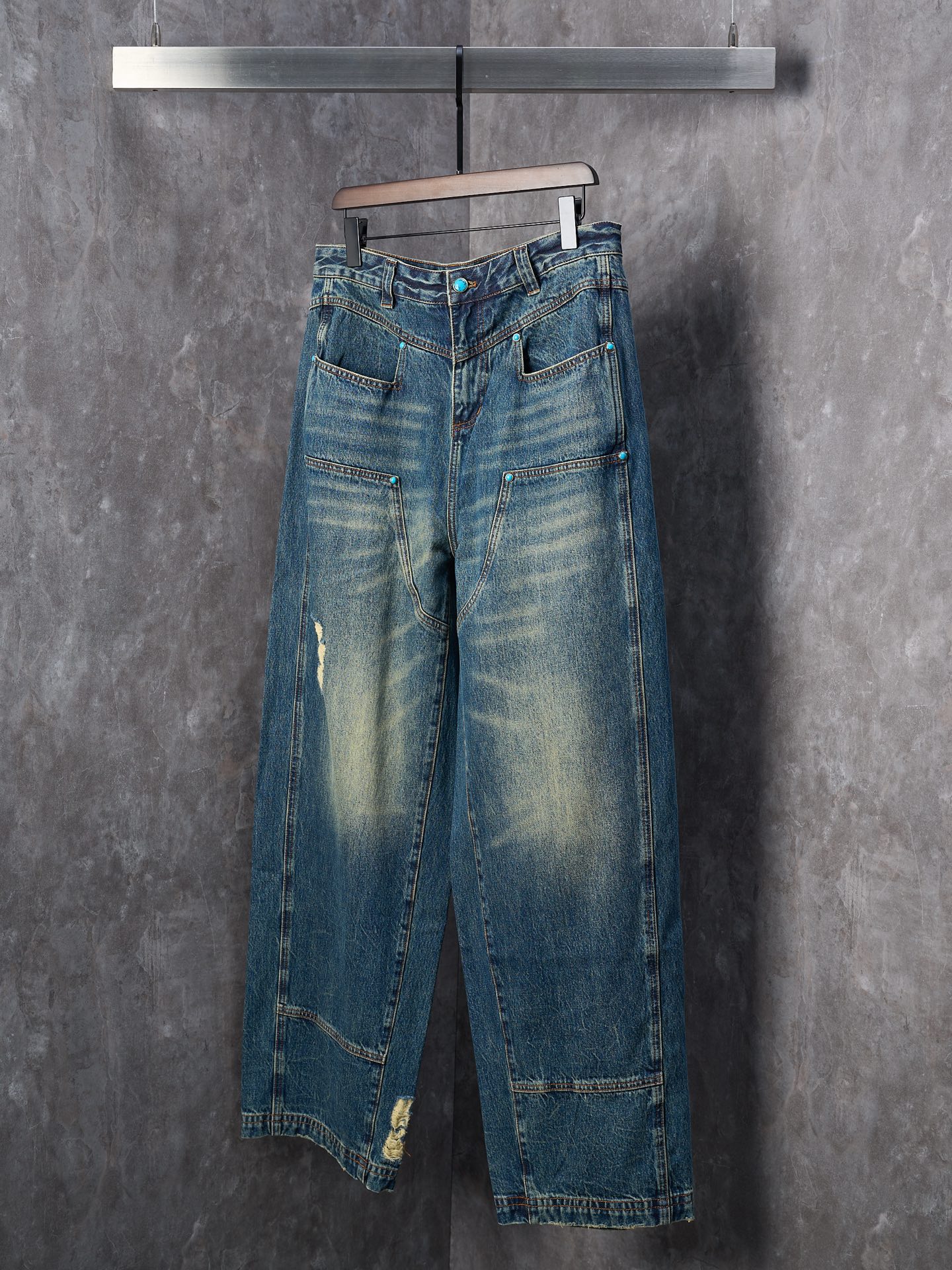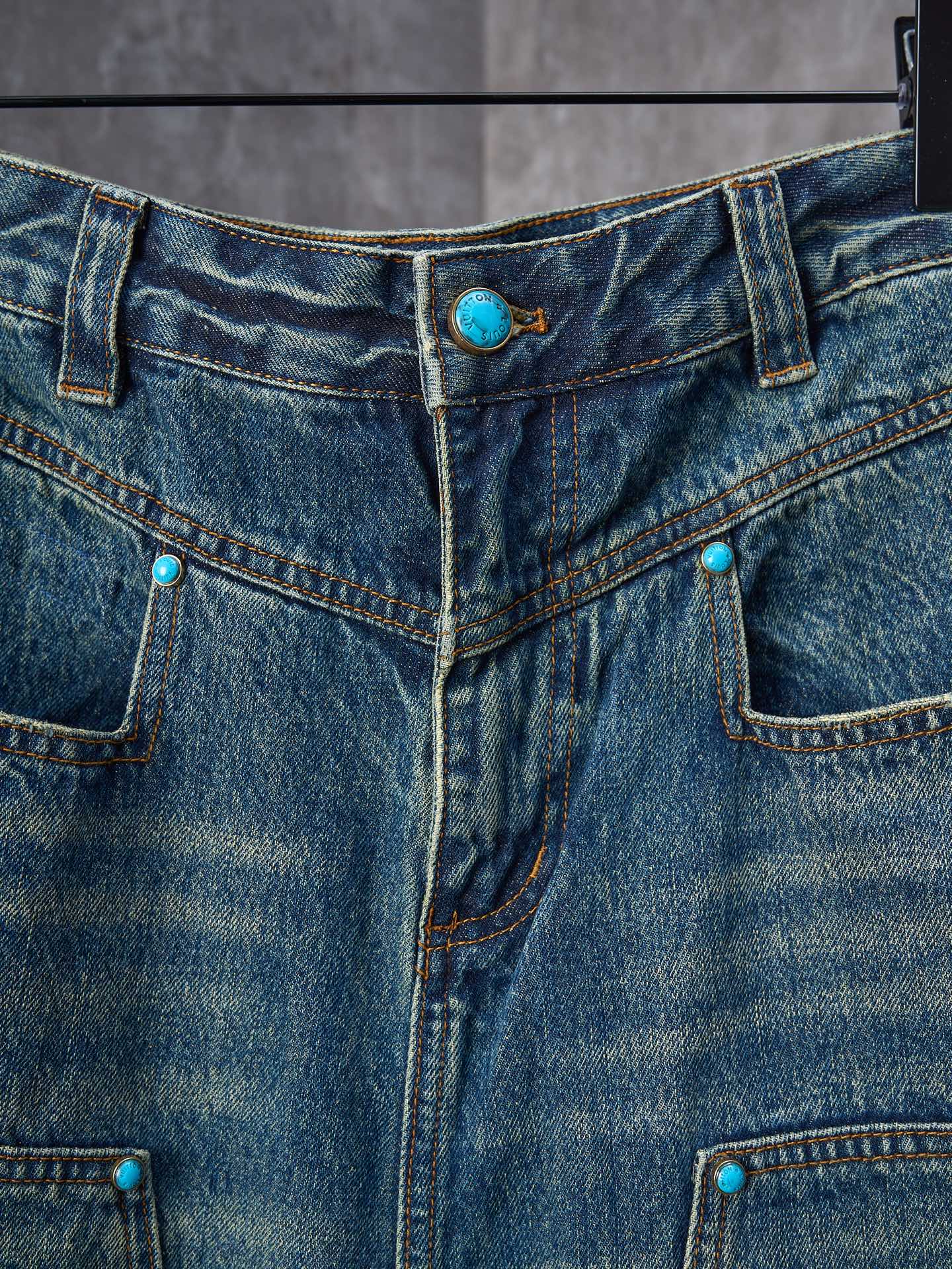 LV Turquoise Washed Distressed Cargo Jeans. Western-style yoke, gradient effect, LV Saddle leather patch. Complex craftsmanship: sandblasting, stone washing, manual distressing. Loose fit.