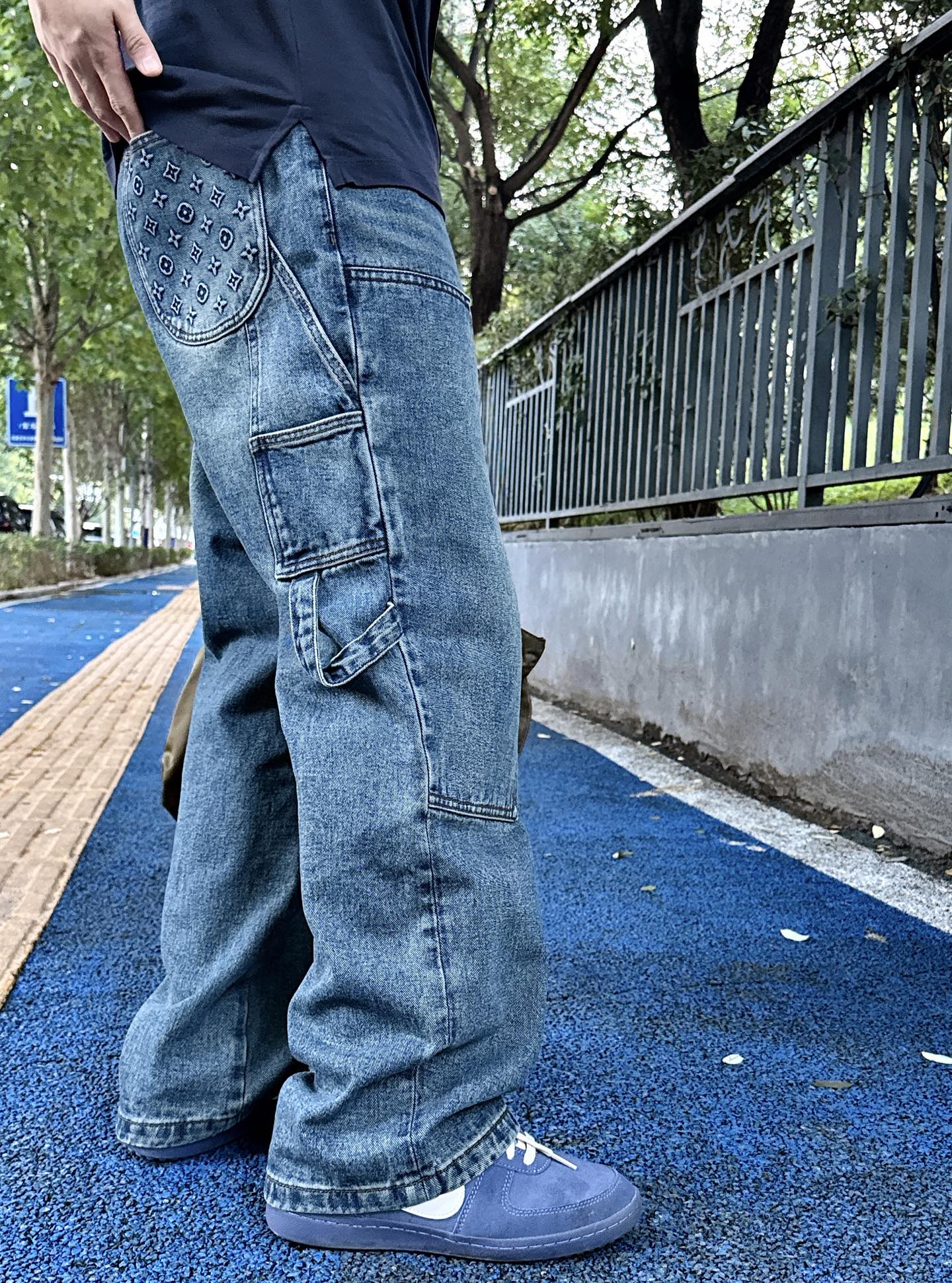 Vuit*on Monogram straight leg loose fit denim jeans. Classic yet innovative design. Soft Okayama stone-washed twill cotton, colorfast. Selvedge trim, turquoise rivets. Monogram embossed curved pockets. Color: Washed blue. Sizes: XS-L.