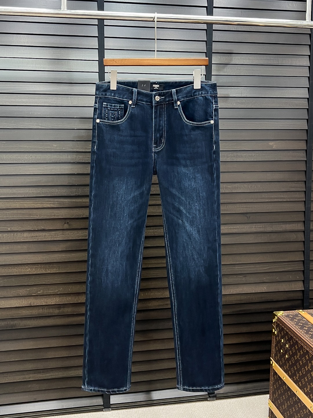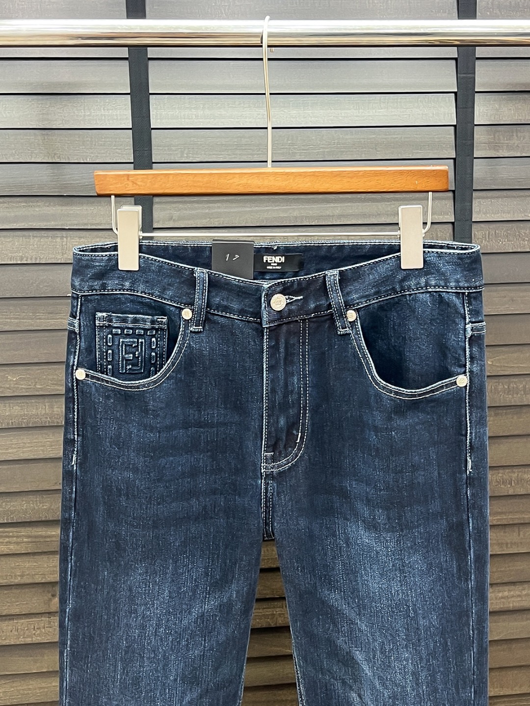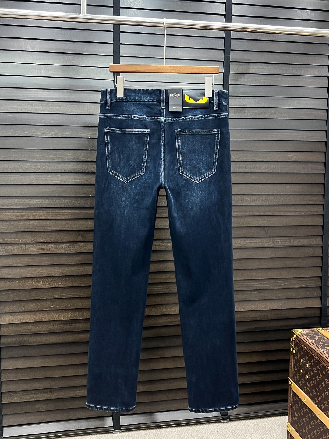 Fendi men's denim jeans. Minimalist design, Japanese 13oz fabric, eco wash. Vintage look, stretchy, comfortable. Classic blue, sizes 29-38. Versatile style.