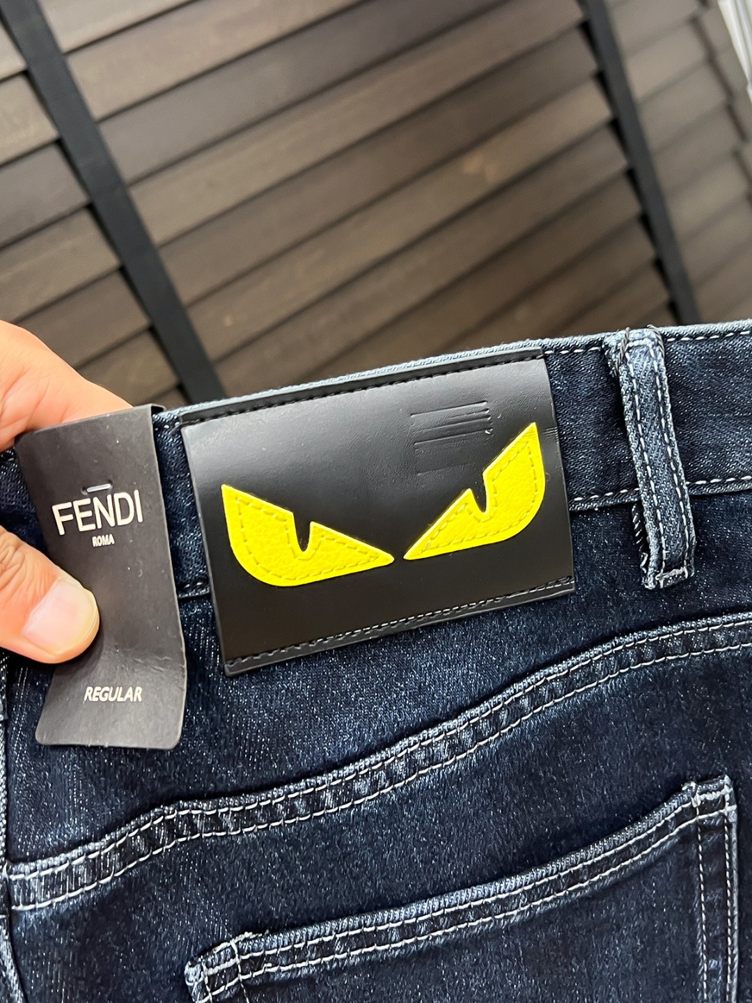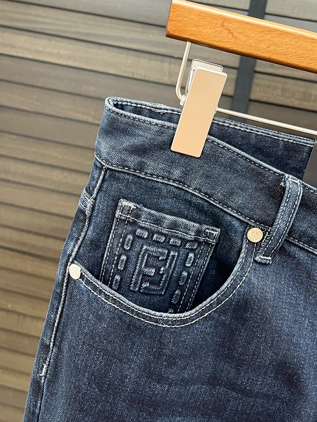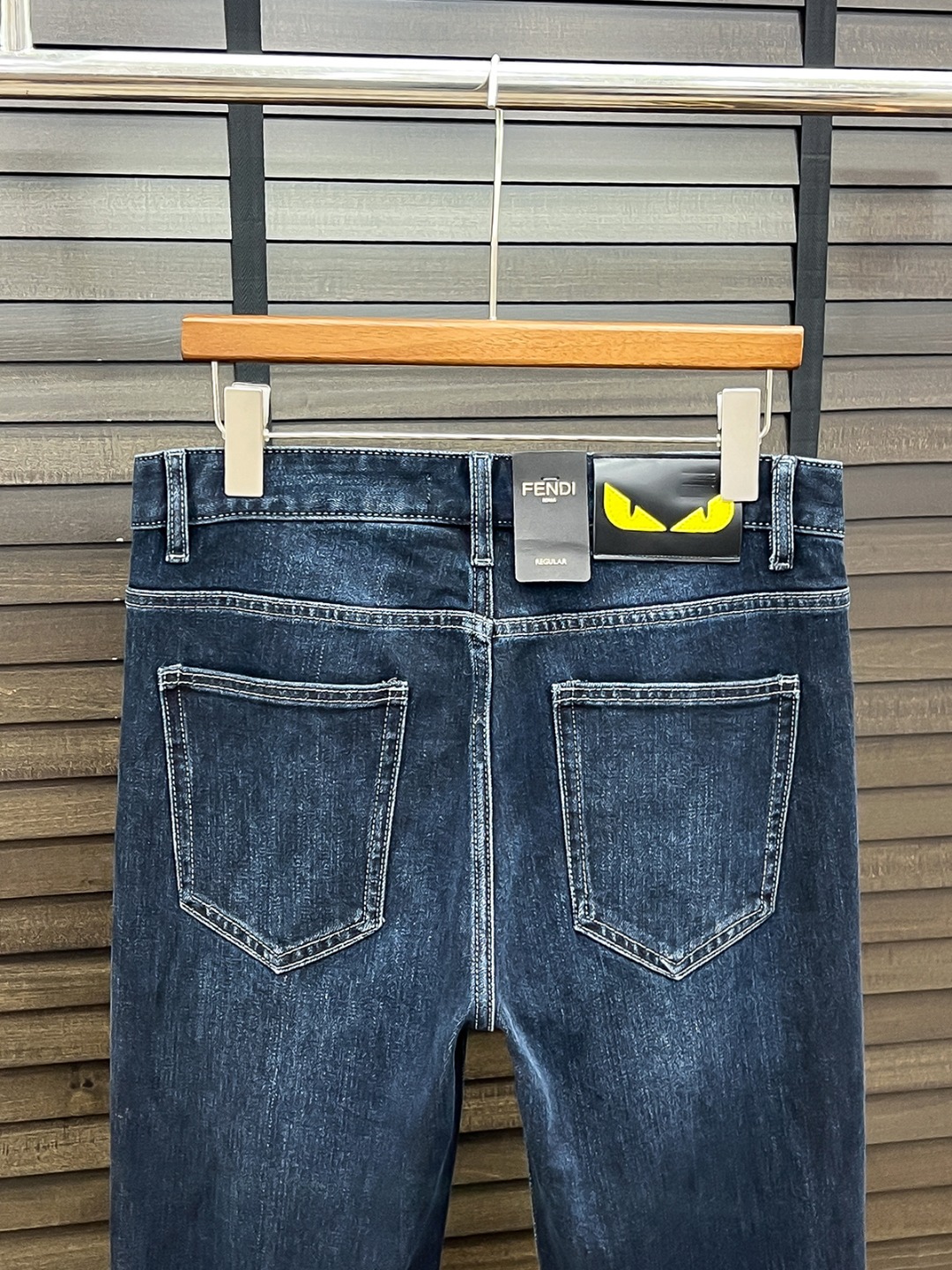 Fendi men's denim jeans. Minimalist design, Japanese 13oz fabric, eco wash. Vintage look, stretchy, comfortable. Classic blue, sizes 29-38. Versatile style.