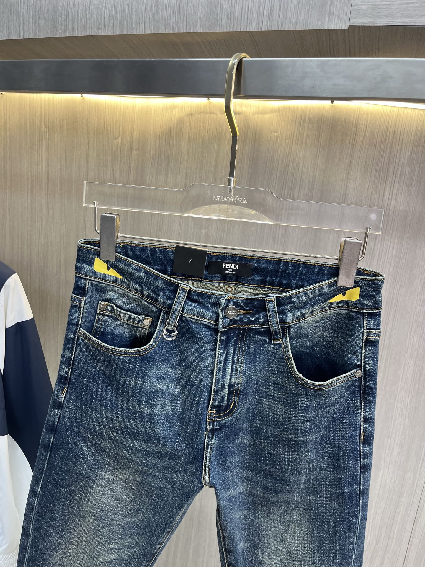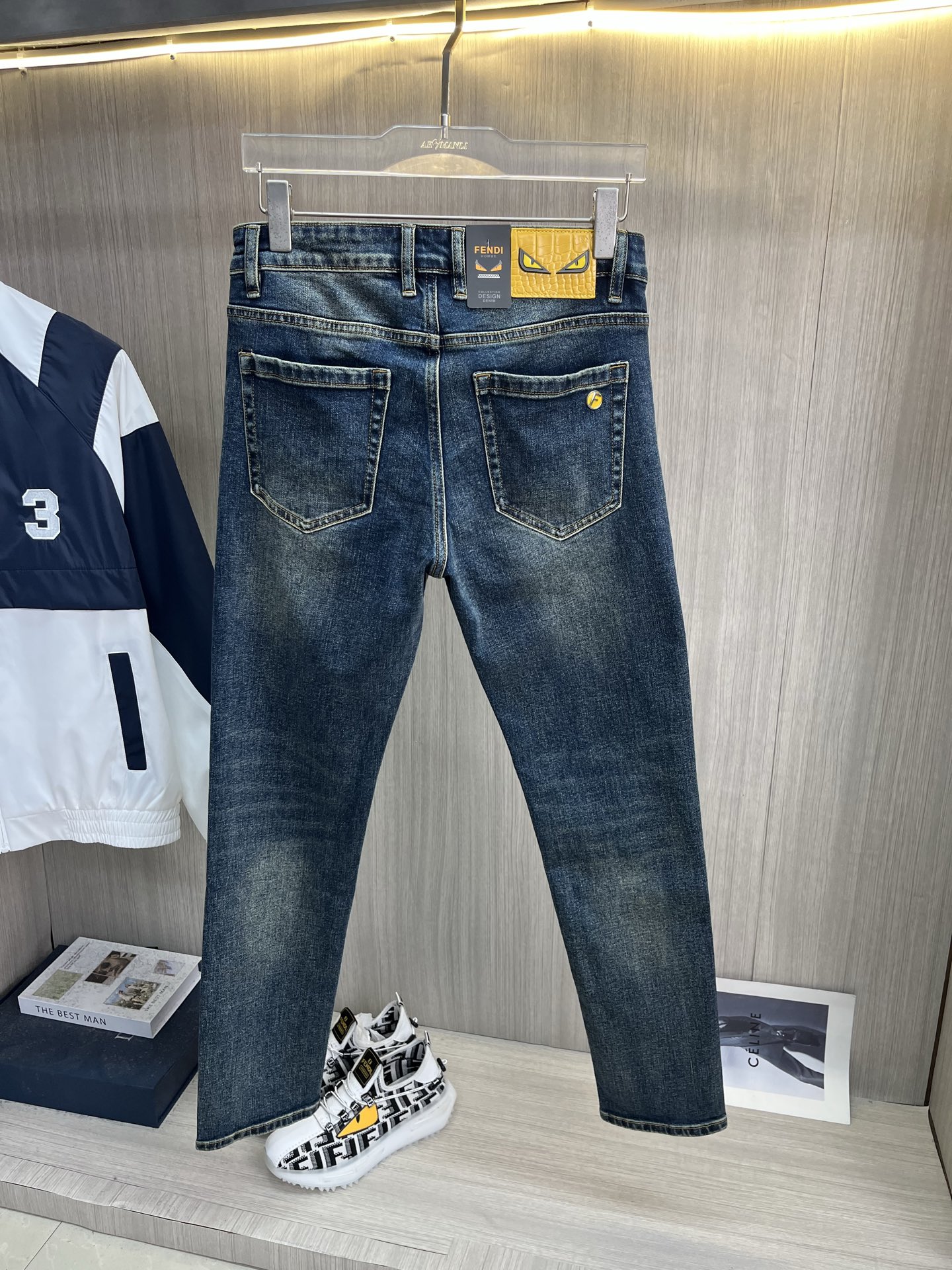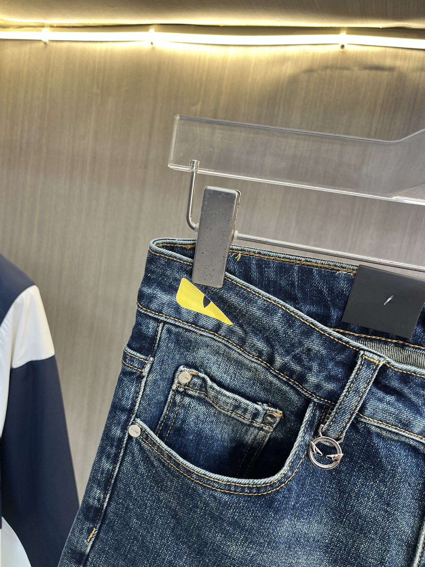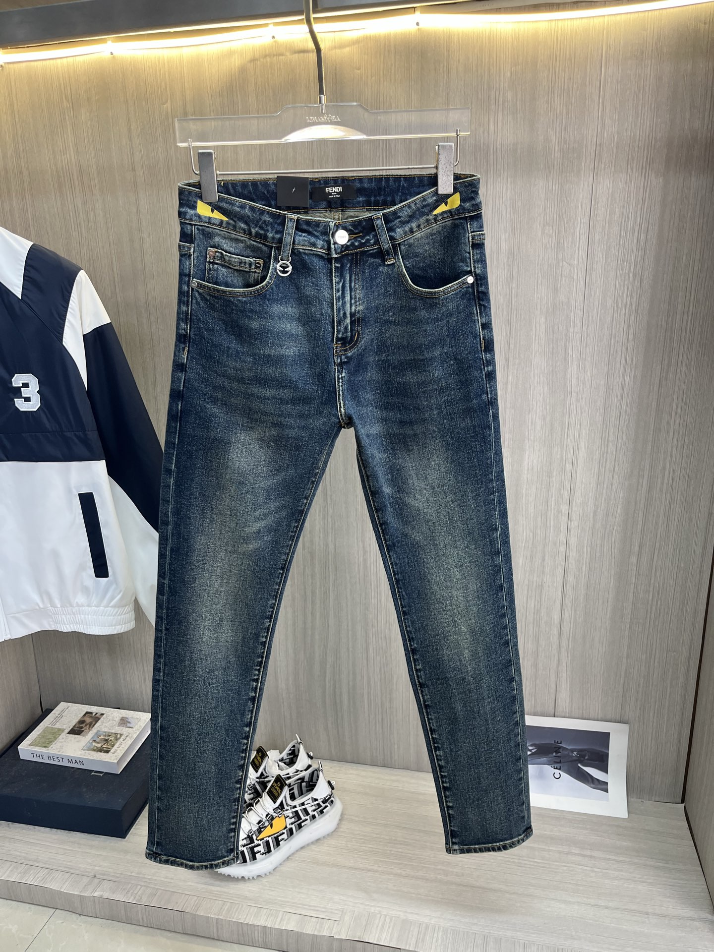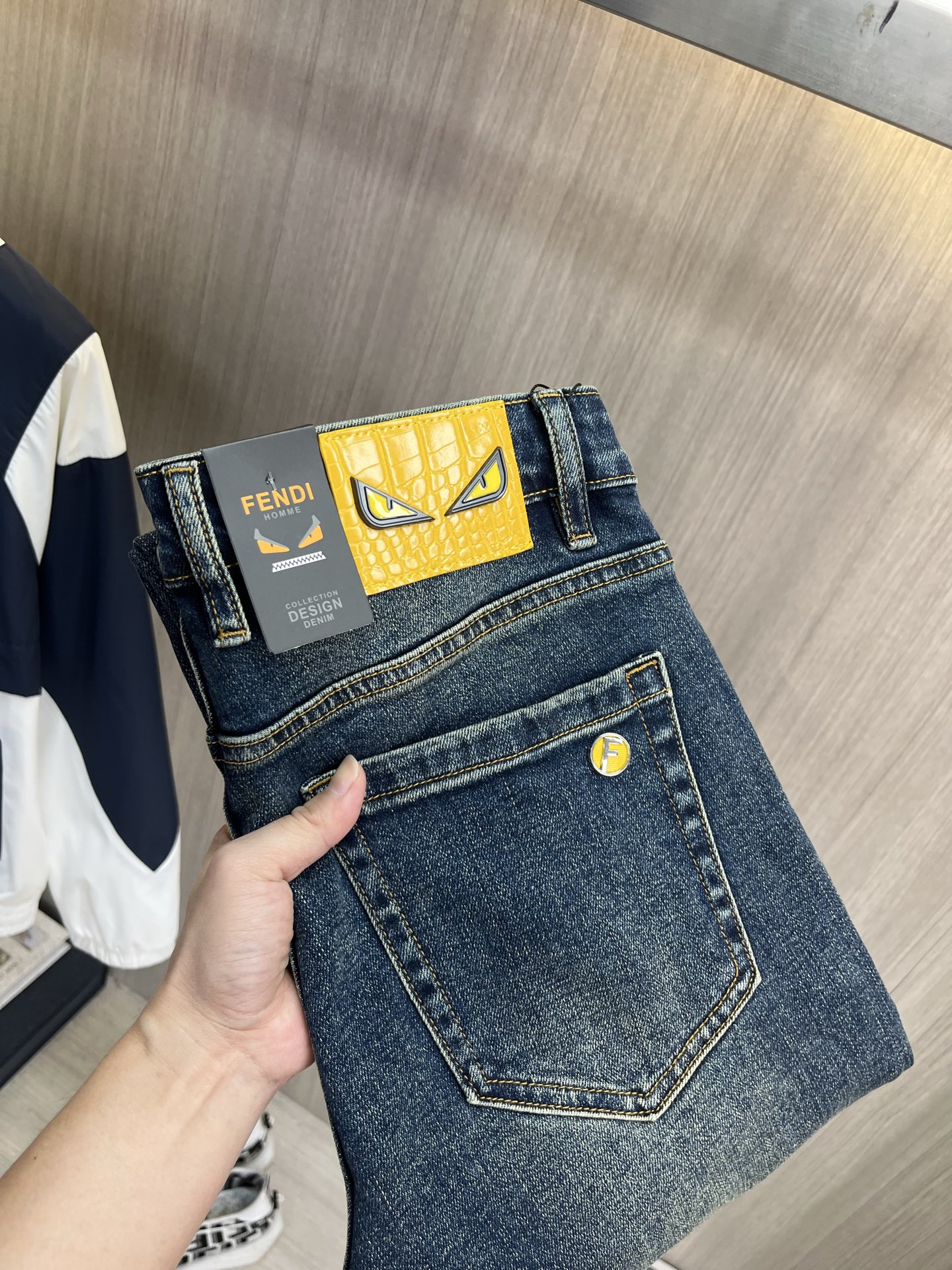 FENDI 2025 men's jeans. Comfortable stretch denim, elegant design with custom hardware and leather label. Sizes 28-38. Next-day shipping.