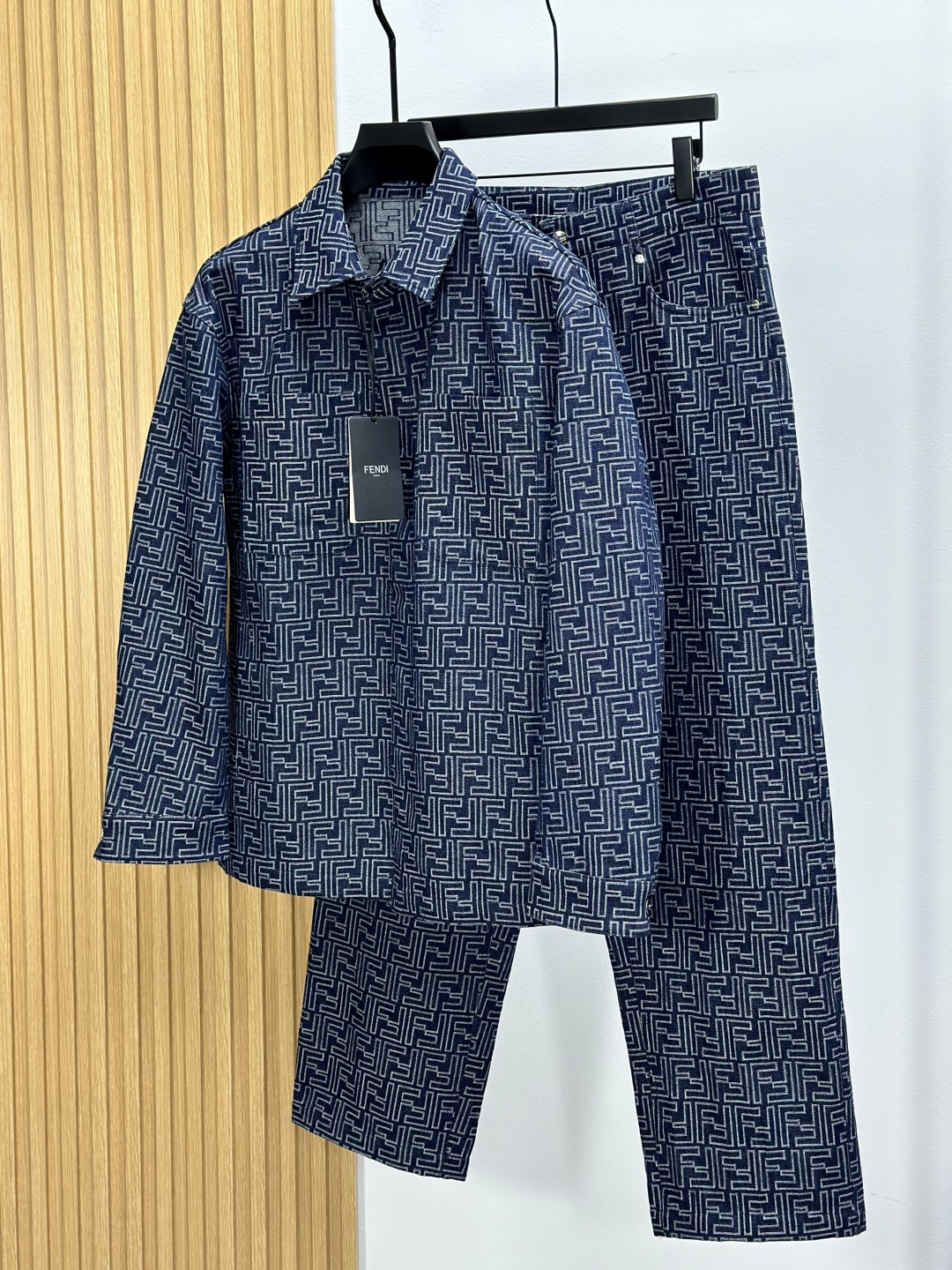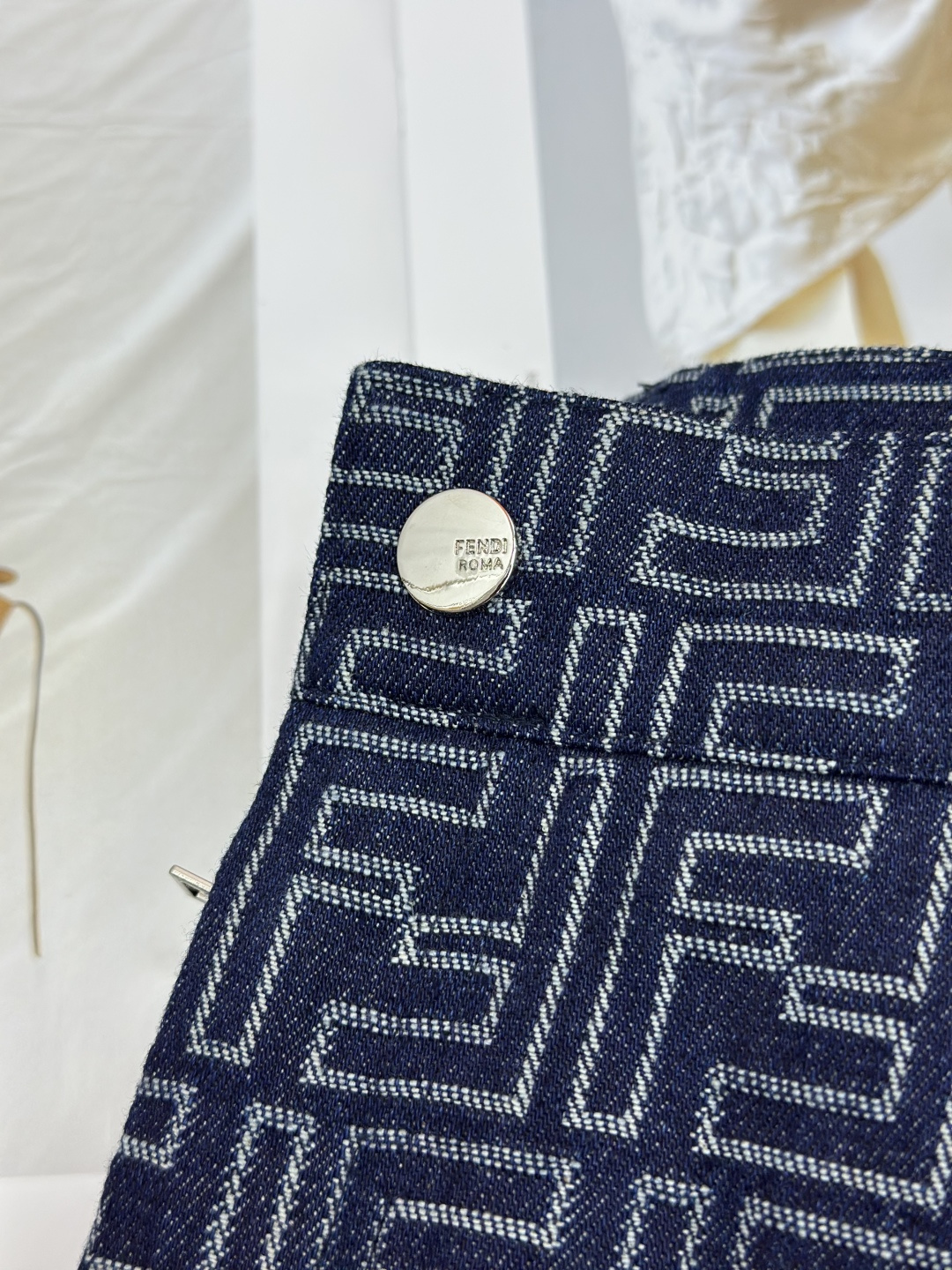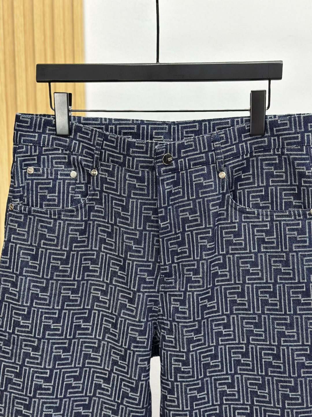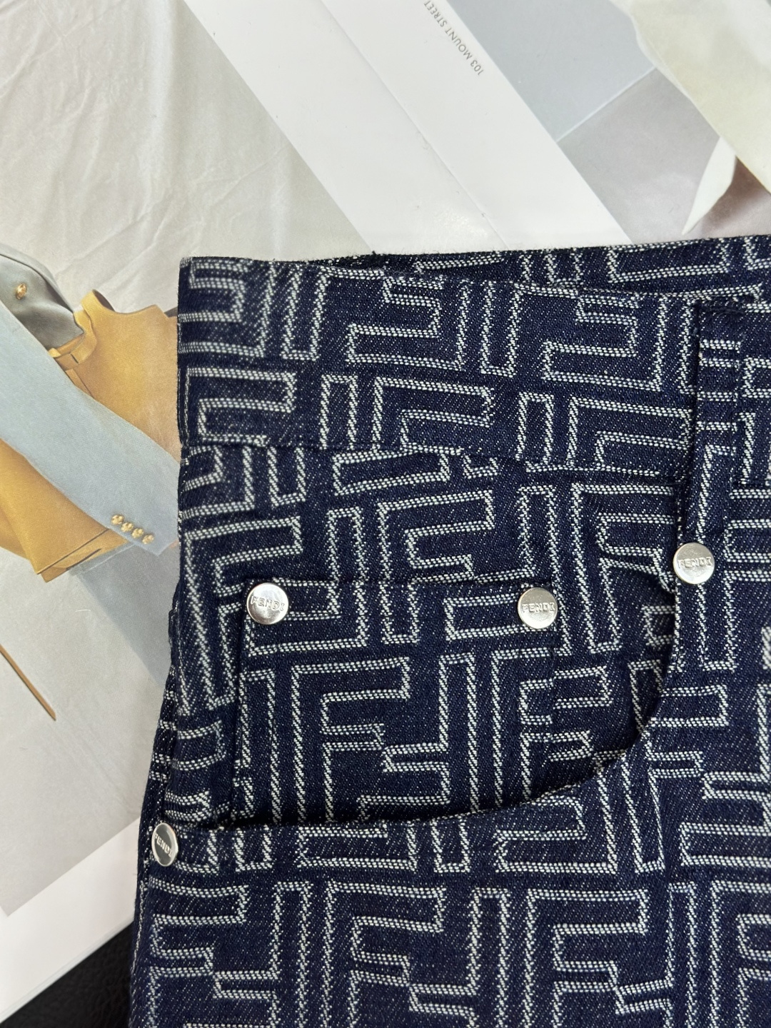Fendi 25SS lightning canvas jeans. High-quality denim-blue fabric, retro style with modern breathability. Features edgy lightning prints, loose comfortable fit. Versatile for casual wear, expressing a free-spirited attitude.