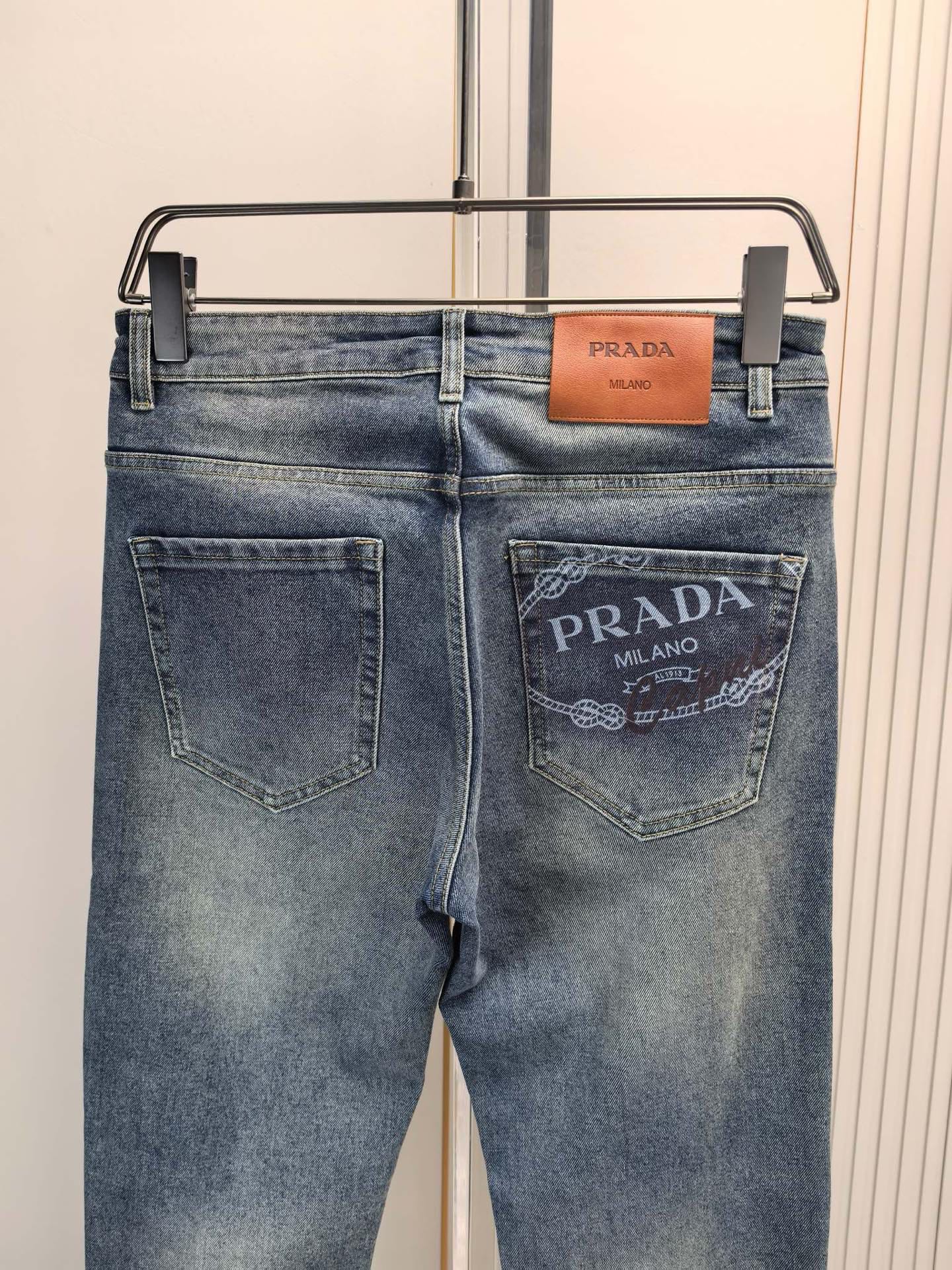 Prada 2025 early fall men's jeans. Heavy wash denim, custom fabric, soft and comfortable. Double washing process, top-notch feel and breathability. Custom hardware logo. Elastic fabric, low-key design. Sizes: 29-40.