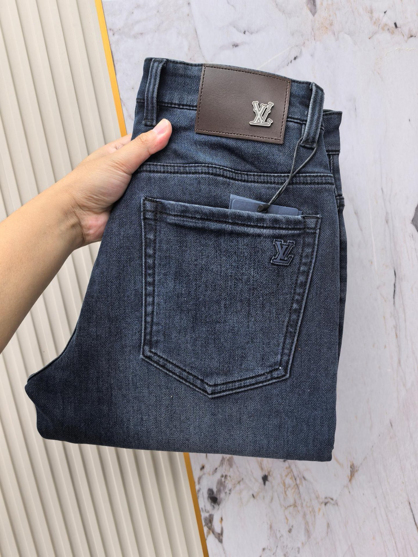 LV 2025 early fall men's jeans. Heavy wash denim, custom fabric, soft & comfortable. Double washing process, top-notch feel & breathability. Custom hardware logos. Sizes 29-40.