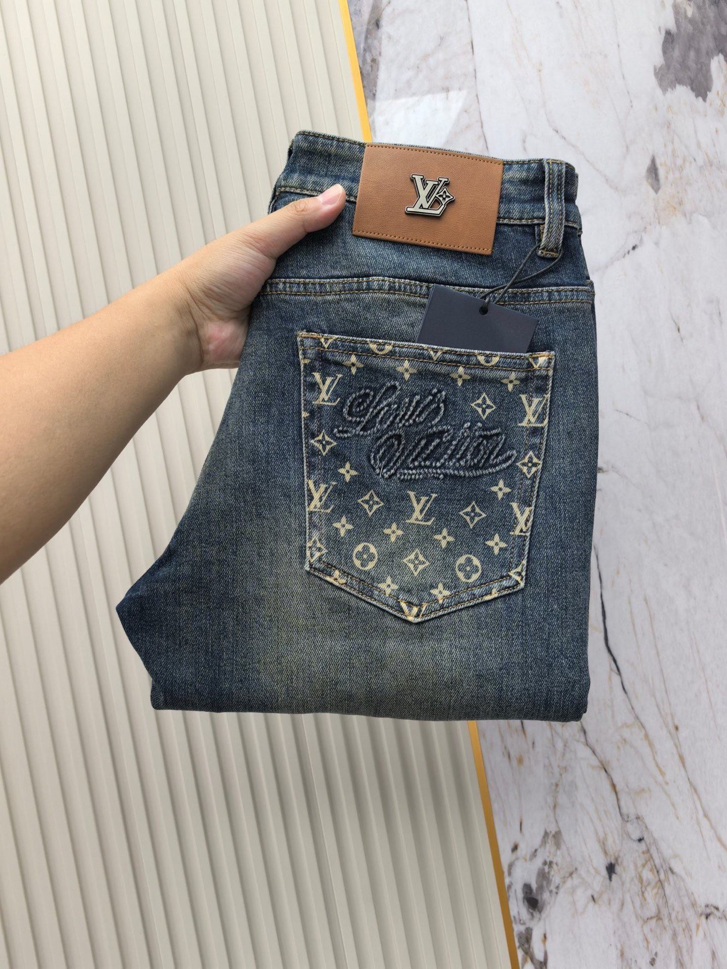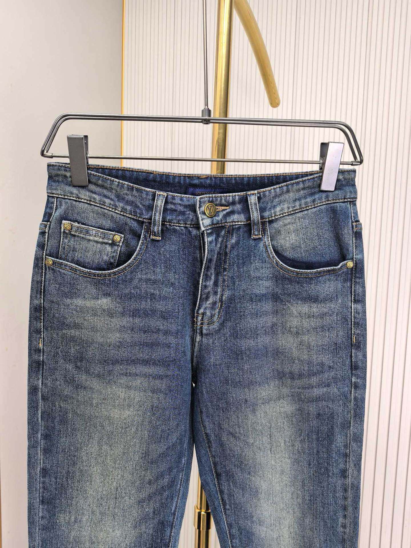 LV 2025 early fall new men's jeans. Heavy wash denim, custom fabric, softer and more comfortable. Double washing process, top-notch hand feel and breathability. Custom hardware logos, best materials. Great elasticity, comfortable. Low-key design. Sizes 29-40.