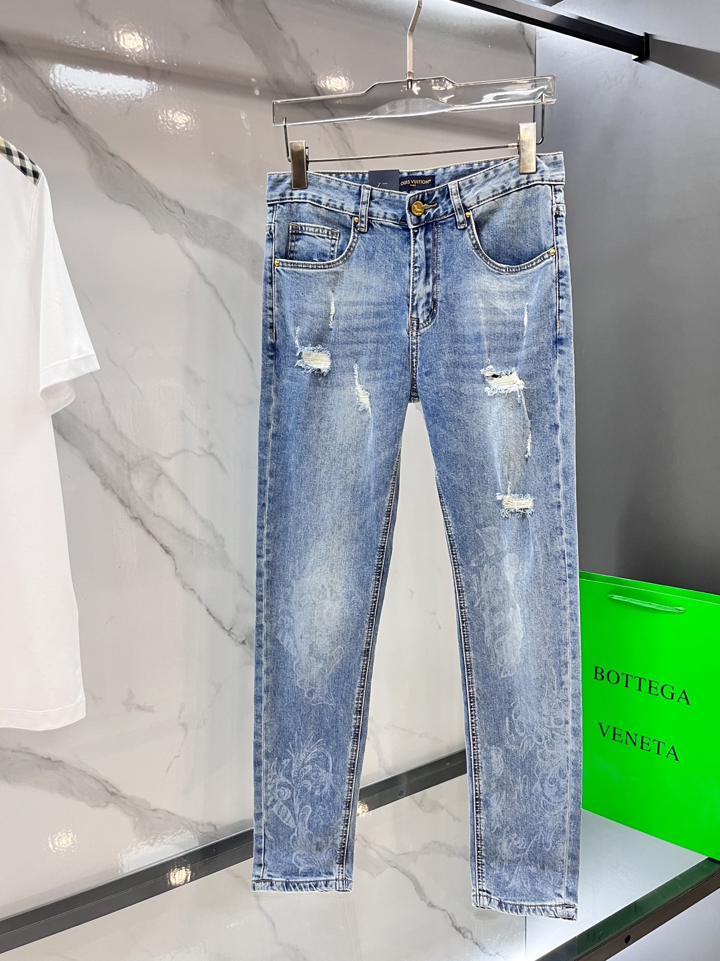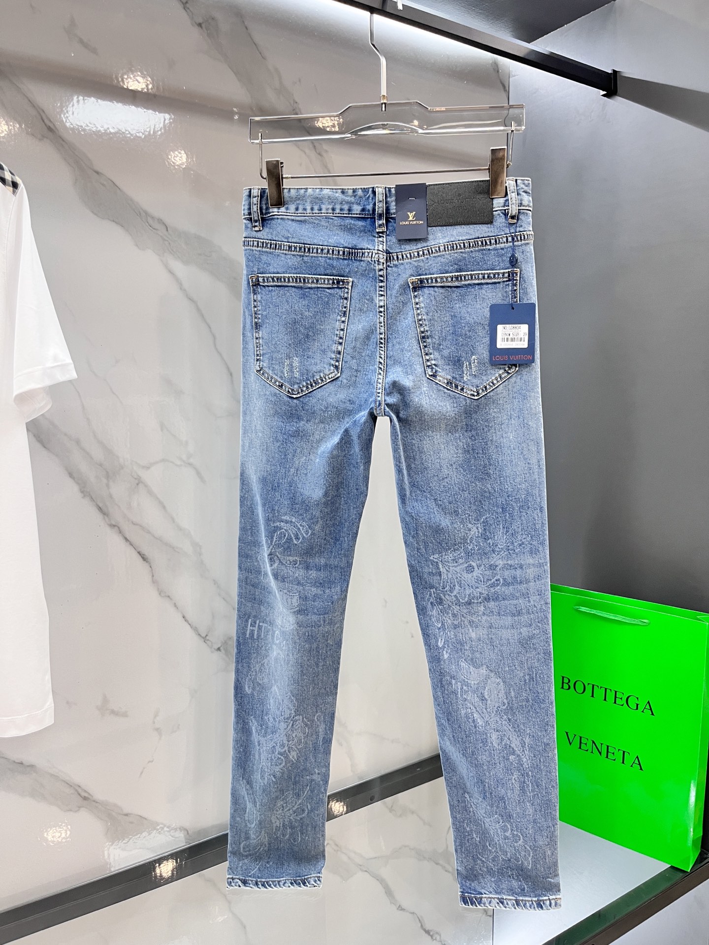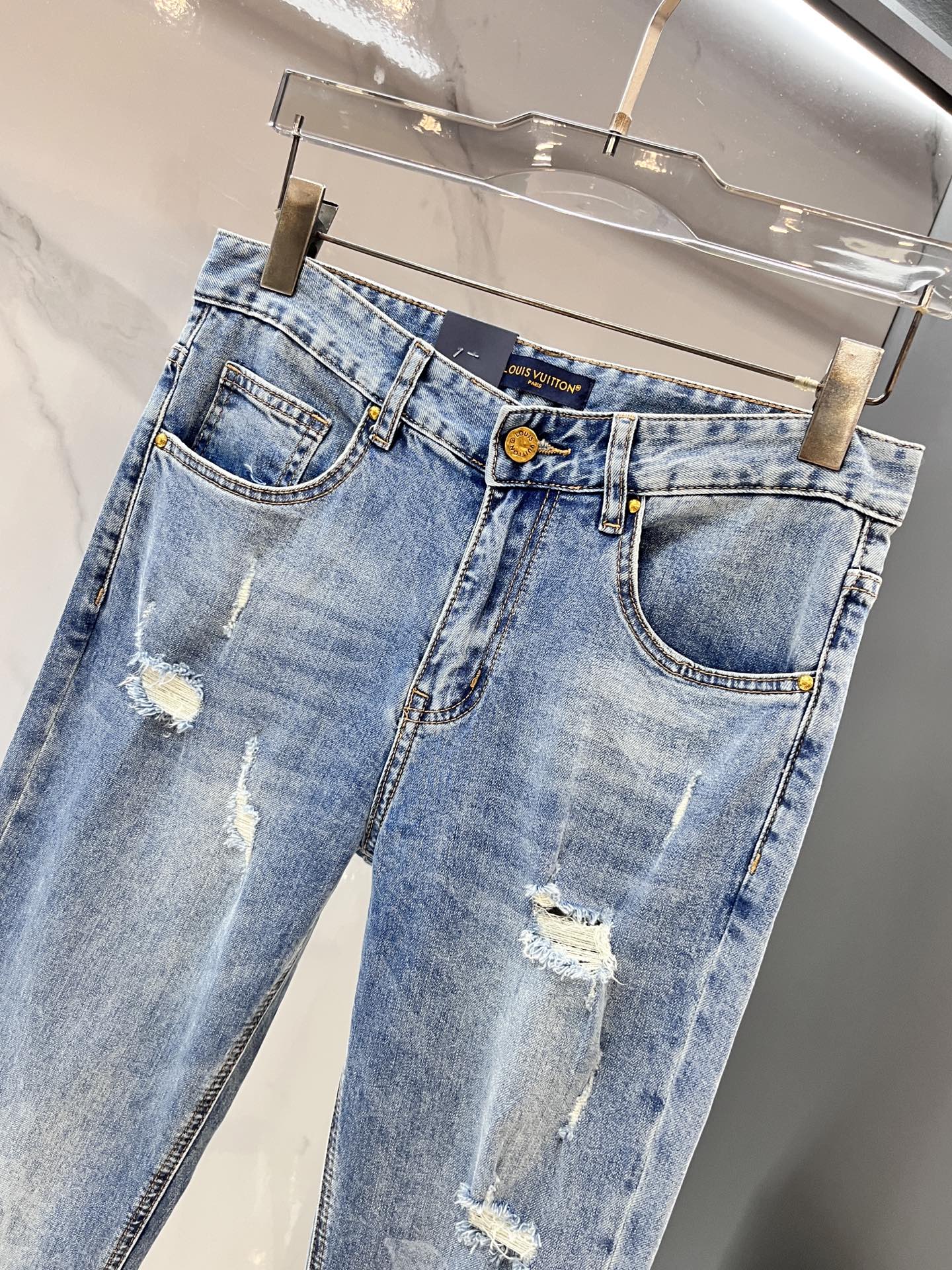 LV thin jeans. 2025 latest model. 98% cotton, 2% elastane. Sturdy yet soft fabric with slight stretch. Concealed zipper, embossed pockets. Clean cut, elegant fit. Sizes 29-36.