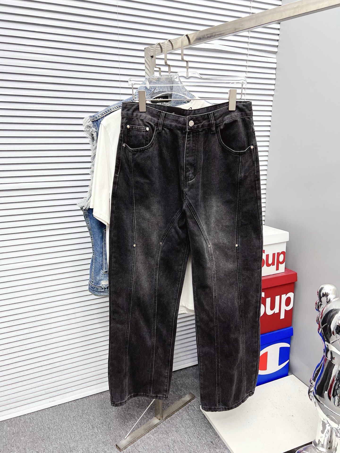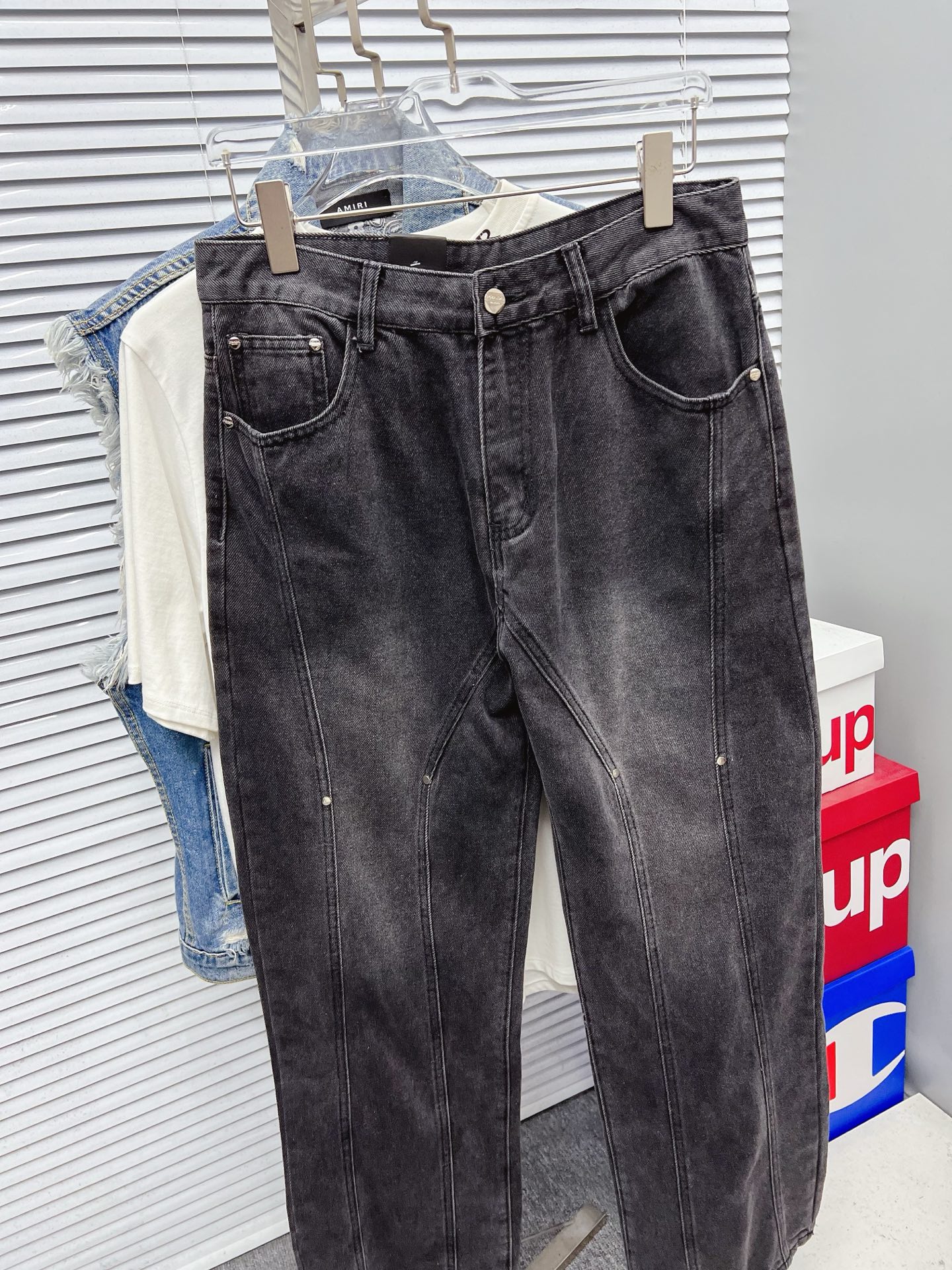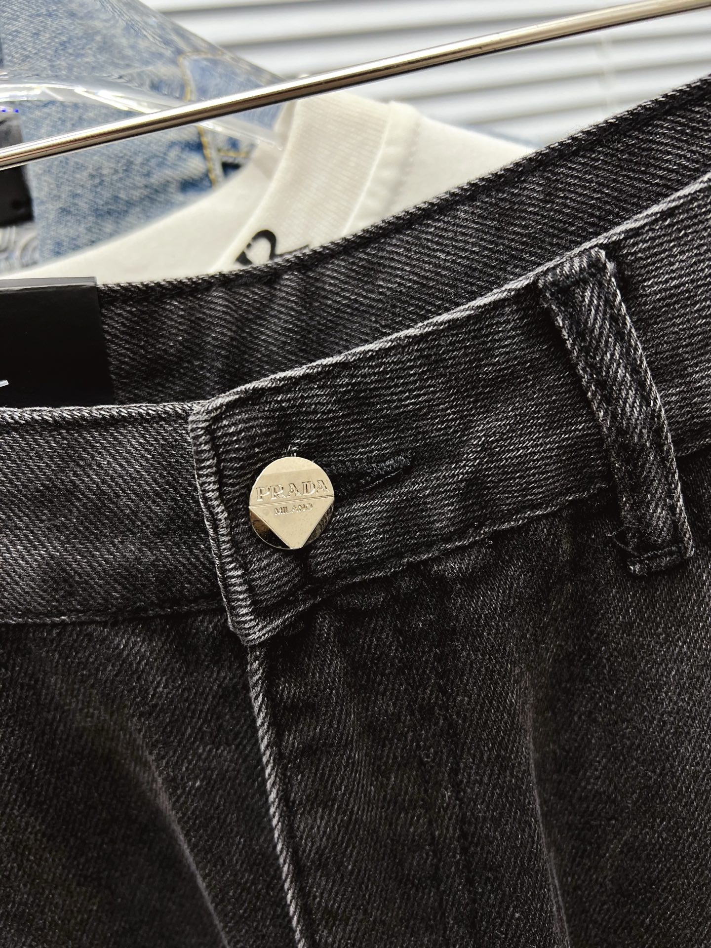 PRADA men's wide-leg jeans. Premium Japanese denim, 13oz, eco-enzyme wash for soft vintage look. Leather waist tag, quality hardware. Slim fit, versatile styling. Sizes 28-38 (excl 35,37).