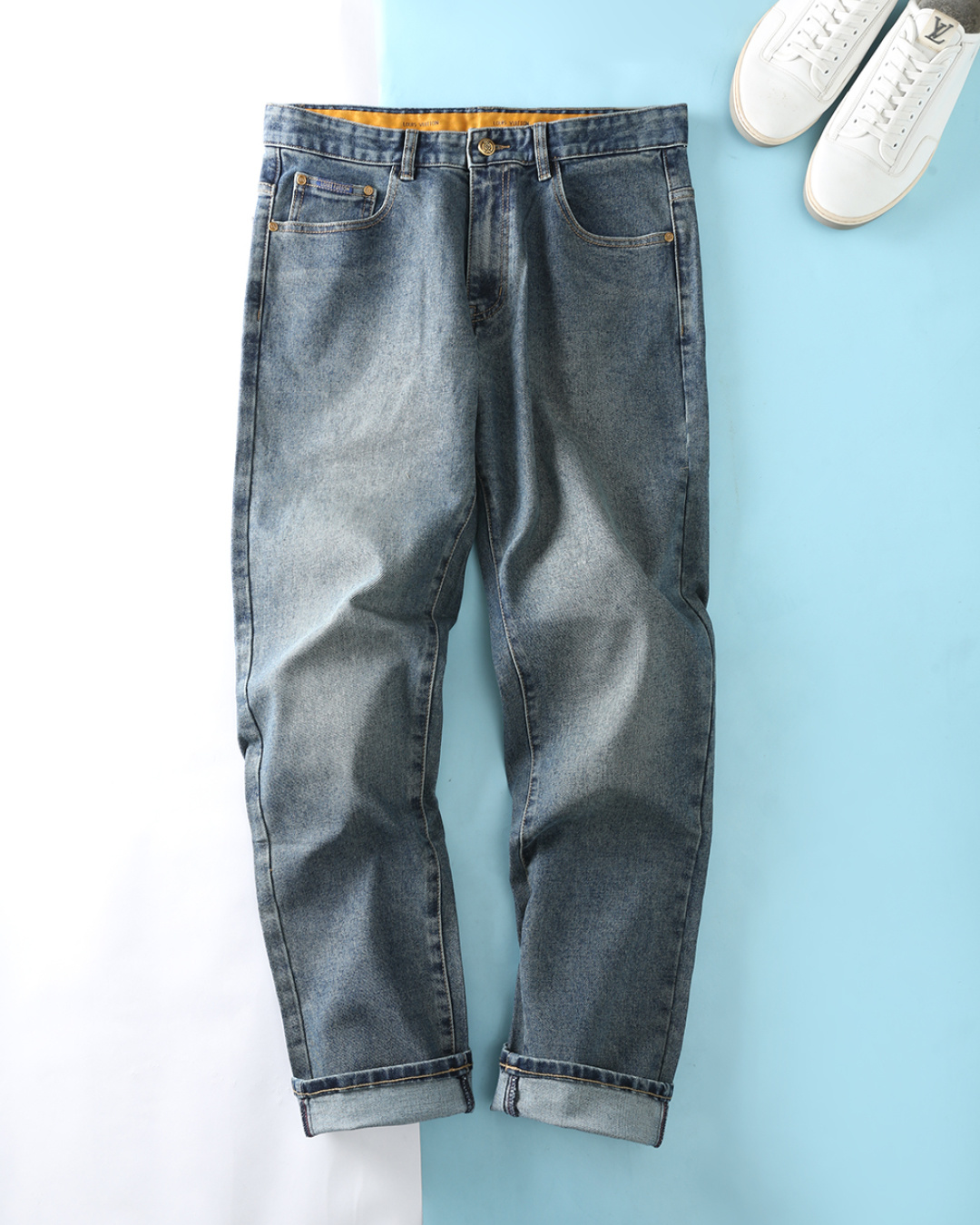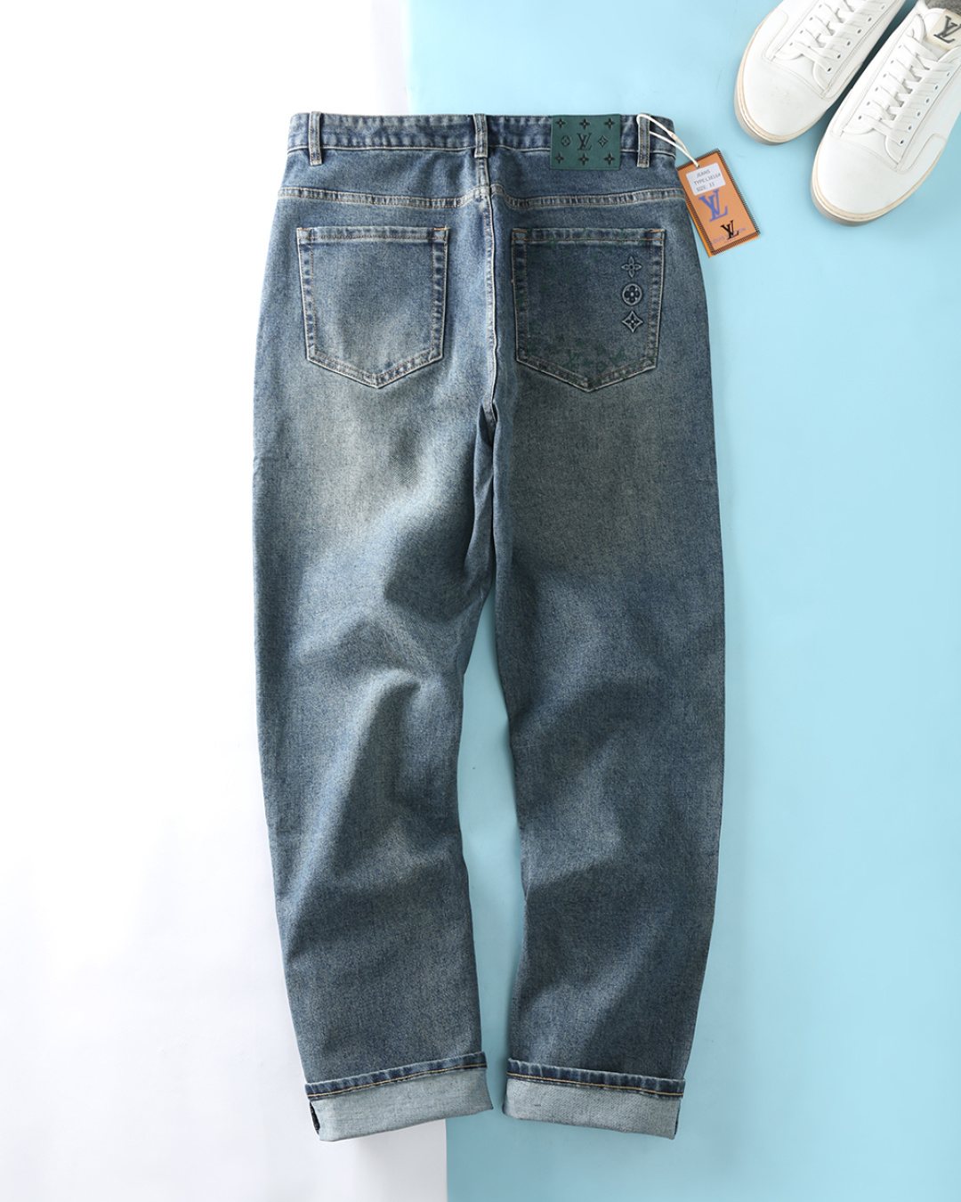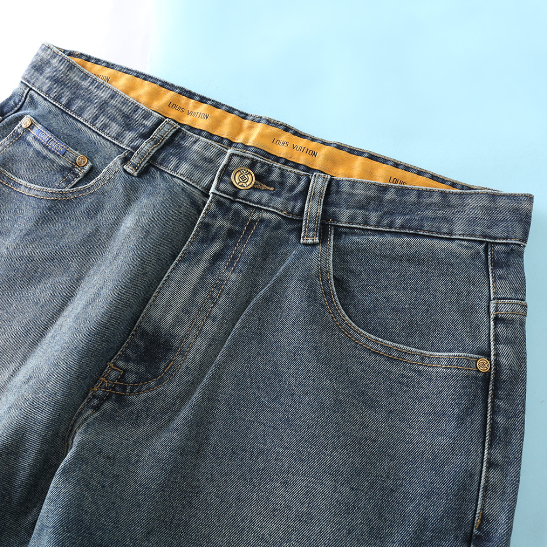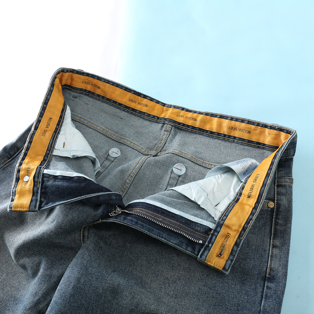 LV 2025AW early autumn men's jeans. Classic clover embossing, retro blue wash. Custom denim, straight cut. Sizes 29-40.