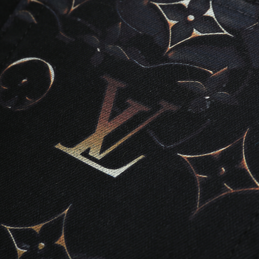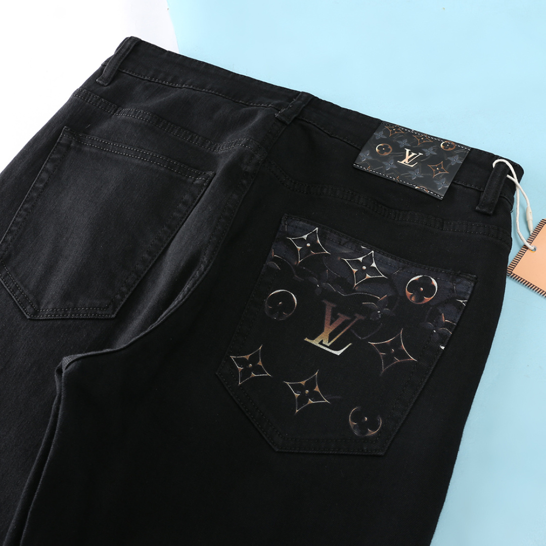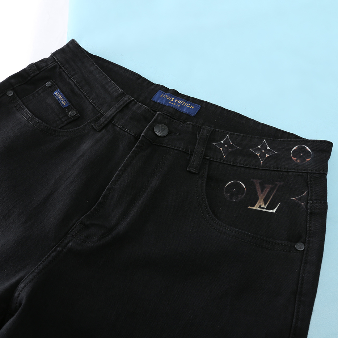 LV 2025AW men's black denim jeans with classic Monogram print. Imported cotton blend, elastic, retains shape. Sizes 29-42.