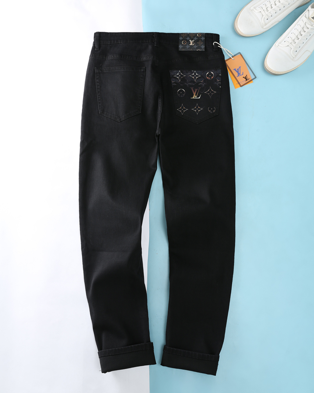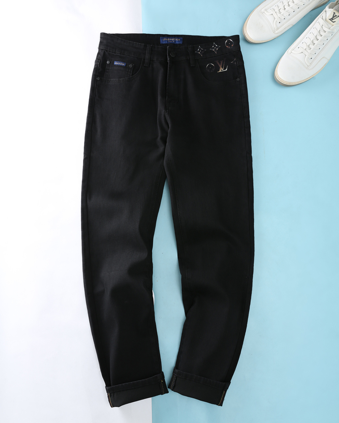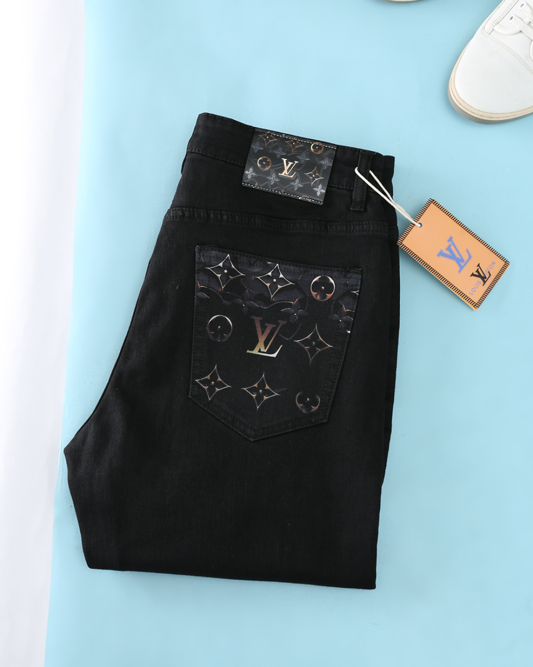 LV 2025AW men's black denim jeans with classic Monogram print. Imported cotton blend, elastic, retains shape. Sizes 29-42.